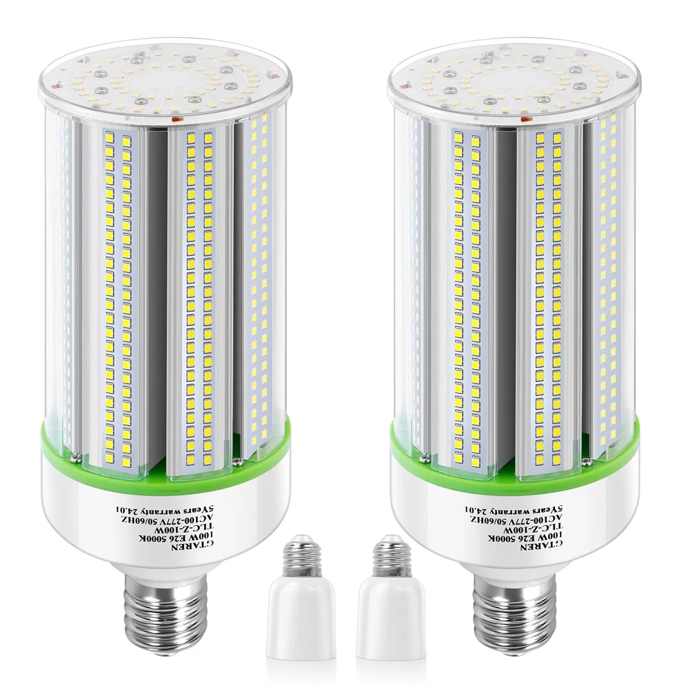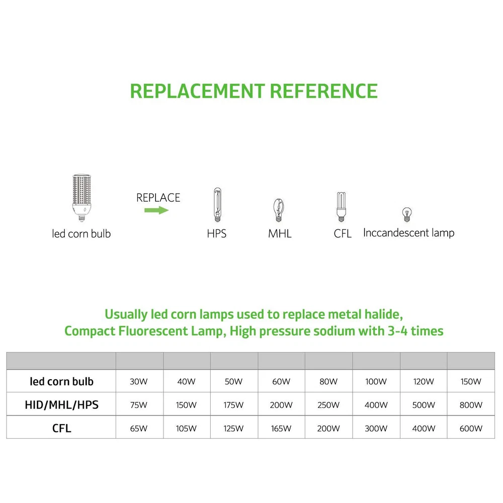 Specializing in high-quality LED replacement products in the past decade, we have more than 40 products. In addition, with improved production equipment, we can independently produce LED radiator, LED power supply and LED lamp plastic parts The LED corn lamp certified by FCC can beused to replace 70W, 100W, 150W, 175W, 200W, 250W, 320W, 400W and 600W 800w 1000w metal halide lamp (MHL),high intensity discharge bulb (HID), high pressure sodium bulb(HPS), incandescent bulb and Compact Fluorescent bulb(CFL ) perfectly. Besides, LED corn Bulb is widely used in outdoor lighting,warehouse lighting,street lighting, high-bay & low-bay LED lighting LED flood lighting, industrial spaces lighting ,garage lighting ,commercial lighting, shopping lighting and parking lot lighting,factory lighting, wall pack lighting,area lighting ,driveway lighting,post top lighting,barn lighting ,patio lighting , courtyard lighting,garden lighting ,canopy lighting projects and so on. It not only has strong lightness, but alsois high-efficiency. In addition, we provide five-year warranty With it, let us do energy conservation together Specification: CRI: >80 PF: >0.9 THD: <20% Wattage: 60W Lumen Efficacy:130lm/w. LED Lamp:SMD2835LED Brightness:7800Lm Color Temperature: 5000 Kelvin LED Qty:396pcsSMD2835 Socket: E26/E39 Waterproof: IP60 EmittingAngle:360 degrees NOTICE: ● Make sure to remove or bypass the ballast in the fixtures before installing. Don't need ballast, just wire them directly. ● Suitable for use in enclosed luminaires, Please CONFIRM the installation size ● The input voltage and lamps should be matched(AC110V-277V) ● Suitable for damp locations(Do not use withdimmers) In the Box: LED Corn Light+E39 or E26 Adapter