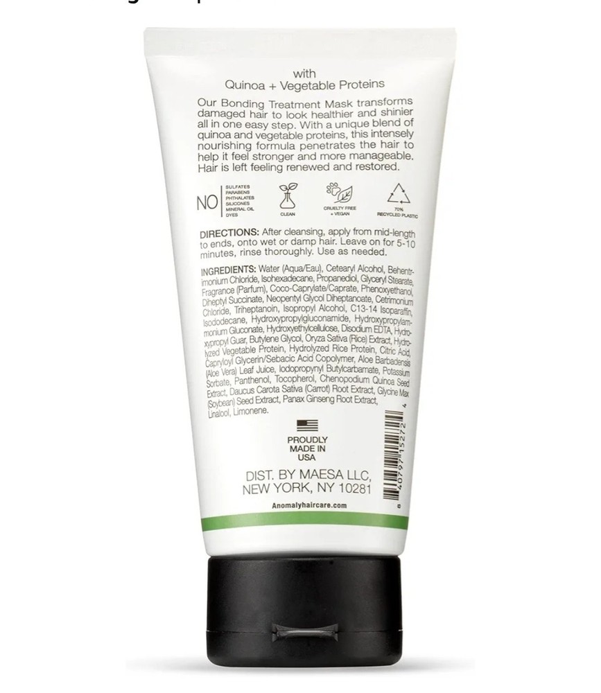 2 x Anomaly Bonding Treatment Mask 5fl Oz Quinoa & Vegetable Proteins. Anomaly Bonding Treatment Mask 5fl Oz BNIB • Our deep conditioning Bonding Treatment hair mask helps revitalize dry, damaged hair, delivering healthier, shiny tresses in one easy step. This intensely nourishing formula helps hair feel stronger. • Formulated with quinoa—high in vitamins & minerals known to help strengthen & protect—& a blend of hydrating vegetable proteins, this hair mask is ideal for dry, damaged, & chemically treated hair. • Our paraben-free, phthalate-free, sulfate-free, eco-friendly shampoo, conditioner, hair masks, & hair styling products are 100% clean, vegan, cruelty-free, & contain no SLS, SLES, or mineral oils. • The future of hair care & beauty products is purposeful sustainability. Our bottles, tubes, & cans use recycled plastic & aluminum that has been diverted from landfills. All packaging is 100% recyclable. • 2022 Allure Best of Beauty Award Winner BNIB #anomaly #bondingtreatmentment #hair #hairmask #hairrepair #nourishing #build #strengthen #Quinoa #bundle #hair #repair
