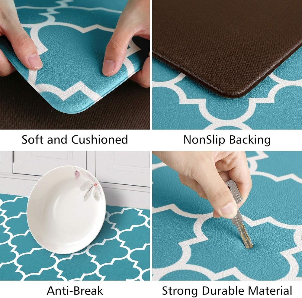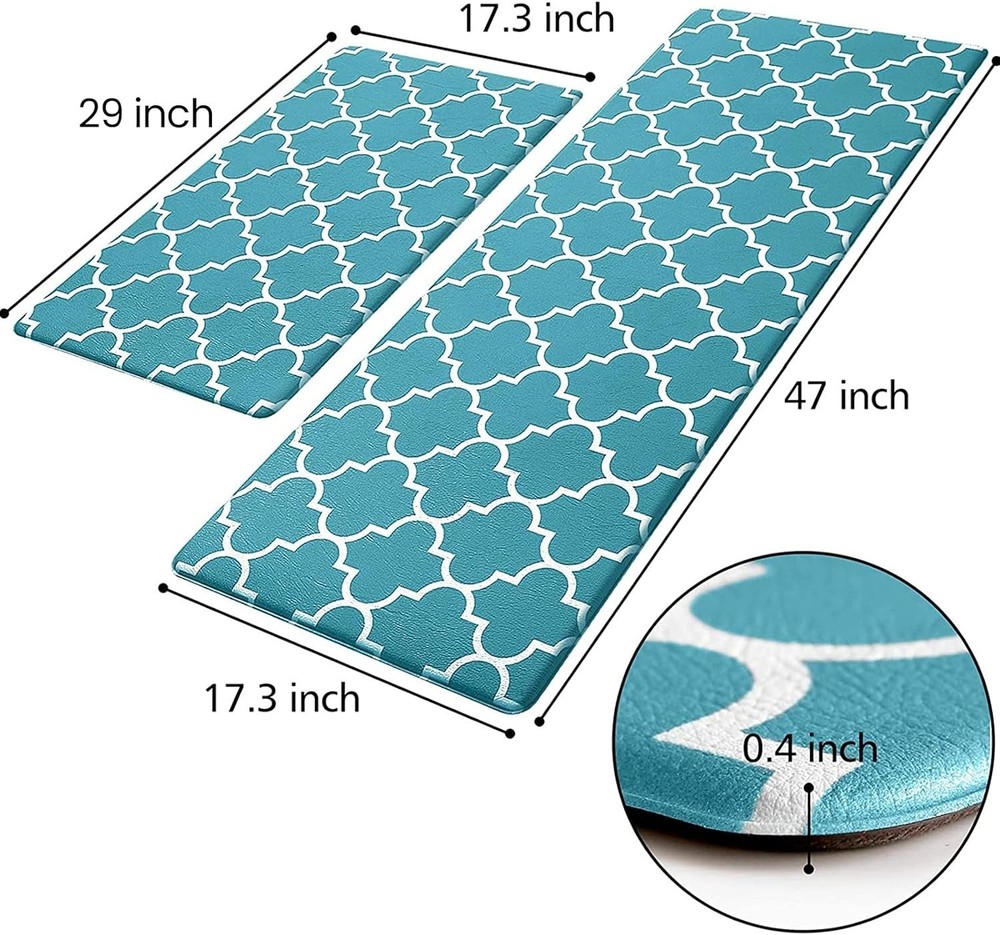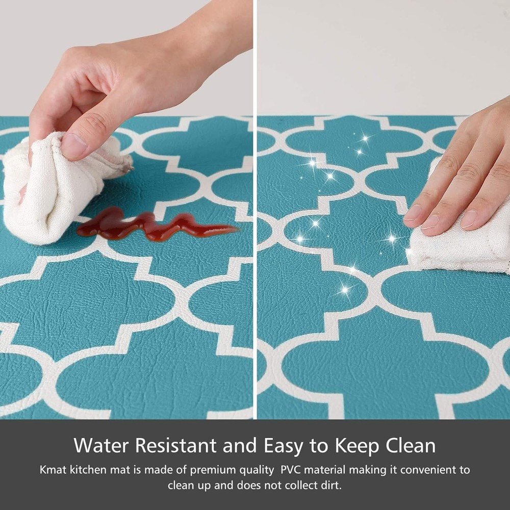 Color Green Brand Branded Special Feature Heavy Duty, Anti-slip, Water Resistant Product Care Instructions Wipe with Damp Cloth Manufacturer KMAT Material Polyvinyl Chloride (PVC) Shape Runner, Rectangular About this item COMFORTABLE:The KMAT anti-fatigue kitchen mats are ergonomically engineered,extra thick mat provides comfortable support to help improve circulation and posture and to ensure that you are able to stand comfortably while working in the kitchen; ANTI-SLIP:The top of the anti-fatigue mat is designed with an attractive texture while the bottom is made of a non-slip material;The memory foam kitchen floor mat may be used on multiple surfaces (tile, wood, ceramic, marble, etc);Rug must be placed on dry surface during use; EASY TO CLEAN:Our non skid washable kitchen mats and rugs are easily cleaned; simply wipe dirt off with a damp cloth or use a hand-held vacuum as needed; The waterproof surface ensures long-term durability; VERSATILITY:The anti-fatigue mat provides an extra large area for standing in laundry room, kitchen, office, farmhouse,in front of sink or any other high-traffic indoor or outdoor space; PERFECT SIZE & MATERIAL:The set contains 2 rectangular mats (17.3 x 47 inches and 17.3 x 29inches); The KMAT kitchen mats are constructed with premium strength material to ensure that the mats will keep their shape, even with extended and heavy use.