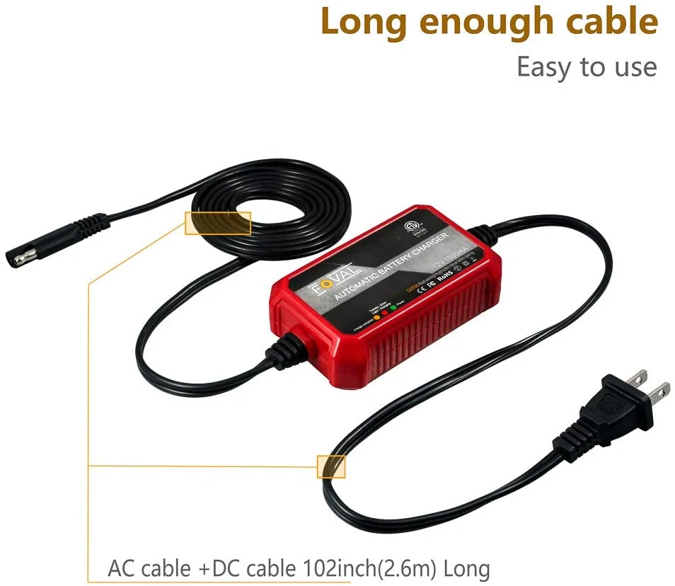 Automatic Battery Charger & Maintainer: 1A 12V smart battery charger perfect for SLA / VRLA / GEL CELL / AGM / WET lead acid batteries. It is a battery maintainer, trickle charger, float charger, and battery desulfator, also complete 4-step charging program (Initialization, Bulk Charge, Absorption Mode, Float Mode). Ultra Compact & Practical: The battery charger is compact and lightweight like the phone, long enough ac cable+ dc cable 102inch long, two types of dc output cable with either the ring or alligator connectors to use. 3.9 x 2.4 x 1.25inchs, 10.5oz. Widely Compatible: Perfect suitable for cars, golf cars, motorcycles, scooters, lawn mowers, ATVs, UTVs, tractors, trucks, SUVs, RVs, boats, PWCs, jet skis, snowmobiles, classic cars, children's toys and more. automatically switches to float, maintenance voltage after fully charging the battery. Intuitive led indicators provide visual state-of-charge feedback and diagnostic information, green is power light; green with red means charging; green with yellow means fully charged. Multi Safety Protections: Safely charged avoid overcharge in hot climates and under-charging in cold climates. Built in circuit protection guards against reverse polarity, over-current, overload protection, over-voltage and more protection. Adopt ABS flame-retardant shell, fireproof, electric shock. Our safe and advanced charging technology automatically Robust Quality and Service: Choose FOVAL car battery charger. We provide 18 months warranty and after-sale customer service support to make you 100% satisfied. If our product did not meet your expectation, please be free to contact us anytime. Product Description FOVAL is a reliable brand that specializing in the automotive accessories products, Such as battery chargers, car inverter, digital tire pressure gauge and more. All the products are designed and sold directly by FOVAL. We dedicated to offer our customer the best service. [2pack] Foval 1000mA 12V Automatic Trickle Battery Charger for Car Motorcycle Lawn Mower SLA AGM GEL CELL WET Lead Acid Batteries 1000mA 12V Sealed Lead Acid Car Battery Charger Four Charge ModeBest Choice for Car Motorcycle Lawn Mower SLA AGM GEL CELL WET Lead Acid Batteries Two Types of Cable DC Output Cable with Clip Connectors DC Output Cable with Ring Connectors Quick Disconnect Harness Connect and disconnect the charger with the battery easily Specifications: 1000mA Automatic Battery Charger Input: 100-240V / 1A 47-63HZ Output: 12V / 1A Supply Mode: Work as a 12V power supply What’s in The Box: 2 x Sealed Lead Acid Car Battery Charger 2 x AC Power Cord 2 x DC Output Cable with Clip Connectors 2 x DC Output Cable with Ring Connectors 1 x User Guide Complete 4-Step Charging Program Intelligent Charging itialization- Detects battery sulfation or severe discharge. Bulk Charge - Using highest rated current Absorption Mode - Till its full capacity without overheating. Float Mode - Maintain the battery through pulse charging. Suitable for All Vehicles With detachable alligator and ring connectors, the charger is good for all types of vehicles with a 12V battery. Use it to power up the fully drained acid batteries on your car, lawn tractor, scooter, bike, boat, camper, jetski, Skiidoo, lawn mower automobiles, motorcycles, ATVs, personal watercraft, RVs, boats, airplanes, golf carts, back-up generator systems and etc. instead of replacing them. Go easy on your wallet and the environment. ISM Adaptive Charging ISM (Infinite Sequential Monitoring) adapts to the battery’s needs hundreds of times per second. Sparkproof Foval battery charger checks for a correct connection before giving power. Quick Disconnect Harness Connect and disconnect foval trickle battery charger in seconds. Connect and Forget It Once connected, the foval trickle charger manages your battery’s health on it’s own. Safer and Smarter Charging Smart circuits engineered with multi-level protections guard against reverse polarity, short circuit, overcurrent and overvoltage to maximally protect your car battery.