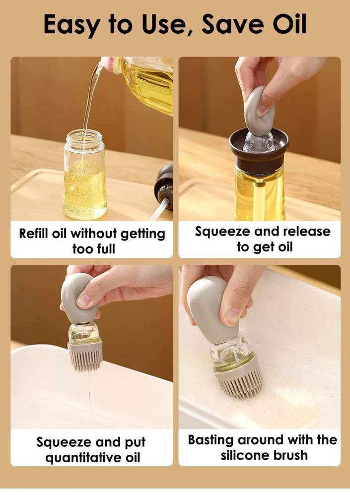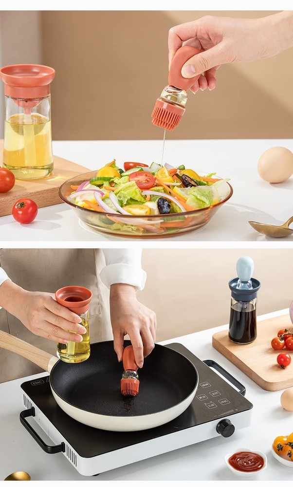 Main Features 1.2 IN 1 design makes the oil dispenser can dispensing oil and basting . 2.Glass bottle with anti-skip bottom. 3.With funnel cap allows the brush hanging dry, and fill oil directly without take out the cap. Widely Applicable - The oil dispenser bottle is suitable for various oil, vinegar or sauce. Perfect fit for outdoor barbecue, frying pan, air fryer. Unique 2 in 1 Design : The oil dispenser contain dropper and basting brush which are made of food-grade silicone, the three-layer short-bristle brush has no peculiar smell, no deformation, no hair loss, and a heat-resistant temperature of up to 250°C. The silicone dropper allows dispensing oil slowly, durable and BPA free Easy to Use : The glass oil dispenser bottle has wide mouth bottle, so you can easily fill oil, vinegar, sauce, chili oil, etc. The olive oil dispenser with brush can be used for cooking, baking, frying, storage. It is convenient to carry for outdoor picnics Control the Amount of Oil : Just a slight pinch, you can quickly suck up oil, and the scale allows you to control the quantitative of oil output for dieter's weight loss plan. Moreover, the design of the oil return hole also avoids waste and overflow, while also ensuring the cleanliness of the table Easy to Clean : Each part can be disassembled and cleaned separately, and the dispenser is easy to install. The brush can also be used alone, and it is very convenient to apply ketchup, chocolate sauce, and peanut butter 2 Pack for More Economical : Size is 18 x 6.45 cm, capacity is 180 ml / 6 oz. There are 2 Pack oil dispensers with brush in the package which is money save for you