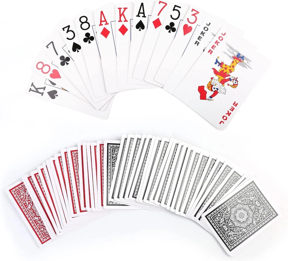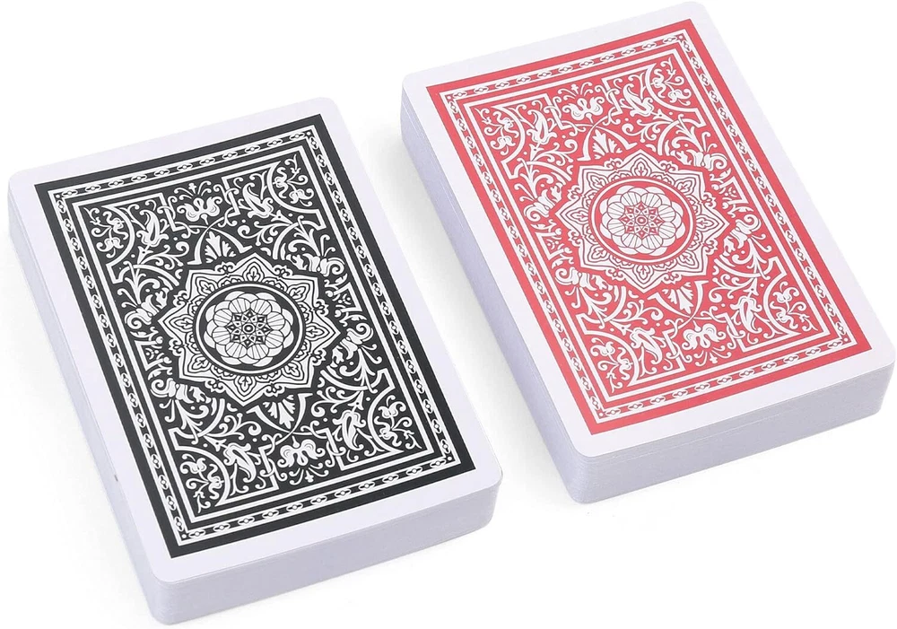 Jumbo index playing cards are super-indexed, big-faced and large-numbered, easy to see, helpful to players with imperfect eyesight, and favored by seniors Plastic-coated decks of cards for a smooth feel and extra durability, easy to shuffle; made from paper stock; linen finish for better handle; blue core sandwich construction for professional game play, nearly Casino Grade Playing cards are great for many card games: Texas Hold'em, Blackjack, Pinochle, Euchre, Bridge, Canasta, Go fish, Poker, Hearts, Baccarat and more 2 Decks playing cards: red and black backing; each deck contains 52 suited cards and 2 jokers Poker size (wide size) cards measure 2.5" x 3.5"; This is regular playing cards. If you play pinochle game, just pick out two copies of 9,10, J, Q, K, A cards of all four suits and remove unneeded cards. Product Description Jumbo Index Playing Cards If you have to strain to see the small print on standard index cards, then Jumbo Index is good choice for you. Jumbo index means the ranks, and suit symbols are printed larger on the cards than standard index. The card size is same with traditional card, measures 2.5" x 3.5". Super Index Playing Cards are easier to see from far away, especially great for Texas Hold'em, which requires you to hold few playing cards in your hand, and relies heavily on community cards for all the players crowded around the table to see. Jumbo Index is also suitable for players with imperfect eyesight, and favored by seniors. LotFancy Playing Cards LotFancy Playing Cards are made from paper, coated with a layer of plastic, to make slick, durable and flexible. These cards have excellent quality graphics, shuffle easily and feel very substantial. Blue core sandwich construction prevents from cheat, nearly Casino Grade, great for professional game play. Jumbo-indexed playing cards feature classic red and black suits, super-index, and big-face, available in both black and red card backs. Each deck includes 52 suited cards and 2 jokers. You will love it ! Playing cards are one of favorite items for party, travel and camping to kill time with friends and family, perfect for Poker Night and Casino Party. Whatever you play texas, poker, bridge, euchre, canasta, hearts, go fish, pinochle and other different variations of solitaire, even practice card sleights or cardistry, LotFancy playing cards can satisfy all your need. Specification Quantity: 12 Decks or 2 Decks Color: red; black Card size: 2.5” x 3.5” (63mm x 88mm) Index: jumbo size