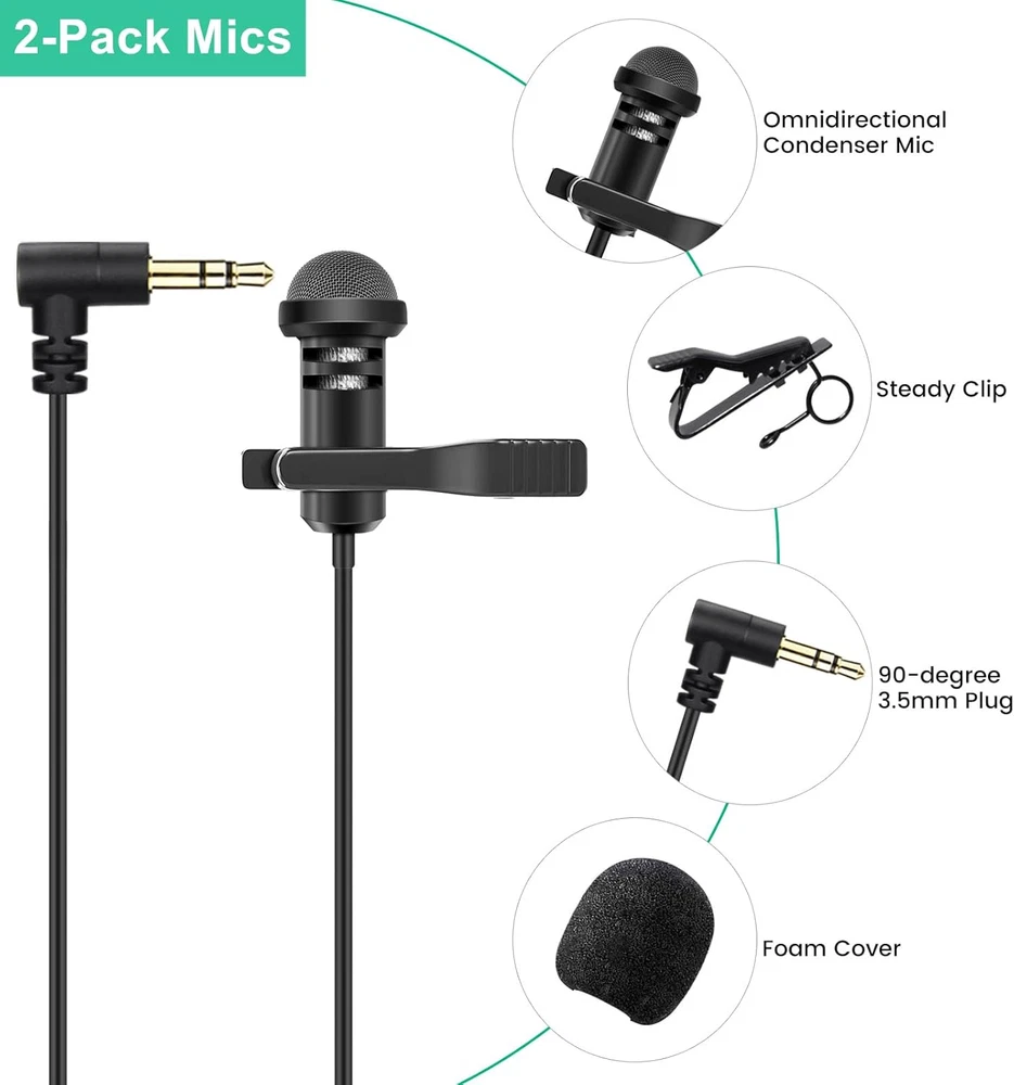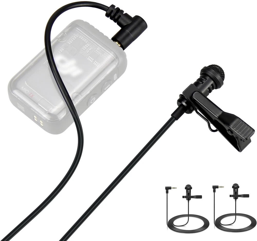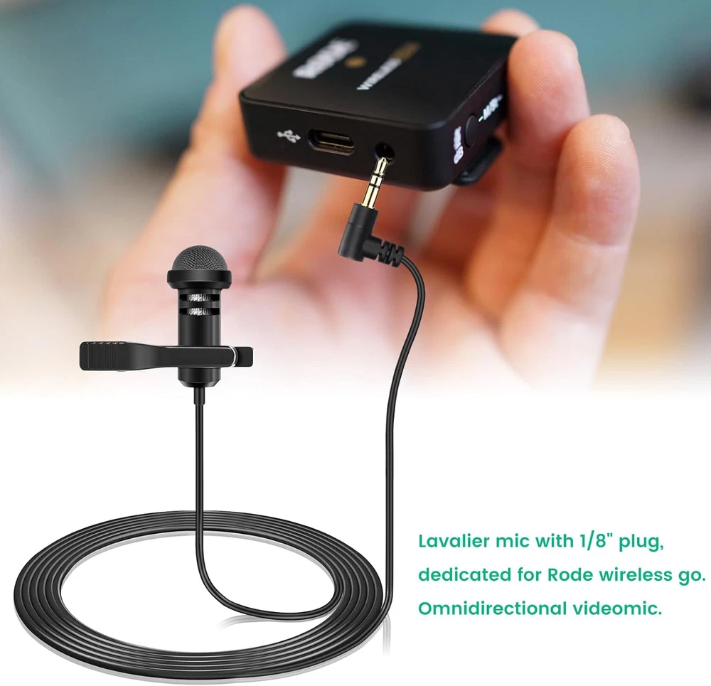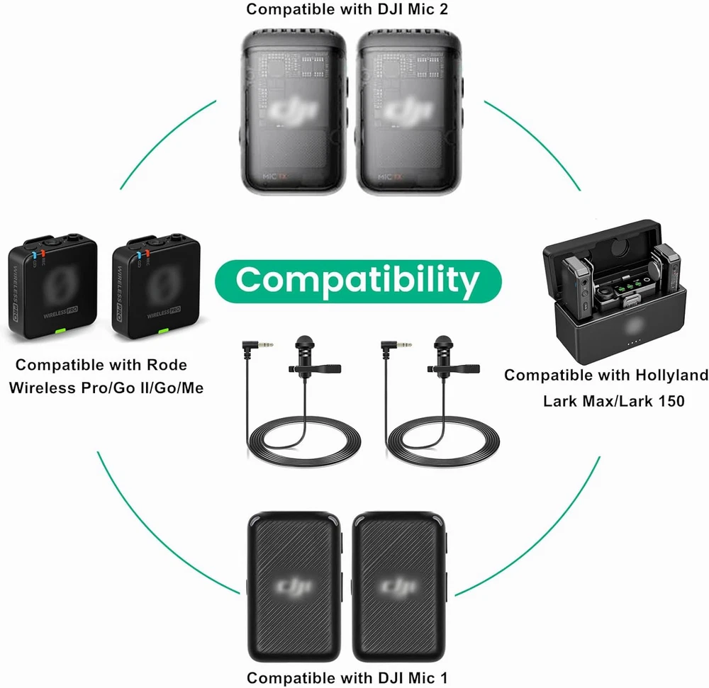 Lavalier microphone compatible with DJI mic 2 and mic 1 wireless microphone system bodypack transmitters(tx); Also compatible with Rode wireless go ii / 2, wireless go, wireless me, and wireless pro microphone system bodypack transmitters(tx); And compatible with Hollyland Lark Max, Lark 150 wireless microphone system bodypack transmitters(tx) Conveniently using for interview, vlog, stage, presenters, interviwers, broadcasters, lecturers, fitness instructor and any other applications requiring minimum microphone visibility with maximum comfortability operation Omnidirectional condenser microphone, less noise, voice clarity, high sensitivity, more flexible, better for picking up voice Black, 1.5 meters / 5 feet, compact and portable, small enough where it can be easily hidden under the talent's clothing and not be noticeable; High quality windscreen foam cover, keeps your microphone safe from harmful, dust, moisture, corrosion 3.5mm male 90 degrees l-shaped plug, right angle, easier to plug in and plug out; 3 poles TRS gold-plated tip, better surface and less resistance Omnidirectional condenser lavalier lapel microphone, professional vocal pickup condenser mic, used for wireless microphone bodypack transmitters. With 1/8"(3.5mm) golden-plated connector (3 poles tips, TRS) and windscreen foam cover. Features: Connector:3.5mm Plug Polar Pattern:Omnidirectional Cable Length:5 feet / 1.5 meters Products include: 2 x Lav Microphones 2 x Windscreen Foams