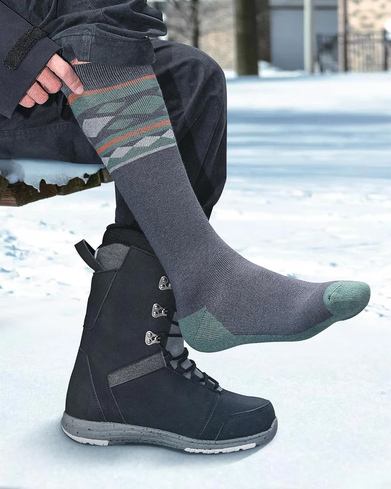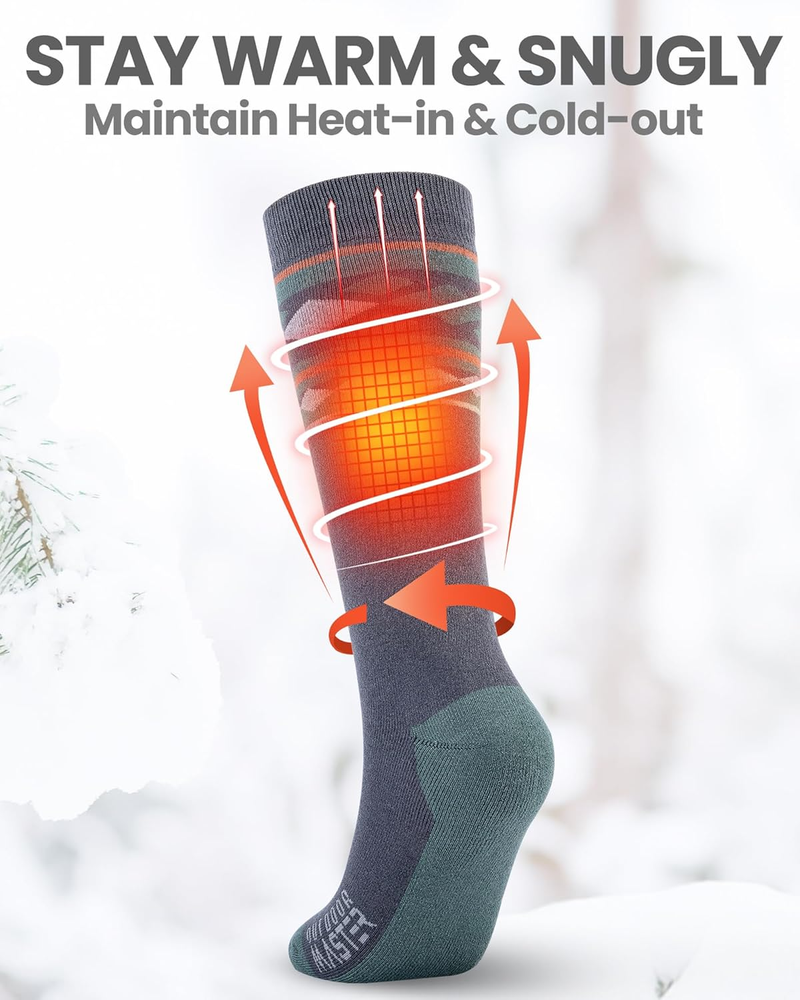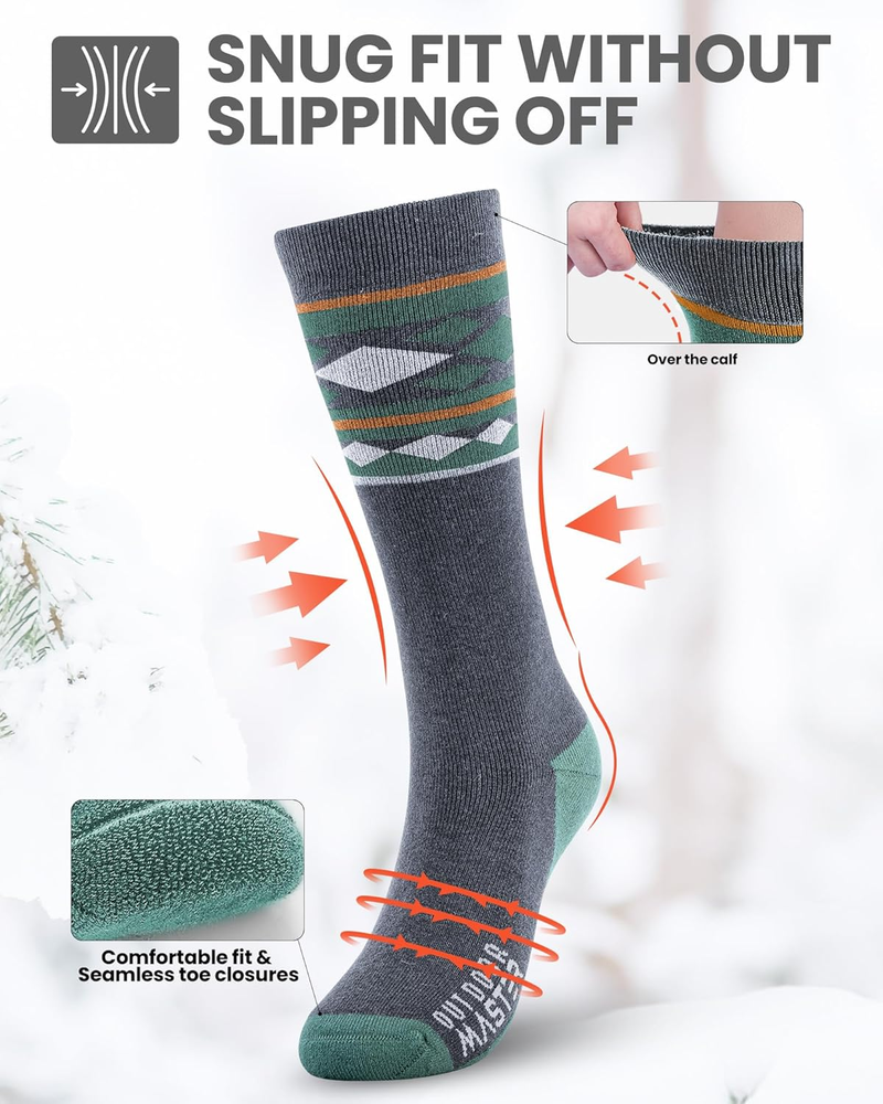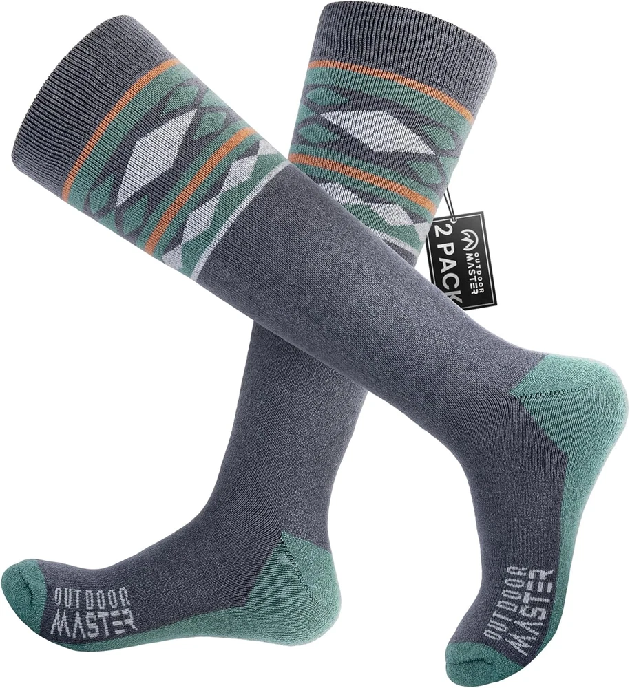 BREATHABLE, WARM & COMFORTABLE Made in a wide range in sizes of a Merino Wool blend that is LIGHTWEIGHT, BREATHABLE and PREVENTS build-up of SMELL. It also helps keep feet dry due to it's moisture wicking properties. OVER CALF DESIGN High calf design & elasticity for the ULTIMATE COMFORTABLE FIT. Perfect for skiing, snowboarding and other snow sports. STAYS UP Equipped with NON-SLIP CUFF that ensures that the sock stays up. Socks slipping down in the boots is a thing of the past! ITCH-FREE, MADE TO LAST, EASY TO WASH & BEAUTIFUL PACKAGE BAG Have an itch-free time out in the snow with this high quality merino wool blend. And afterwards, enjoy great MACHINE WASHABLE quality that is made to last. The package bag makes them a perfect gift item! Make sure that your kids feet are comfortable, warm and dry when out in the snow. The merino wool blend of these socks ensures a comfortable, itch-free, fun time. Specifications Sizes: M/L fits: Men 6-11 Women 6.5-12 L/XL fits: Men 11.5-15 Women: 12.5-16 Material: 30% Merino Wool 35% Acrylic 20% Nylon 6% Polyester 6% Elastane 3% Rubber Package Includes: 2 pair OutdoorMaster Adult Ski Socks