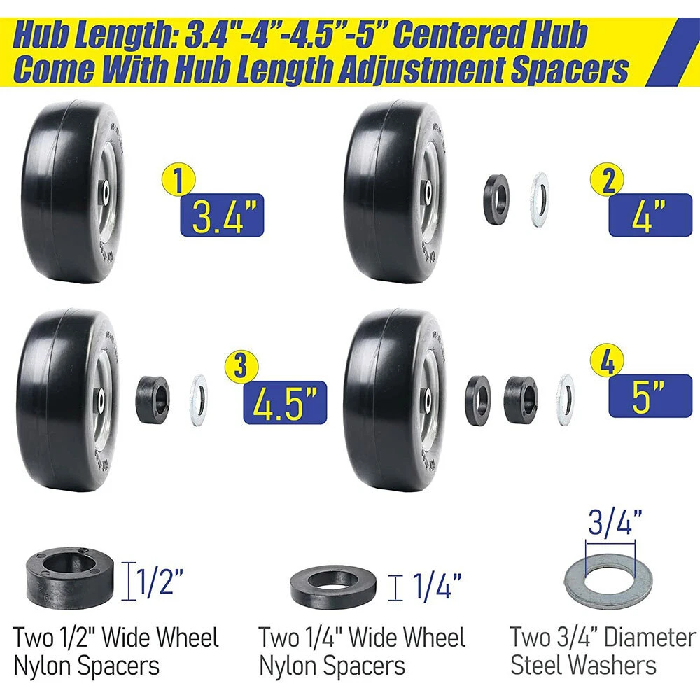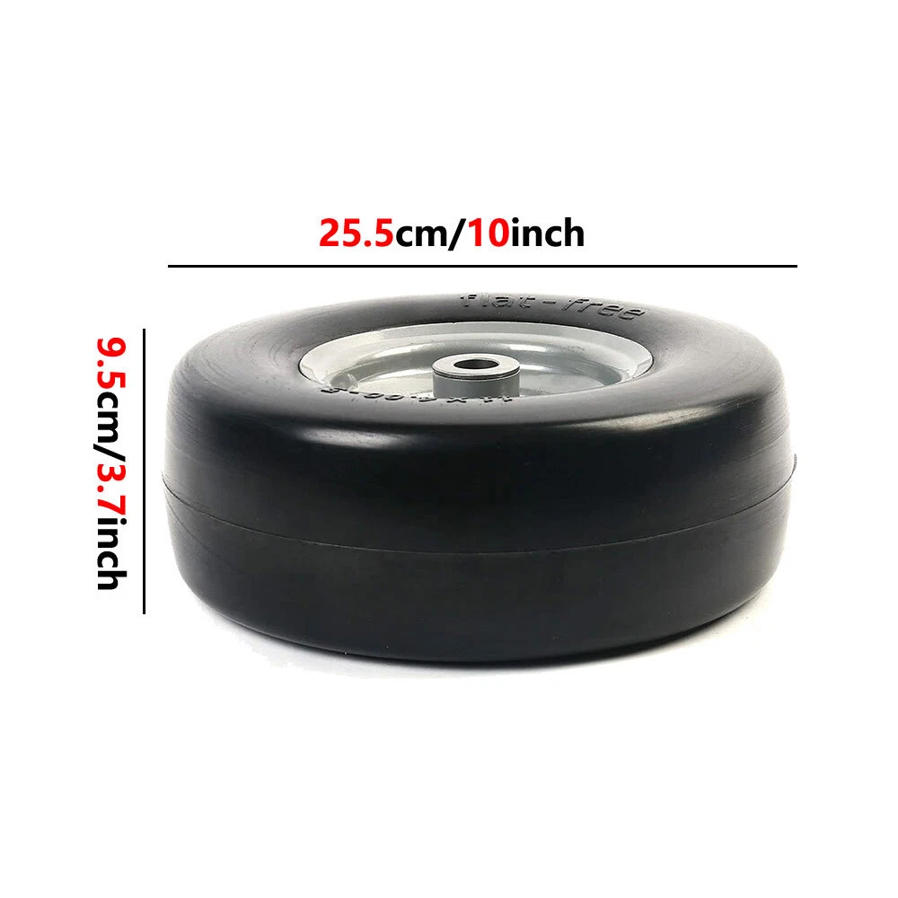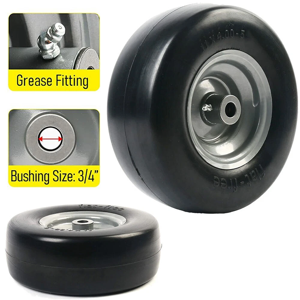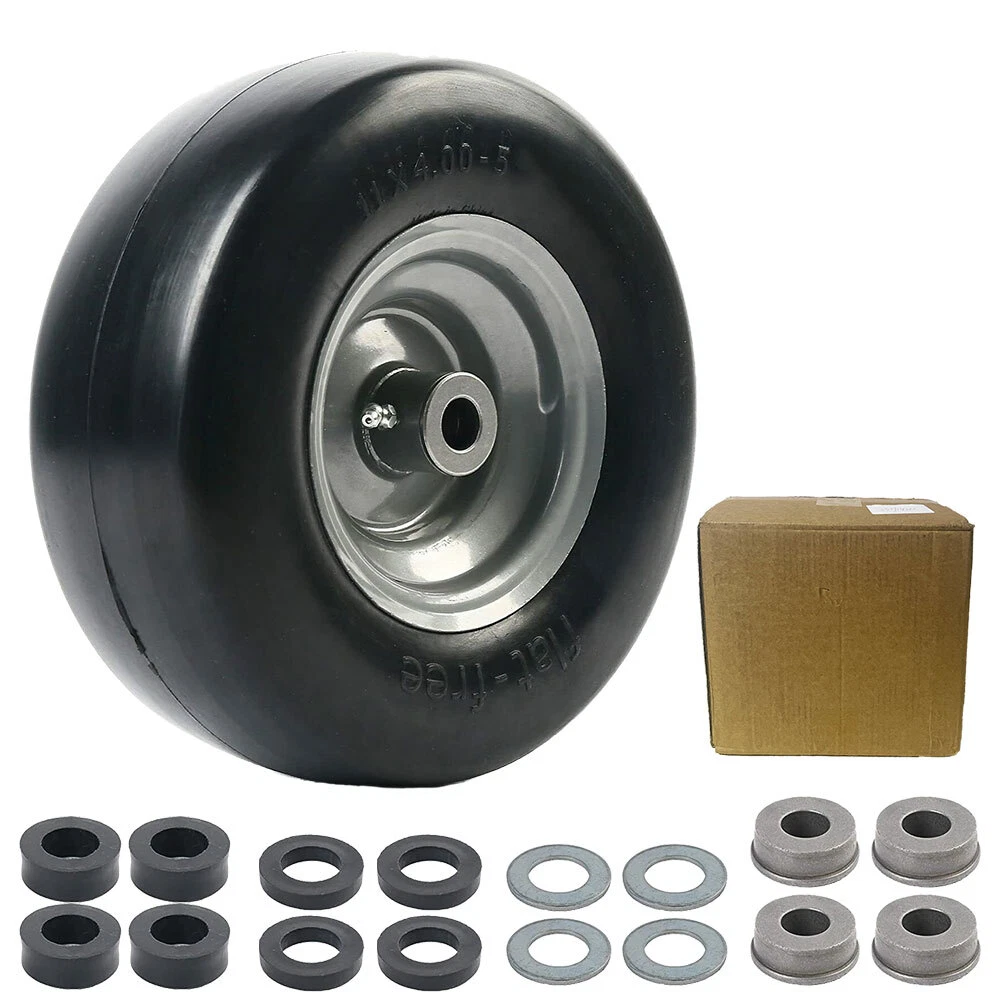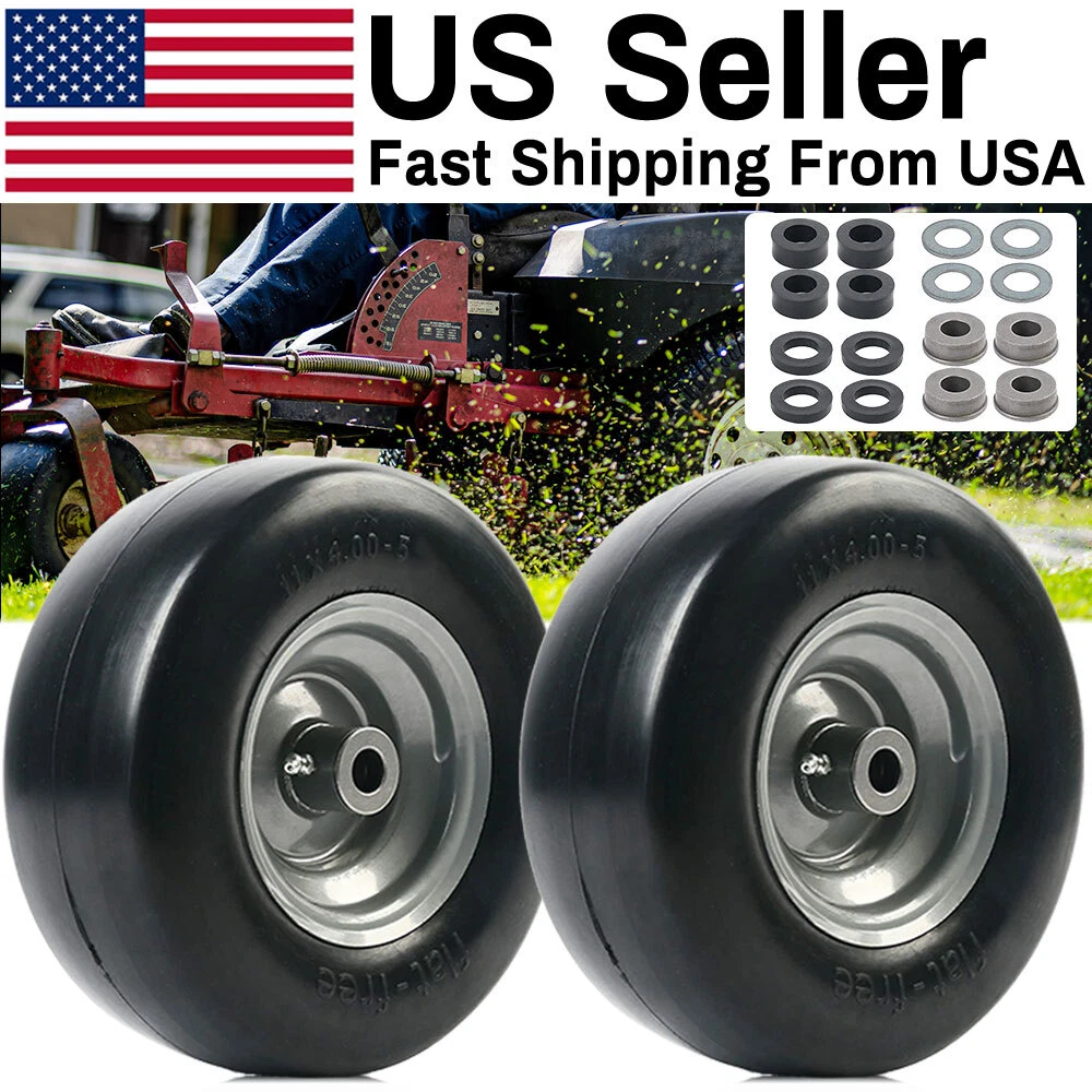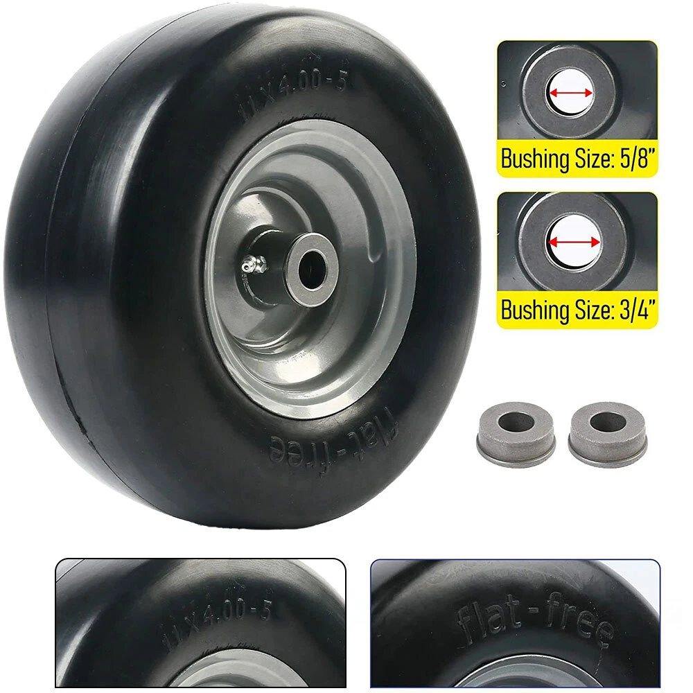 Specification: 11x4.00-5” Tire diameter: 11" Tire width: 4” Rim Diameter: 5" Bearing size: 3/4" and 5/8” as you need Hub Length: 5" Centered Hub Fits many zero-turn mowers 300 lbs load capacity. Not for highway use. NOTE: Please check your existing tire sidewall for tire, hub, and bearing size to ensure proper replacement fit. Tire Diameter Tire Diameter: 11.00 inch Flat Free Tires Tire Width Tire Width: 4.00 inch Rim Diameter: 5.00 inch Fits many zero-turn lawnmowers This lawn mower tire is widely used on wheelbarrows, garden carts, hand trucks, pressure washers, generators, air compressors, lawn mowers and other types of outdoor power equipment How To Change Tire Bearings You Will Need: Hammer, Screwdriver Block of Wood, Replacement Bearings 2Packs 11x4.00-5” Lawn Mower Tire on Wheel Flat Free Smooth Tread Tire Zero Turn Specification: 11x4.00-5” Tire diameter: 11" Tire width: 4” Rim Diameter: 6" Bushing Size: 3/4" or 5/8" Hub Length: 3.4"-4"-4.5"-5" Centered Hub Fits many zero-turn mowers 300 lbs load capacity. Not for highway use. NOTE: Please check your existing tire sidewall for tire, hub, and bearing size to ensure proper replacement fit. Tire Diameter Tire Diameter: 11.00 inch Flat Free Tires Tire Width Tire Width: 4.00 inch Rim Diameter: 6.00 inch Bushing -Measure inside diameter of the opening Bushing Size:3/4” or 5/8" NOTE: Please carefully confirm the bearing size before installation. Hub Length -Through the center of the hub Hub Length: 3.4 inch Centered Hub Fits many zero-turn lawnmowers This lawn mower tire is widely used on wheelbarrows, garden carts, hand trucks, pressure washers, generators, air compressors, lawn mowers and other types of outdoor power equipment How To Change Tire Bearings You Will Need: Hammer, Screwdriver Block of Wood, Replacement Bearings Step One: Prop the tire up to allow room for the bearings to be removed from the hub. Step Two: Place the screwdriver through the bearing hole until it hits the backside of the bearing on the opposite side. Step Three: Hit the top of the screwdriver with a hammer until the bearing pops out into the bucket below. Step Four: To reinstall bearings, rest the new bearing on the opening in the hub and place the block of wood on top of the bearing to avoid hitting the bearing directly. Step Five: Hammer directly onto the block of wood to get the bearing in the hub. Note: If the bearing drops freely into the hub prior to hitting with a hammer, remove the bearings and tap gently along the edge of the hub to create a tighter fit for the bearing. Payment Shipping Feedback About us Contact us Payment 1. We accept PayPal,G Pay Credit Card,Visa ,etc. payment . 2. Please do not include your PO BOX address, or eBay system won't allow you to make the payment. 3. Please make payment within 7 days after placing an order, or eBay will automatically open an unpaid case on the eighth day. 4. You can contact us for sure if you want to cancel the order to avoid the unpaid case. Shipping 1. All orders ship within 24 hours after receiving your payment. 2. Tracking information will be sent to the buyer once we get the tracking number. 3. We only ship to eBay or PayPal address. PO. BOX Not Acceptable. 4. If you want us to ship to a different address, please contact us via eBay message after placing your order Feedback 1. We are really appreciated that all the customers can give us 5-star positive feedback. It will encourage us doing better, no matter the quality of the products or after sale service. We are learning more. 2. Please don't give us neutral and negative feedback before contacting us. Don't forget that good communication can solve all problems. Any questions, please feel free to send message to us first. We are always here to help you. Thank you very much. About us Welcome to our store! We supply many products including computers accessories, health & beauty , phone accessories, car accessories & Consumer Electronics, Pet accessories ,High product quality, reasonable prices, excellent customer service and a reliable credit standing is our tenet. Thank you for shopping at our eBay Store. Contact us 1. ALL replies will be sent to your email, if you don't get response within 1-2 business days, pls check your My Messages in case your email provider has an overly-aggressive spam filterblocking eBay's emails. Please email us AGAIN. 2. Email is the priority of our customer service. On Dec 13, 2024 at 01:12:47 PST, seller added the following information: