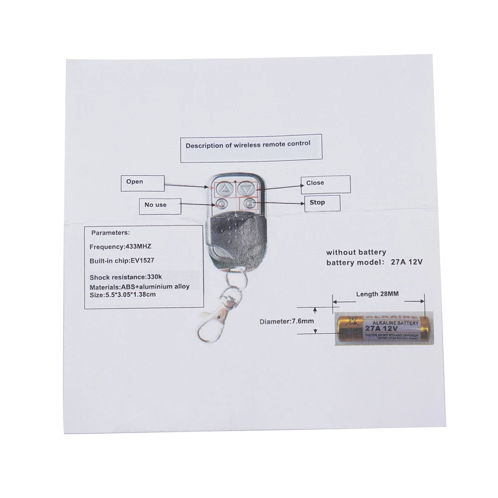 Description The remote control is made of high-quality plastic and zinc alloy for durability. The sleek edges and metal trim provide a stylish look. It has excellent details, a red indicator light that illuminates when in use, a stable and comfortable remote control button, a housing with sliding resistance, and includes a key fob. With this small and light remote control, you can free your hands and save more energy. Key Features Great Convenience: The remote control has four easy-to-use buttons for opening, closing and stopping. This allows you to open the door from a distance with one button. Great Durability: It is made of high-quality plastic and alaminium alloy material for durability. 2Pcs 433MHZ Wireless Remote Control Automatic Sliding Gate Opener Electric Roll Description The Remote Control Is Made of High-quality Plastic and Zinc Alloy for Durability. the Sleek Edges and Metal Trim Provide a Stylish Look. It Has Excellent Details, a Red Indicator Light That Illuminates When in Use, a Stable and Comfortable Remote Control Button, a Housing with Sliding Resistance, and Includes a Key Fob. with This Small and Light Remote Control, You Can Free Your Hands and save More Energy. Key Features Great Convenience : the Remote Control Has Four Easy-to-use Buttons for Opening, Closing and Stopping. This Allows You to Open the Door from a Distance with One Button. Great Durability : It Is Made of High-quality Plastic and Alaminium Alloy Material for Durability. You Don't Have to Worry About Frequent Use That May Cause Easy Damage to the Interior or Exterior of the Remote Control. Stylish Appearance : It Is Designed with Streamlined Edges and Metal Trim While Retaining the Color of the Metal Material. It Is Simple and Airy with a Sense of Style. Strong Shock Resistance : This Key Has an Impact Resistance of 330k. Normal Squeezing Will Not Easily Damage It. Wide Compatibility : the Key Is Suitable for All Kinds of Door Openers with 433mhz Frequency. It Is Compatible with Many Types of Sliding Door Switches. Highly Portable : It Measures Only 5.4*3*1.5cm. It Also Comes with a Keychain. It Is Not Only Small and Easy to Carry but Also Convenient to Hang on the Body so Not Easy to Lose. Good Performance : Its Keys Are Made of Aluminum Alloy with Smooth Surface and Also Have Oxidation Resistance. Therefore, It Is Not Easy to Reduce Its Sensitivity Due to Rusting Even After Long-term Use. High-quality Service : We Also Provide You with High-quality Pre-sales and After-sales Services for Free. If You Have Any Problem with Using It, Please Feel Free to Contact Us and We Will Try Our Best to Help You. Details A Non-slip Housing : It Is Equipped with a Non-slip Housing to Prevent You from Misuse. A Metal Keychain : It Comes with a Free Matching Keychain, Which You Can Hang on Your Bag or Clothes. This Way You Won't Worry About Losing It. Applications The Key Is Suitable for All Kinds of Door Openers with 433mhz Frequency. Specification Frequency: 433mhz Built-in Chip: Ev-1527 Shock Resistance: 330k Materials: Abs+Iron+Alaminium Alloy Product Size: 5.5*3.05*1.38cm/2.17*1.2*0.543inch Battery Model: 27a 12v (Not Included) Package Included 2x Remote Controls 1x English Instructions Note Battery Is Not Included. Please Allow a Slight Color Difference Due to Shooting Light, and 1-3cm Error Due to Manual Measurement, Please Make Sure You Don't Mind Before Ordering. This remote control is only suitable for the gate opener purchased from us This remote control is only suitable for the gate opener purchased from us Payment Delivery details Terms of sales About us Contact us Payment We accept ebay payment 。 Fees such as import duties, taxes are not included in the item price or shipping costs. These charges are the buyer's responsibility. Delivery details Shipping: 2-9 working days to: USA Terms of sales We maintain high standards of excellence and strive for hundred percent customer satisfaction. Feedback is very important to us. We hope that you contact us immediately before you give neutral or negative feedback, so that we can address your concerns. It is impossible to address issues if we do not know about them! About us Your satis faction is our ultimate goal. We work hard to earn your trust and future business. Our certified technicians have tested each item before shipping. The unit comes with 1 year limited warranty on all manufacturing defects. a) If you receive a defective item, you may return it or ask for a discount. Please contact us within 14 days after you receive the package. b) What you returned must be intact and in its original packaging as re? u. Customer is responsible for shipping costs of the returned item. c) We will cover the cost of shipping back t with the shipping rate indicated in the registration page. We will send you a new unit or refund the full payment you paid. Thank you. Contact us Business Hour Business Hour: Monday To Friday: 8:30 AM to 5:00 PM (Beijing China time) Due to time zones, our reply to your questions may not be immediately. But within above working time, we will reply your email within 24 hours. If it's non-workdays, please kindly be patient and wait till Monday. Please contact us with ebay message. Please feel free to contact us if you have any questions. Monday To Friday: 8:30 AM to 5:00 PM (Beijing China time) Due to time zones, our reply to your questions may not be immediately. But within above working time, we will reply your email within 24 hours. If it's non-workdays, please kindly be patient and wait till Monday. Please contact us with ebay message. Please feel free to contact us if you have any questions.
