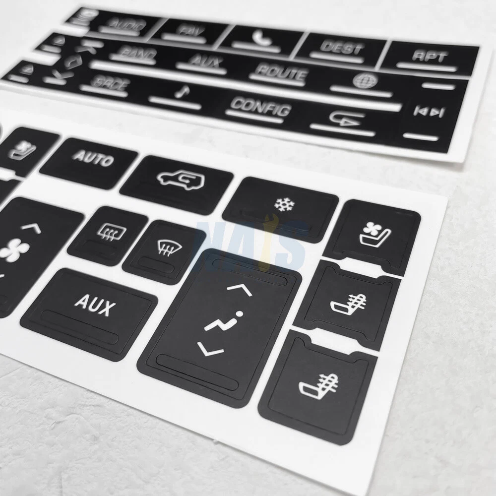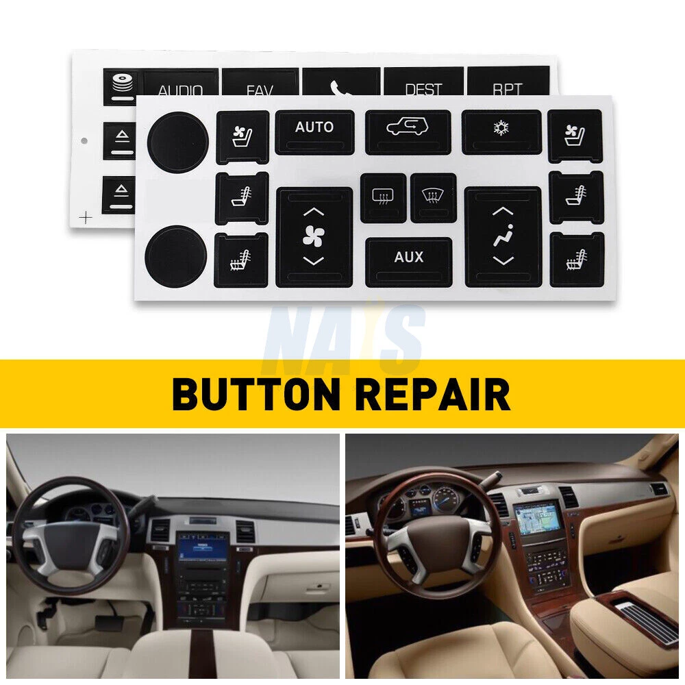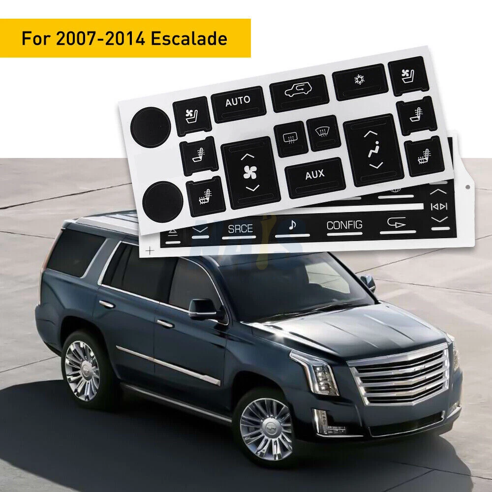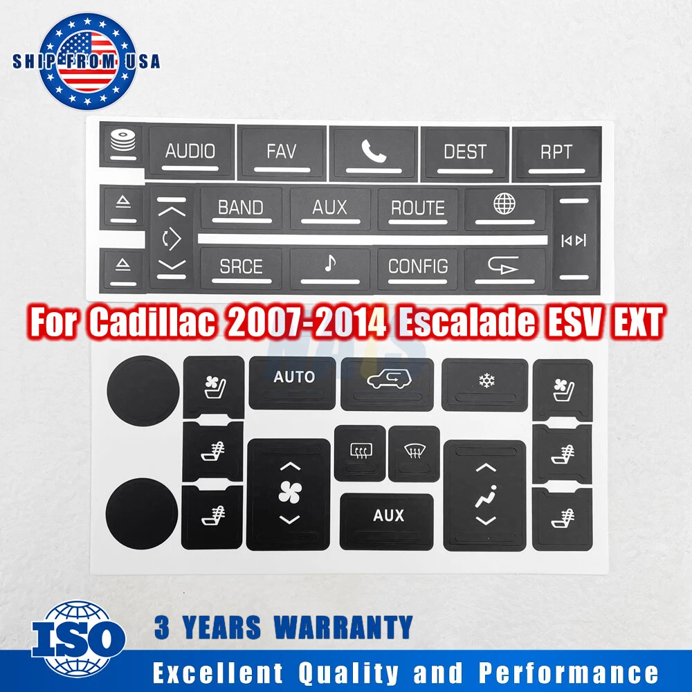 Fitment: For 2007-2014 Cadillac Escalade Package Include: 1Pc Navigation Radio Button Repair Decal 1Pc AC Climate Control Button Repair Decal Features: These overlays will adhere to the factory acrylic button, and with proper installation it's guaranteed against sun fade and pealing. Made from professional commercial grade plastic matte vinyl, with blacked film adhesive to dramatically reduce "light bleed through" which most other kits have a problem with. The decals also include small white icons and are also cut to allow factory lighting to come through your truck or SUV. Match your Climate Control/Radio Stereo unit with the product picture. Clean the surface of any dirt and oil. Apply each decal over the matching buttons. It's just that easy. Please Note: Please have the surface complete clean and dry first before applying this Slowly peel off the back sheet off the decal and apply to the correct place Do not use high pressure water gun to flush Contact us: Negative feedback will not help resolve any problems you have, please contact us via eBay messages before leaving negative feedback, our customer service will make best effort to help you with the issues. On Dec 2, 2024 at 20:14:38 PST, seller added the following information: