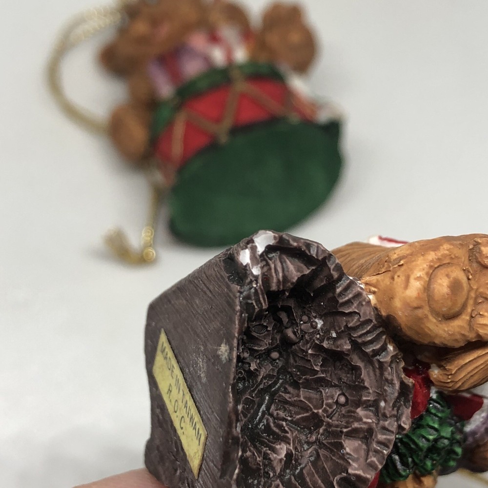These adorable bear ornaments are the perfect festive touch! The resin details are charming, with one bear on a drum and the other on a log next to a tiny tree. Even with the small nick (clearly shown in pics), they’re still super cute and great for gifting or adding holiday cheer to your tree!