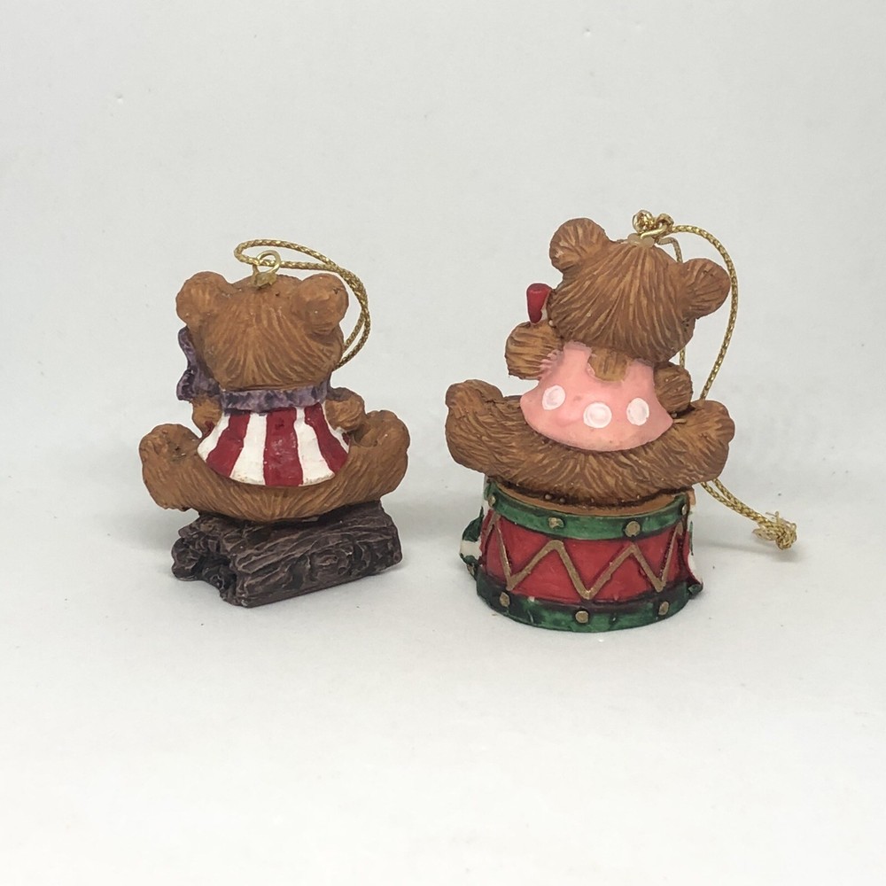 Set Of 2 Bear Christmas Ornament Sitting On Drum & Log With Tree 2” Resin! Note: One of the ornaments has a nick on the bottom edge; shown in photos! Thank you for stopping by!