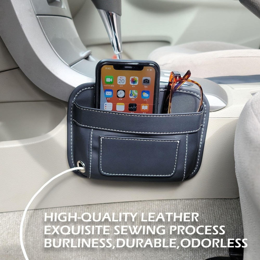 About this item đ»ăCar side pocketăVery convenient for extra space for little things; easy to reposition, compact yet loose enough to slide your phone with wallet in and out while driving. đ»ăNice little pocketsăThe black synthetic leather complements the carâs interior perfectly. The pocket organizer is made of high-quality PU leather with a soft and comfortable surface, waterproof and non-scratching. đ»ăGood adhesive and fits wellăDouble-sided Velcro for sticking on hard surfaces, or use single side for carpeted areas; very handy for cell phones. This extra pocket can be placed anywhere there's a flat surface to stick it, making a significant difference in convenience. đ»ăAdhesive Is Secure to CarăSticks without leaving any trace and wonât damage the car, staying securely in place. This little pocket organizer is very handy for cell phones. đ»ăOrganizers and seat gap fillers with storageăThis little pocket organizer is made of high-quality PU leather with a soft and comfortable surface, waterproof, and non-scratching. Truly life-changing. No more fallen phones or objects while driving, which tend to disappear forever in the abyss under the seat. It will make you a much safer and less distracted driver, keeping everything neat and tidy. Dimensions: 5 x 7 x 5.1 inches.