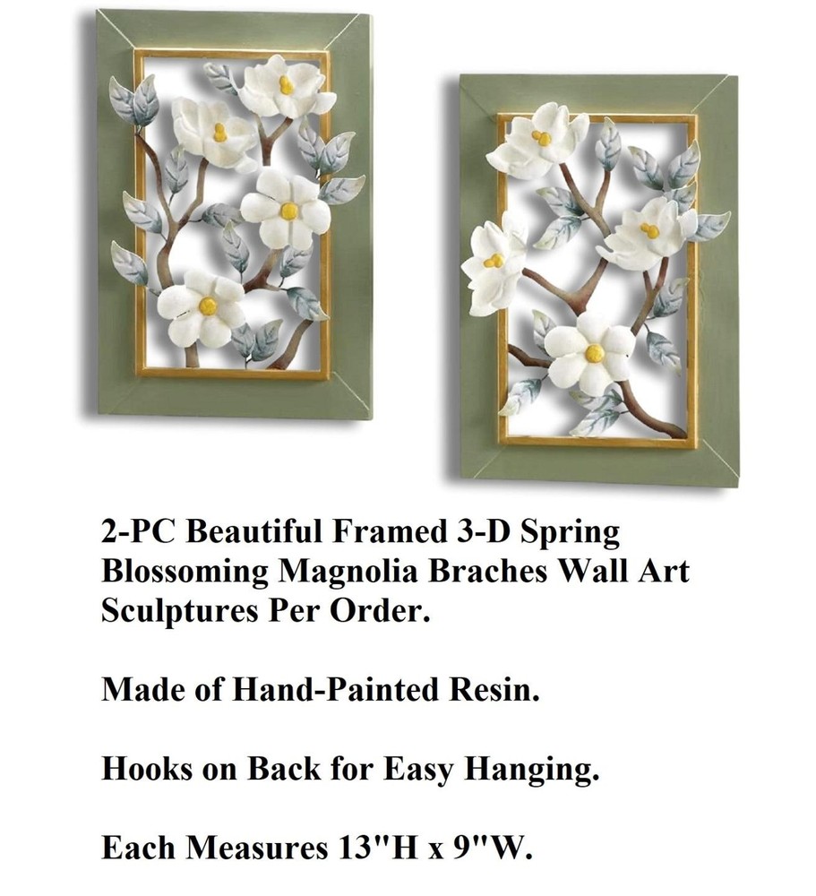 2-PC Blooming White Magnolias 3-D Wall Sculptures Framed Metal Art 9"Lx13"H #039 2-PC Blooming White Magnolias 3-D Wall Sculptures Framed Metal Art 9"Lx13"H #039 Click images to enlarge Description 2-PC Blooming White Magnolias 3-D Wall Sculptures Framed Metal Art 9"Lx13"H. These beautiful floral wall art are perfect for sprucing up your home for a touch of Spring. Each framed artwork features white magnolia flowers in a 3D design with silver-white leaves and yellow centers. Each is hand-painted and are easy to hang. Details: Set of 2 Framed Wall Art Each Measures 13"High x 9"Long Made of Metal Each Has Hook On Back For Easy Hanging Hand-Painted with Intricate Details ~Buy more than one item at the same time from our eBay store and save in shipping costs!~ (If buying different items, just put them all in your cart before paying, to get the combined shipping discount!) Shipping We use UPS SurePost, UPS, USPS and FedEx SmartPost to deliver our products to your home, depending on which method is more efficient for your order. We use suppliers for some of our orders and our suppliers will choose the service that is used for these orders. PLEASE MAKE SURE YOUR ADDRESS CAN BE VERIFIED BY USPS. Please allow 7-10 days for the item to reach your home. We cannot be responsible for items shipped to incorrect or incomplete addresses, which may result in the cancellation of your order. YES, we do combine shipping! The highest shipping cost item ships at regular price, and each additional item ships at $2.00 more in additional shipping charges. If you are buying several different items from our store, put them all into your cart before paying to get the combined shipping discount. Terms of Sale Unless otherwise noted, we accept returns up to 30 Days after your purchase, through the eBay Returns System. Please use eBay to contact us if there is any problems or issues with your order. In some cases, we order the item purchased from one of our suppliers, and it is shipped directly from our supplier to the customer. There are times when an item unexpectedly becomes unavailable from our supplier. We do our best to check on all of the items availability several timea a day. If an item is unexpectedly unavailable, we will issue a refund for your order immediately. Contact Us Please use the message center in eBay to contact us. We check our message box in eBay several times a day. If you have any questions or concerns with your order, please feel free to contact us. We care very much about our customers being 100% happy with their purchases. We would very much appreciate you letting us resolve any issues you may have with your order by contacting us first, before taking any other unnecessary actions. Get images that make Supersized seem small. Showcase your items with Auctiva's Listing Templates! THE simple solution for eBay sellers.