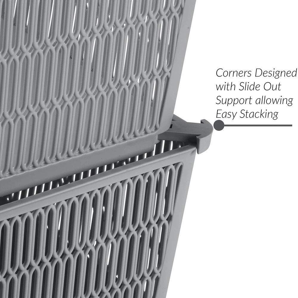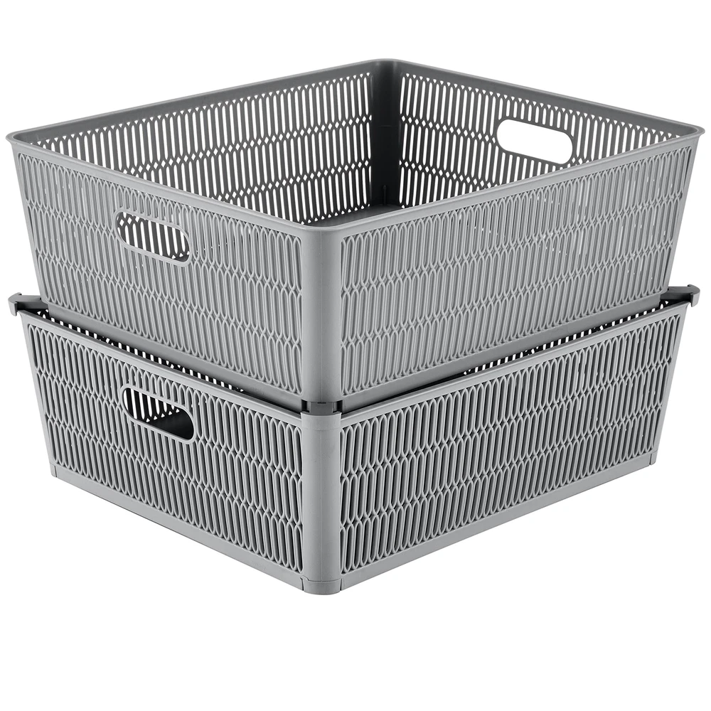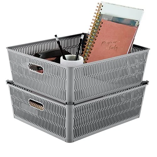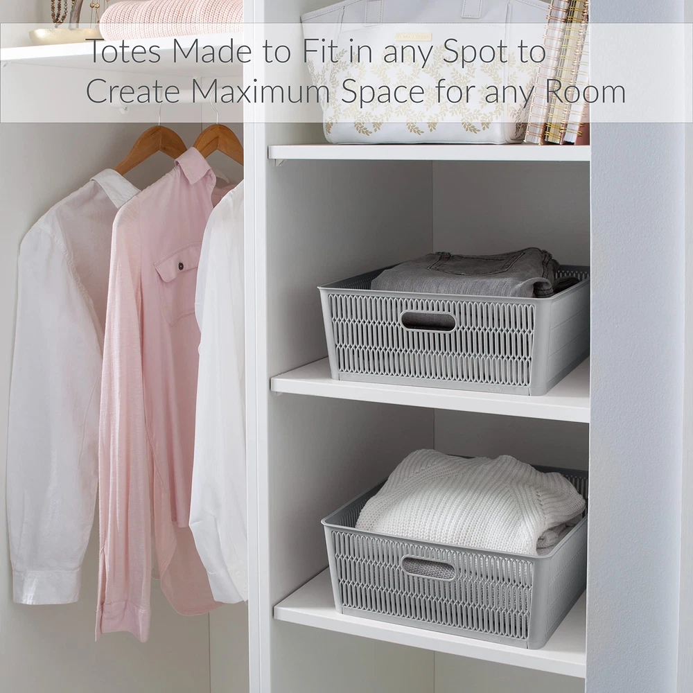 Maximize your storage space with the 2 Pack Slide 2 Stack It Shallow Storage Tote Baskets. Created with a patented slide to stack design which provides slide out corner support that allow the totes to be safely stackable. Storage totes hold up to 25lbs while stacked, allowing you to maximize your storage in closets, cabinets, shelves and more. The totes neatly nest inside when not in use. Organizing just became easier with the slide 2 stack it totes! Dimensions: 15" x 13" x 5" Patented Slide 2 Stack Design: The corners of each storage tote are designed with slide out support to allow totes to be stackable. This helps to maximize your storage space. Nestable: The totes nest easily inside each other when not in use for easy storage and will take up less space. Holds 40lbs: These baskets are strong and durable enough to hold up to 40 pounds when stacked. Multipurpose: These totes are perfect for your bathroom, kitchen, bedroom, and more. You can easily towels, soaps, lotions in it. Or you can use them to organize your craft room.