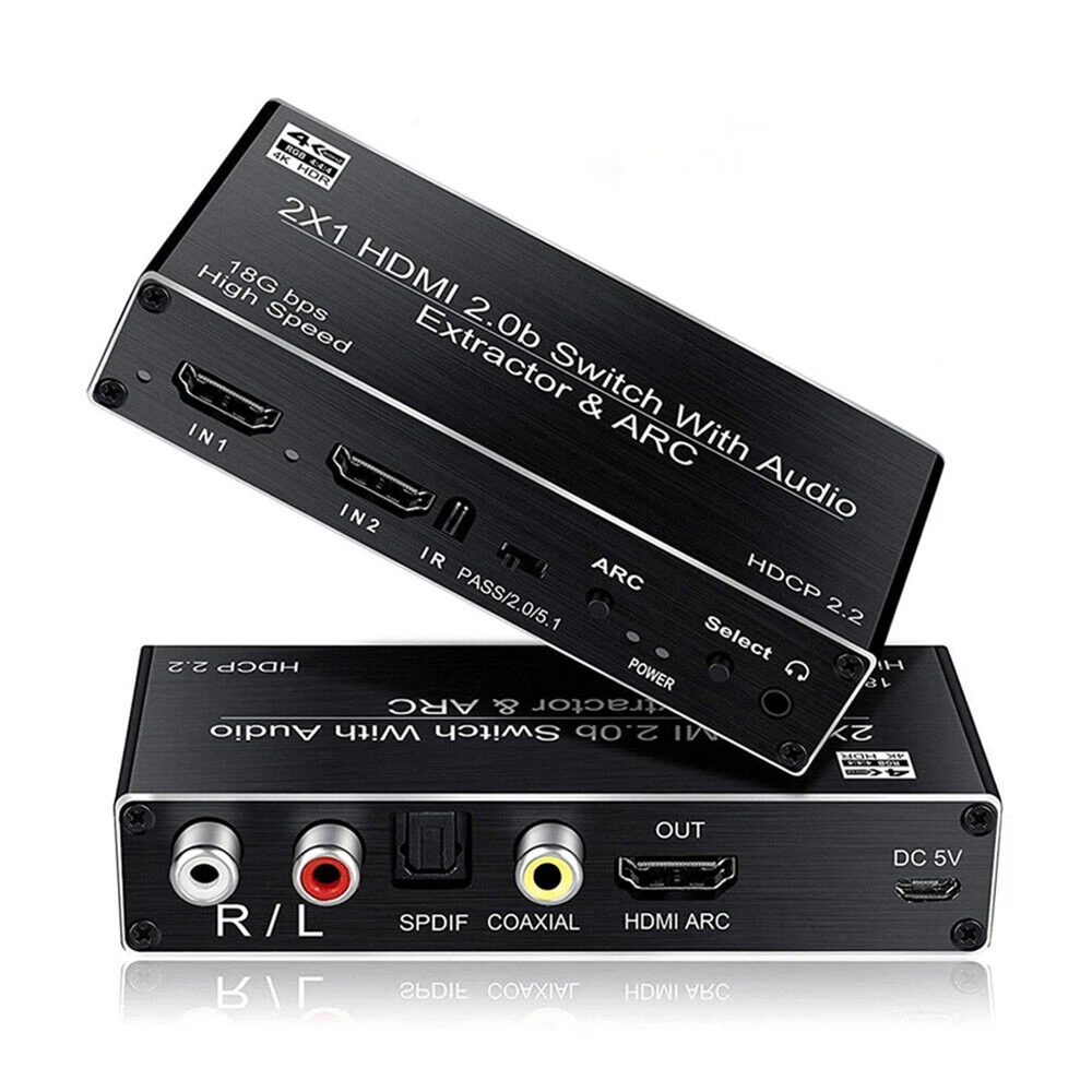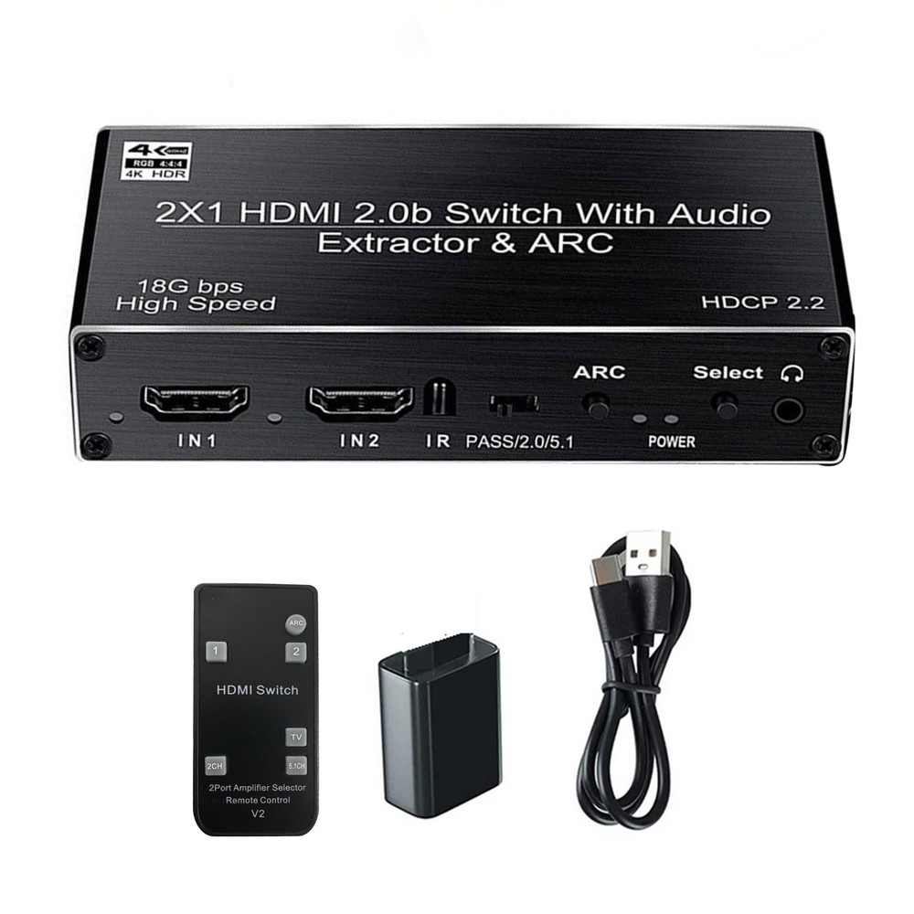 2x1 HDMI Switch Audio Extractor With R/L+Toslink SPDIF+COAXIAL Audio Out Adapter 4K 2 In 1 Out HDMI ARC Audio Switcher Selector Specifications: Compatible with HDMI2.0 and high-definition TV with HDCP2.2 Supports high-resolution input of 480P, 720P, 1080P, 1080P 3D, 4K60Hz Support compressed audio: DTS Digital, Dolby Digital (DTS-HD and DOLBY) with Audio Separation and Audio Return Function (ARC) Supports HDMI2.0 (4; 4; 4 RGB) Supports MHL function and has LED indication function Supports automatic identification of signal sources, and automatically jumps to the next port with a signal source when the signal source is disconnected, Automatically jump to newly inserted HDMI signal source Supports high-definition signal with remote control Supports video transmission with broadband of 3Gbps/300MHz Power supply: 5V1A(Included 5V1A power adapter) Feature: 1. 4K@60HZ 2X1 HDMI SWITCH with AUDIO EXTRACTOR: This 4K HDMI Switch allows you connect Two HDMI 2.0 Sources to one display device, Each input source support audio extract by the Toslink+L/R+Coaxial audio output channel. No loss of quality after you split the signal. No degradation in audio quality. (HDMI output support CEC) 2. ULTRA HD 4K VISUAL ENJOYMENT: Supports HDCP 2.2, HDMI2.0b, 4K@60HZ, RGB4:4:4, Full HD, UHD, HDTV, Deep Color to 36bit,also back compatible with 4K@30HZ and 1080P. Max Bandwidth of 18.2Gbps.(Kindly Note: It is not compatible with DVI) 3. HDMI ADUIO EXTRACTOR: With Optical Tolink SPDIF+L/R+3.5mm Jack+Coaxial audio out allows you extract the audio from the HDMI input source ( Like For PS4, Cable box, For Xbox or any HDMI device)connection to a spearker, Amplifier etc. Note: If you choose optical or coaxial audio out, you can enjoy 5.1CH or 2CH or audio copy. If you choose 3.5mm or L/R audio out, you can enjoy 2CH or audio copy. 4. HDMI ARC ADAPTER: Supports ARC (Audio Return Channel), Extractor the Audio from TV to Soundbar or Amplifier. Connect your TV HDMI(ARC) Port to this switch HDMI Output Port with HDMI Cable, then using optical or Coaxial cable to the soundbar, Speaker, home theater, A/V receivers etc.No distortion of audio or video(Note:3.5mm jack and L/R audio port not support ARC audio) 5. Smart Auto-Switch with Remote Control: It will automatically skip to the most recently inserted HDMI signal source,it will automatic change from HDMI source A to HDMI source B when you turned on source B and back to source A when you turned source B off Product List: 1x HDMI switcher 1x IR remote control(Included 1*CR2025 battery) 1x USB power cable 1x 5V Power adapter 1x User manual