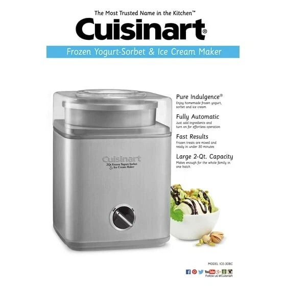Product details What's better than one quart of luscious homemade ice cream, sorbet, or frozen yogurt? Two quarts! The fully automatic Cuisinart® Pure Indulgence™ makes 2 quarts of your favorite frozen desserts or drinks in as little as 25 minutes. It's easy - an integrated motor, double-insulated freezer bowl and automatic mixing paddle do all the work. Results are consistently smooth, cleanup is easy, and the brushed metal styling is simply sensational. Fully automatic frozen yogurt, sorbet, and ice cream maker. Dimensions (LXWXH) : 8.25 x 8.00 x 11.25 inches Brushed stainless-steel housing; heavy-duty motor. BPA Free Large ingredient spout for easily adding favorite mix-ins Double-insulated 2-quart freezer bowl; instruction book and recipes included. UC Cubic Feet: 1.23 Product Built to North American Electrical Standards. Cord storage, keeps countertops clutter free Your freezer should be set to 0°F to ensure proper freezing of all foods. Note: Kindly see the User manual below for how to use