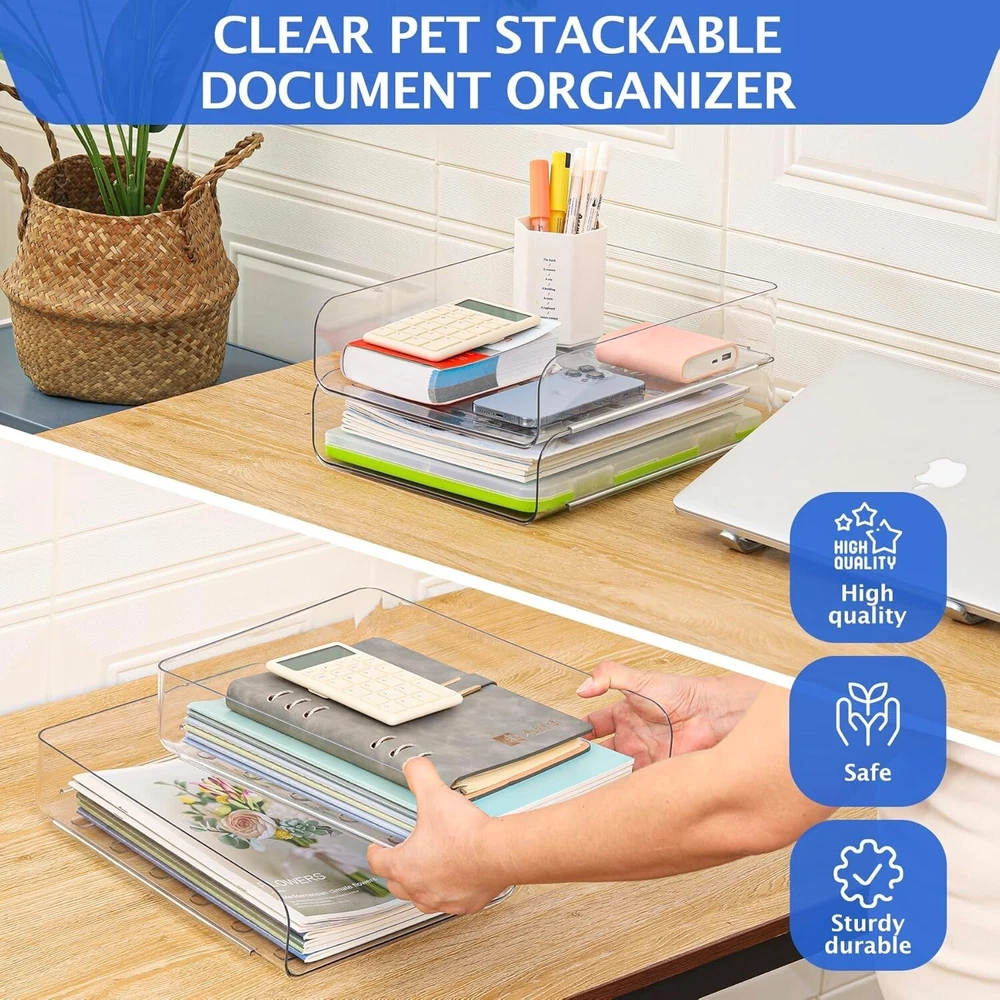 About this item 2 Layers Office Organization - Our office organization and storage has 2 trays that can be used to display your items or store savings, such as A4 paper, documents, books, notebooks, notepads, stationery, keys, jewelry, etc., providing you with a lot of convenience. Stylish and Sturdy Desk Organizer - Our paper letter tray is made of thick premium PET material, which features durable and sturdy to use for a long time. The transparent office storage looks very clean and sleek, and it can provide a clean/organized look of your home and office desk for you. Space Saveing - With a stackable design, this desk organizer tray takes up a small space in your office desk, but provides you with a large storage space. This clear office organizer tray can keep all your stuff in one place. It will nicely to sort and hold your office supply and desk accessories. Multiple Functional - This horizontal stackable desk organizers and storage is great for school, home, and office to organize textbooks, notebooks, teachers' and students' files, documents, magazines, stationery, printer paper, etc. Color Clear Product Dimensions 12.5"L x 9.6"W x 5.8"H Shape Rectangular