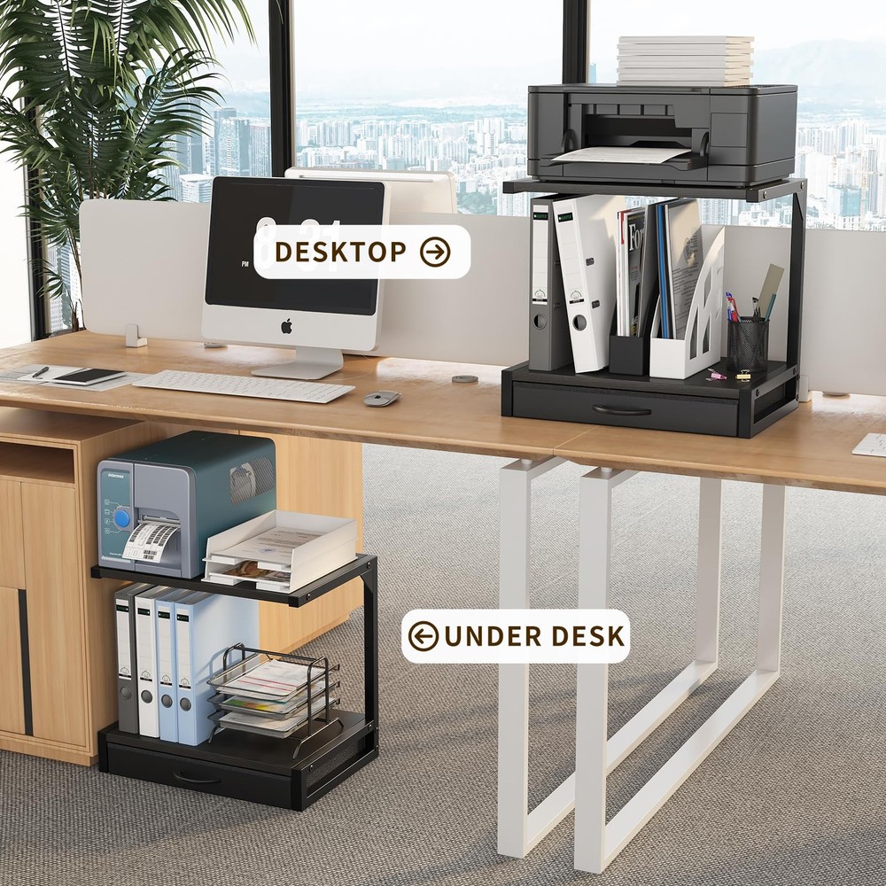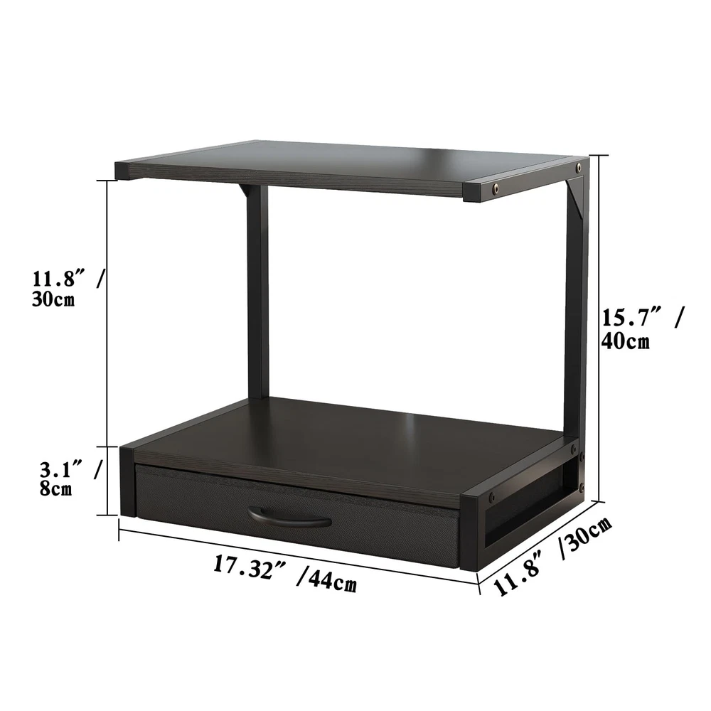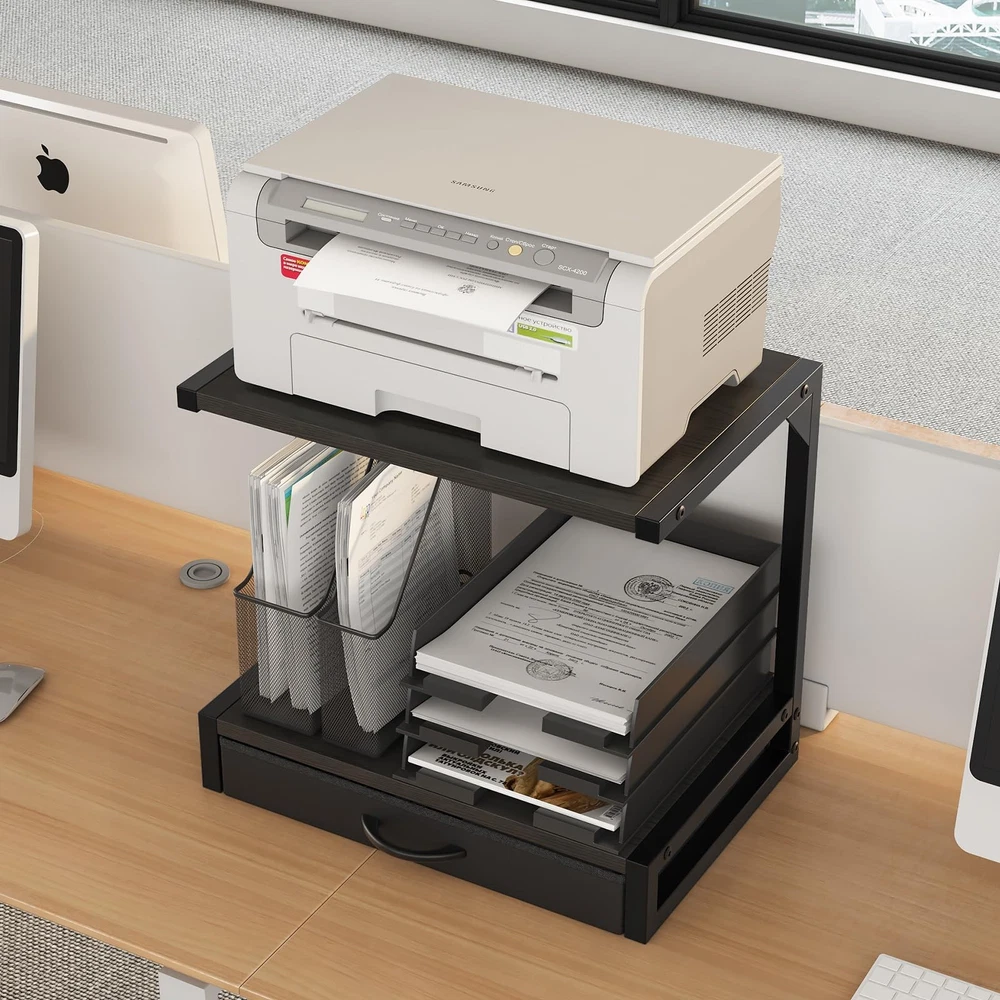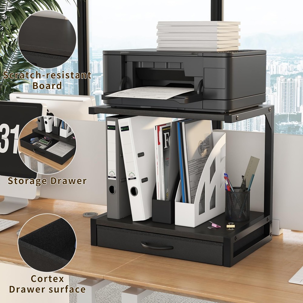 Product Parameters: Dimensions: 17.3" x 11.8" (Compact size perfect for any desk or workspace) Material: Durable metal frame with fabric drawer for added functionality Color: Sleek black design that complements any office decor Weight Capacity: Sturdy enough to hold 3D printers, fax machines, scanners, and other office essentials Features: 2-tier design for efficient organization, fabric drawer for storing small items Product Highlights: ✔ Space-Saving Design: This 2-tier desktop printer stand maximizes your workspace by keeping your 3D printer, fax machine, or scanner neatly organized. Its compact size (17.3" x 11.8") makes it ideal for small desks or cluttered offices. ✔ All-in-One Organization: With a practical fabric drawer, this stand helps you store cables, paper, or other accessories, keeping your desk clutter-free and enhancing productivity. ✔ Sturdy and Reliable: Built with a durable metal frame, this printer stand ensures stability and can support heavier equipment like 3D printers without wobbling. ✔ Modern Aesthetic: The sleek black finish blends seamlessly with any office decor, adding a professional touch to your workspace. ✔ Easy Assembly: Designed for convenience, this stand is quick and easy to assemble, so you can start organizing immediately. Usage Scenarios: 🏠 Home Office: Perfect for home office setups, this printer stand keeps your desk tidy and ensures your 3D printer, scanner, or fax machine is always within reach. 🏢 Professional Workspace: Ideal for small offices or shared workstations, it helps declutter the area and improves efficiency by organizing essential equipment. 🎨 Creative Studio: Artists and designers can use this stand to keep their 3D printer and supplies organized, allowing more room for creativity. 📚 Student Dorm: Compact and functional, it’s a great addition to student dorm rooms, providing extra storage and keeping study areas organized. Why Choose ’s Printer Stand? METERRY’s 2-Tier Desktop Printer Stand is more than just a storage solution—it’s a game-changer for your workspace. Whether you’re a professional, a student, or a creative enthusiast, this stand offers the perfect blend of functionality, durability, and style. Say goodbye to clutter and hello to a more organized, efficient workspace with ! Upgrade Your Workspace Today! Don’t let a messy desk hold you back. Order your Printer Stand now and enjoy a cleaner, more productive environment! 【2-Tier Desktop Printer Stand】This compact desktop printer stand measures 17.3"D x 11.8"W x 15.7"H, perfect for your printer table for home office. The two-tier printer shelf accommodates two printers, 3D printers, fax machines, or scanners, with 11.8" middle space for optimal organization. 【Printer Stand with Storage】 Keep your office essentials private and clutter-free with this printer desk stand with storage. The included drawer provides a convenient space for small items, enhancing your home printer stands' functionality and keeping your workspace tidy 【Multi-Usage Printer Table】This versatile printer stand for desk doubles as a storage solution for files, plants, documents, or magazines. Ideal as a cricut stand, desk shelf, or nightstand, it’s a must-have for any home office or workspace 【Compact and Sturdy Design】Made from high-quality MDF with a durable metal frame, this small printer stand supports up to 44 lbs. Its waterproof tabletop is easy to clean, making it a practical choice for your 3D printer desk or cricut table 【Assembly and After-Sales】With clear instructions and simple structure, installation is very simple, so you can quickly assemble and start enjoying the convenience of this multifunctional bread stand. If you have any questions, please contact us immediately, we will be ready to serve you 24 hours a day