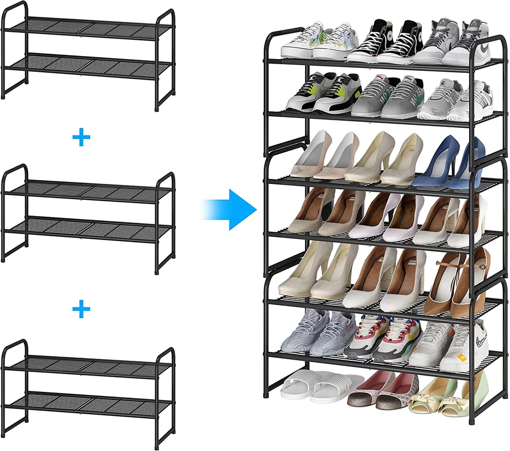 2-Tier Stackable Shoe Rack, Metal Shoe Shelf Storage Organizer, 【2-TIER SHOE RACK】 Stores up 6-9 pairs of shoes for men, women, additional bottom storage for slippers. Allow extra storage which can hold sundries in your wardrobe, living room 【Multifunctional】In the living room, the shelves can hold sundries.Put it in the closet and keep the clothes neat. Make the utility room looks cleaner. 【STACKABLE DESIGN】Include 4 connectors and stack up to multiple units that maximizes storage space in the same footprint (Purchase 2 and more units to vertically storage) 【EASY ASSEMBLY】Simple clip the shelves into the frame. You can easily adjust the height of shelves accommodates different sizes of shoes. Even the High Boots, you can store it easy 【DIMENSION】26.6"W x 11.3"D x 14.5"H What does this Simple Trending shoe rack have to offer? This 2-tier shoe rack provides shelves for keeping flats, boots, high heels, kids’ shoes. Two sets can placed side by side to Keep the shoes are neat and orderly, bid farewell to dirty differences. Versatile Storage Shelf: You can place this rack anywhere you want, such as in the entryway, closet, garage, living room or mudroom; also great as a storage shelf for dry food, books, games, toys, craft supplies, etc. Will you find any more possible uses? Just find out yourself with this Simple Trending versatile utility rack. Specifications: Color:Black Material: Metal Product Size: 26.6" * 11.2" * 14.5" Package Contents: 1x 2 Tiers Shoe Rack 1 x Assembly Manual 4 x Metal Connectors ( for stacking ) 11.2 "h x 26.6 "h x 14.5 "h. Weight: 3.5 lb Style Metal Wire Panel Number of Items 1 Material Metal Mounting Type Floor Mount Country of Origin China Shelf Type Tiered Shelf Shape Rectangular Room Type Garage, Closet, Living Room Assembly Required Yes Product Dimensions 26.6"D x 11.2"W x 14.5"H Installation Type Freestanding Product Name shoe rack Finish Type Multiple Specific Uses For Product Shoes Back Style Backless Item Weight 3.5 pounds Number of Shelves 2 Special Feature Stackable Color Black Furniture Finish Black Recommended Uses For Product Shoe Included Components Instruction Manual Product Care Instructions Wipe with Dry Cloth Size 2-Tier
