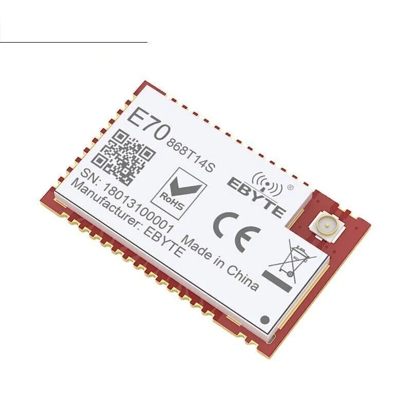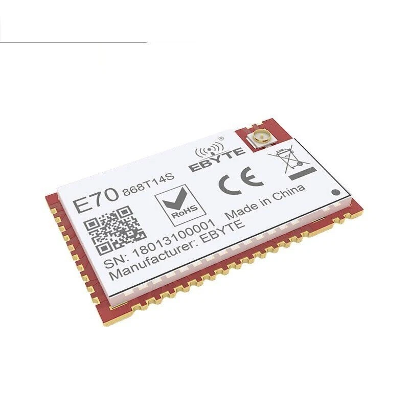 CC1310 868MHz 14dBm SMD UART Module E70-868T14S iot 25mW Wireless Transceiver RF Parameter Value Remark Working frequency 861~876.5 MHz Default: 868MHz (24MHz oscillator) Transmitting power 4~14 dBm Default: 14dBm(About 25mW) Receiving sensitivity -110 dBm Air data rate: 50kbps Air data rate 2.5k~168kbps Default: 2.5kbps Test distance 1500m In open and clear air, with maximum power, 5dBi antenna gain, height of 2m, air data rate: 2.5kbps Hardware Parameter Value Remark IC CC1310F128RGZ FLASH 128 KB RAM 20 KB Core Cortex-M3(MCU)+Cortex-M0(RF) Size 16 * 26 mm Without SMA Antenna type IPEX / Stamp hole Communication interface UART Baud rate: 1200~115200, default: 9600 Package SMD Buffer 2048 bytes buffer Defined by user Electronic parameter Min. Typ. Max. Unit Condition Power supply 2.1 3.3 3.8 V Communication level 2.1 3.3 3.8 V Transmitting current 25 27 30 mA 14dBm(25mW) Receiving current 7 8 9 mA Sleep current 0.5 1.0 2.5 μA Operating temperature -40 20 +85 ℃ Operating humidity 10 60 90 % Storage temperature -40 20 +125 ℃