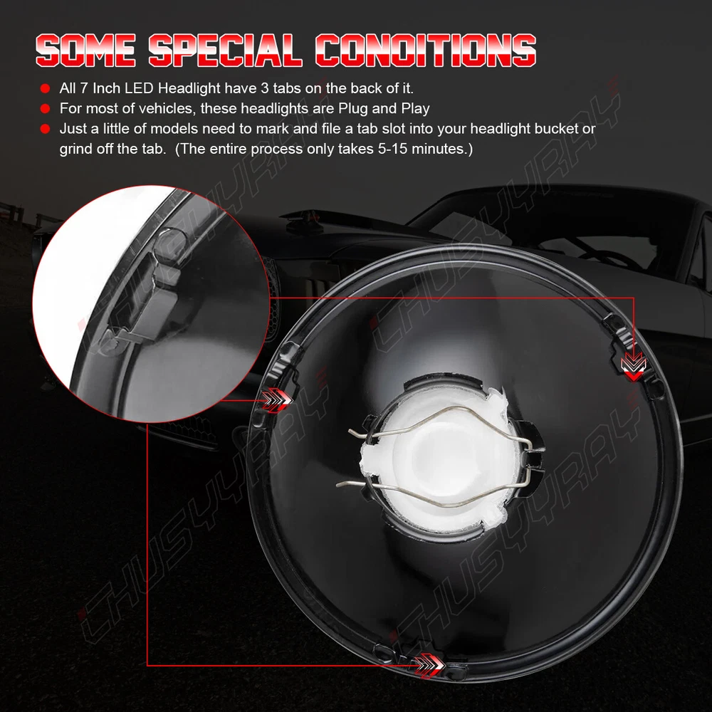 THESE ARE STOCK STYLE GLASS FACED / METAL BACKED HEADLIGHTS! INCLUDES (2) HIGH INTENSITY LED H4 6000K WHITE LIGHT BULBS! PAIR- 7" Stock Style H4 Headlights Glass Lens / Metal Backside High Intensity LED Bulbs Low And High Beam Functions (2) Low Beam / High Beam Headlights No Modifications Needed - Plug And Play Part Number Interchange: H6006 / 6006 For 12-Volt Systems Only DOT SAE Approved This listing is for a pair of new 7" stock style glass lens - metal back headlight bulbs. This set includes (2) low / high beam headlights with high intensity 6v LED light bulbs (no wiring or bucket modification needed). These have the original shaped prongs on the back so they will plug right into your original wiring harness plugs. These will fit any car or truck that has 2 round glass headlights & will fit into stock buckets. Each bulb is 7 inches in diameter. These are glass and we will take extra care in packaging. DOT SAE Approved INTERCHANGE: H6006 / 6006 All-In-One H4 6v LED Headlight Bulbs: 4,000 Lumen Bulbs - PAIR 4,000 LUMENS PER BULB! The LED conversion kit to rival HID power is finally here! The LED 12V conversion kits come in all different headlight and fog light bulb styles. Not only are the new LED conversion kits as bright as an HID system, but the new design from chusyyray, does not require a relay or harness or special drivers. The LED conversion kits from have the driver built in to the bulb, which means there are no external parts to mount or plug in, just replace your old halogen bulbs with the new ones and plug them in like the originals. The new u6s LED conversion kits from are the brightest on the market! Each dual beam 12v LED bulb produces 2,600 Lumens of light and draws 26 watts of energy on the low beam setting; but produces 4,000 Lumens of light and draws 40 watts of energy on the high beam setting. LED LIGHT BULB Specifications and Features: 2,600 Lumens Low Beam / 4,000 Lumens High Beam Light Output Per Bulb 360 Degree Light Beam Angle 26 Watts Low Beam / 40 Watts High Beam Energy Usage Per Bulb LED Light Color: 6,000K Weatherproof Rating: IP67 Waterproof Ball-Bearing Fan for Cooling Newest Technology All-In-One Design: No Ballast or Driver Required LED Protection Circuit to Protect from Reverse Polarity, Low Voltage or High Voltage Spikes Smart & Efficient Cooling System Uses Built-In Cooling Fan Greater Visibility - 3x Brighter than Factory Halogen Bulbs Voltage: 12-Volt High Quality Aluminum Heat Sink Ensures Proper Temperature Regulation Lower Power Consumption than Halogen Bulbs Vibration Proof Design 50,000 Hour Lifespan Easy Plug & Play Installation - No Modification Required No Splicing of Harnesses Required for LED Bulbs Uses 75% LESS Power than Halogen or HID Bulbs 3x Brighter than Stock Halogen Bulbs Dramatically Improves Visibility at Nigh
