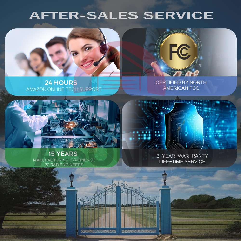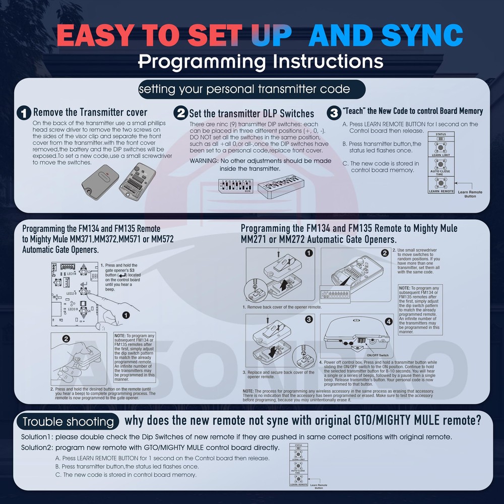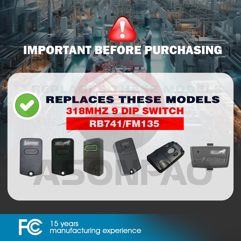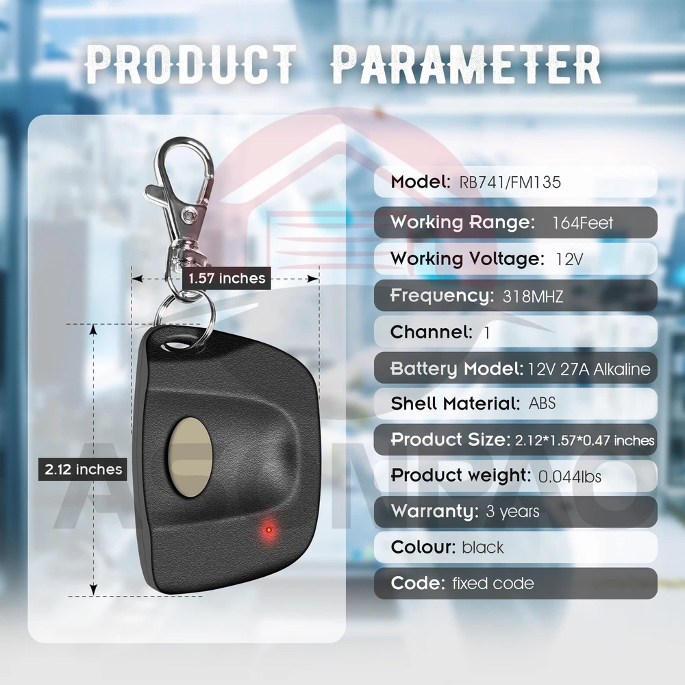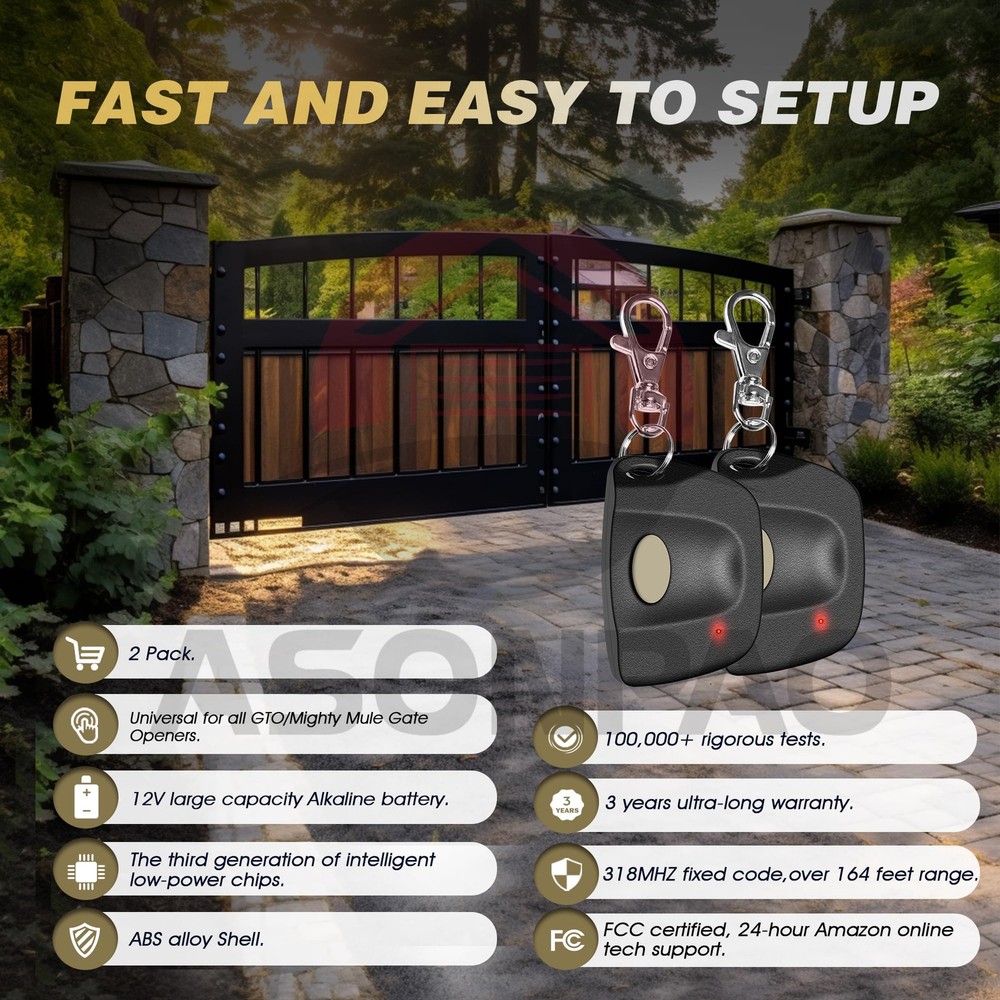 **List**: with All Mighty Mule and GTO / Linear Access Gate Opener ,9 Dip Switches, 3 Positions, Frequency 318MHZ. **Outstanding Support & Extended **: Enjoy peace of mind with our 24-hour technical support and a generous 3-year . Our **universal garage door remote** ensures long-term satisfaction and reliability, making it the perfect choice for your needs. **Durability & Reliability Guaranteed**: Built with a robust ABS alloy casing and FCC certification, this **durable remote** has passed over 100,000 validation tests. Trust it to withstand drops and deliver consistent performance every time you use it. **Extended Battery Life for Convenience**: Featuring a 12V 23A large-capacity Alkaline battery and a third-generation intelligent low-power chip, our **long-lasting gate remote** offers extended battery life, saving you the hassle of frequent replacements. **Enhanced with 318MHZ Fixed Code**: Upgrade your gate with our advanced 318MHZ Fixed Code technology. This **secure gate remote** provides superior anti-theft protection, ensuring your home remains safe and secure. **User-Friendly Design for Easy Access**: With a 164ft control range and a straightforward pairing process, this **compact gate remote** can be conveniently stored on your car's sun visor. Enjoy effortless access and control whenever you need it.