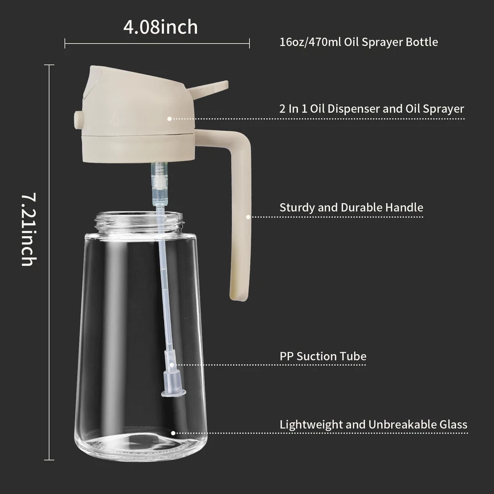 Warm tips: In order to achieve a better effect of the spray, first conduct a spray test with water to make the inside of the spray wet enough, and then use oil to achieve a better spray effect. 【2 IN 1 OIL DISPENSER AND OIL SPRAYER】This is a 2 in one glass oil spray bottle, both can pour oil, can spray oil, from now on, you no longer need to buy a separate spray bottle and pouring bottle, there is this two-in-one spray bottle is enough to save money and save space in the kitchen! 【HEALTHY COOKING OIL SPRAYER】This oil sprayer can easily control and measure the daily oil volume, each spray spray about 0.15 grams of oil, very convenient for counting calories and macros, which is great for healthy cooking. The leak-proof design will keep your kitchen countertop clean without making any mess. The protruding nozzle and ergonomically designed handle make it easy to use and comfortable to hold. 【MULTI-PURPOSE GLASS OIL SPRAYER AND DISPENSER】 This is a perfect multi-functional kitchen gadgets, widely used in barbecue, air fryer, black stone skillet, pan, oven, etc. Whether you want to grill a chicken, or fry a steak, french fries, make a vegetable salad, bake bread, make popcorn, etc., you need to use it. 【FOOD GRADE OIL DISPENSER BOTTLE SPRAY AND POUR】This 2 in 1 oil dispenser bottle spray and pour is made of food grade,BPA-free PP and Lightweight, Unbreakable, lead-free glass, health and environmental protection,you can use it with confidence. The transparent glass allows you to keep an eye on the oil level and won't catch you caught off guard. 【EASY TO USE AND CLEAN】The cooking oil sprayer with a Large caliber design, it is very convenient to add oil. Use gently press to spray a straight line,quickly press to the end spray fine mist evenly,tilt to the pour out the oil. Push down the push button on the top of the injector with your finger to switch from spray mode to pour mode. Can be washed by hand or in the dishwasher.