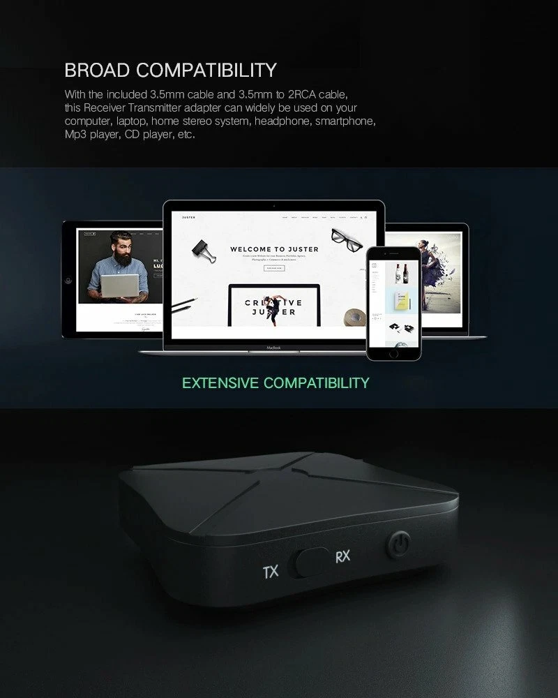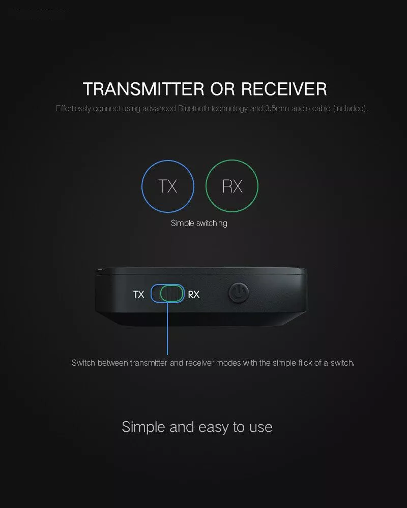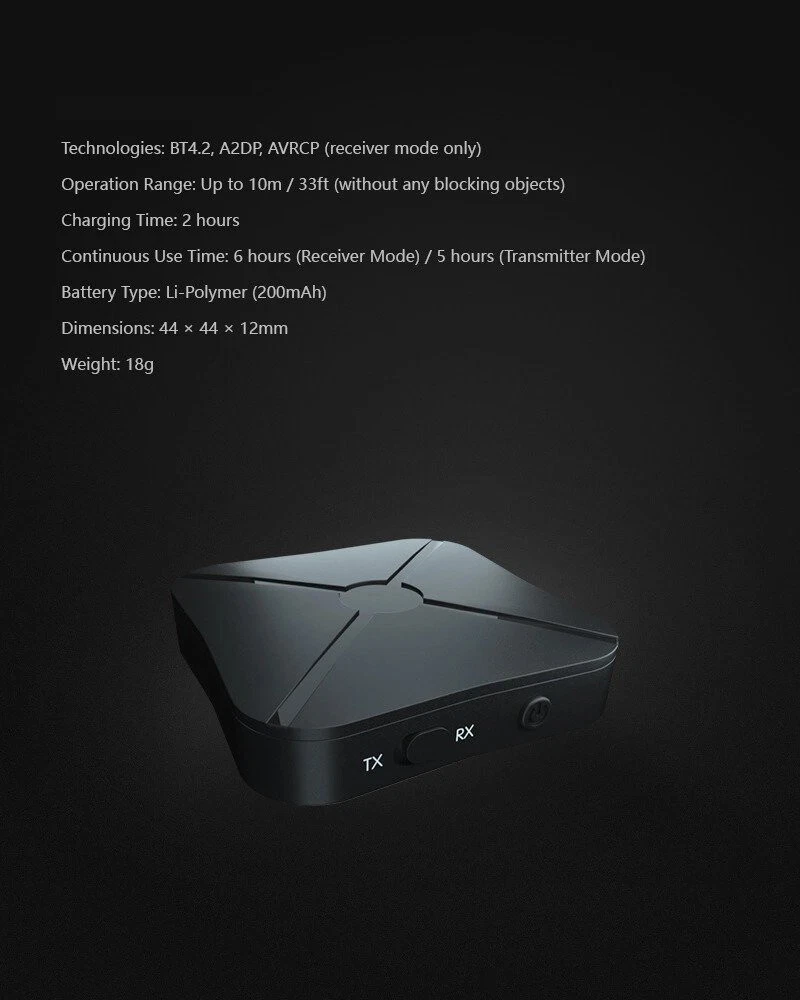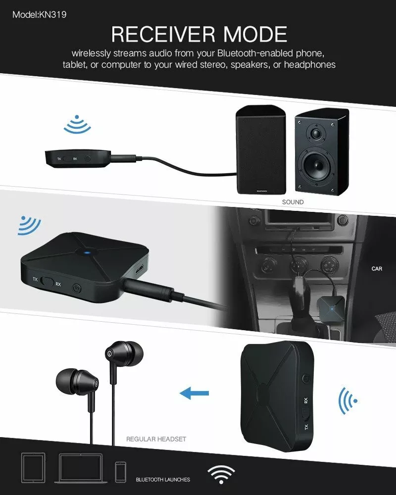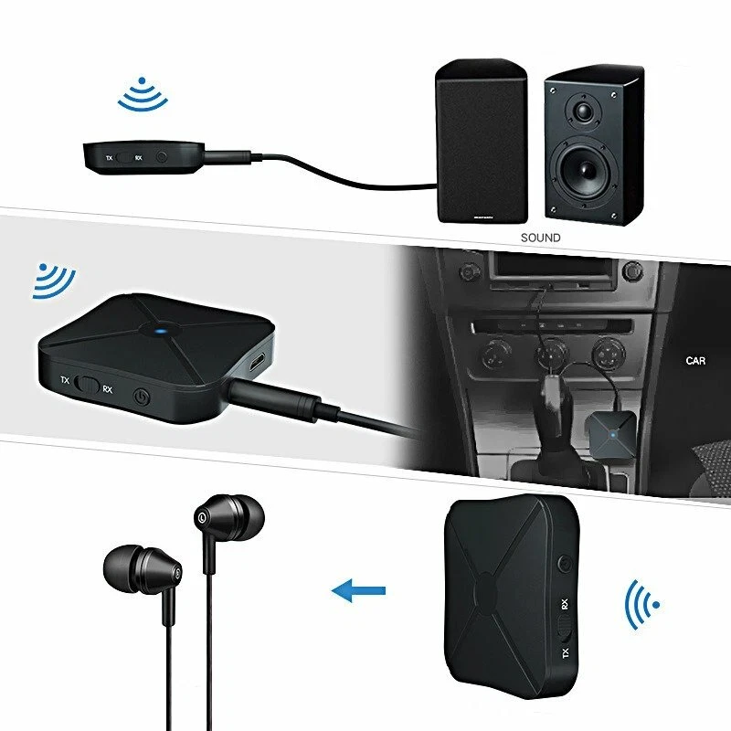 So Low Price, So High Quality! Send us a message Our Store Seller Profile Feedback Save this seller Contact 2in1 Bluetooth Transmitter & Receiver Wireless A2DP Home TV Stereo Audio Adapter Wireless Bluetooth Receiver/Transmitter 2 in 1 Use our product for all your transmit and receiving audio purposes, such as transmitting audio to already capable buetooth headphone, speaker or car stereo system. Or you can use our product to give bluetooth wireless capabilities to your hardwire headphone, speaker or car stereo system. Installed our product to your TV via 3.5mm/AUX cable to the output audio port and connect the other end of the 3.5mm/AUX cable to the named "Transmit" port on our product. This will transmit audio from your TV to your bluetooth capable headphone or speaker. Power ON our product via the multi-function button and our product will automatically search for a bluetooth headphone or speaker that is in pairing mode. Or... Install our product to your hardwire headphone, speaker or car stereo system via 3.5mm/AUX cable to the input audio port. This will give it bluetooth wireless capabilities. Packaging Includes: Bluetooth Transmitter and Receiver 3.5mm/AUX cable Micro-USB to USB cable User Manual Shipping: We are always working hard to ensure your package arrives as soon as possible. Please, understand that some factors like weather, high postal traffic and the performance of shipping companies are outside of our control. We offer free shipping to the lower 48 states and ship within 1 business days of payment, usually sooner. We do not accept P.O. Boxes. Please, provide a physical address. Returns: We offer a 30-Day Return Policy on all our products purchased, to which you're not completely satisfied with. You have the option for a full-refund or an exchange of the the item. No returns are available on items shipped outside of the USA. Customer Satisfaction: We try our very best to make every customer completely satisfied. If there's a problem with product or service, please don't hesitate to contact us via message. We're happy to help you with your issues. We take our reputation seriously, we buy and sell online, so we understand the value of trust. If you're unsatisfied with your order, please, contact us immediately, and we'll do our best to resolve your issue in a timely matter with satisfaction results! We're here to provide a positive and five star business with our customers. Contact: Please, contact us via ebay message with any of your concerns. Built-in 600 mah Li-polymer battery average of 8 to 10 play with full charge. Full charge of battery takes average of 2 hours. Use the Transmit Mode to transmit audio from your TV to your bluetooth headphone or speaker. Make your hardwire Speaker, Headphone or car stereo system have wireless bluetooth capabilities. Real time low latency and high quality audio transmission. Your audio transmission master: Used for all your audio interface devices like your TV, PC, CD Player and etc. User manual provides very detail instructions to transmit or receiver audio from bluetooth automatic pairing to searching bluetooth profile name. Bluetooth v4.1 1 Audio ports on our product. Used for Audio output/input