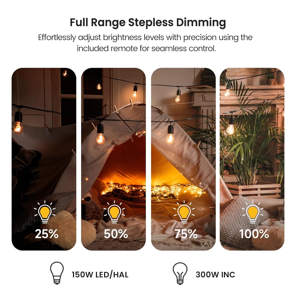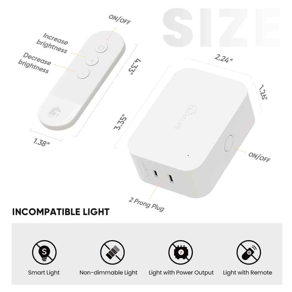 2 in 1 Dimmer Plug with Remote No Smart Features Wireless Remote Control Outlet Compatibility & Important Note: This is a NON-SMART device without app/WiFi//Google Home compatibility. Exclusively designed for standard dimmable bulbs requiring manual control, including LED/CFL bulbs (150W max per bulb) and halogen/incandescent bulbs (300W max). Not compatible with smart bulbs, DC transformers, ceiling fans, or USB-powered devices. Critical Reminder: Bulbs must be Dimmable Dual Outlet Compact Design: Please note that two outlets cannot be controlled separately. This lamp dimmer switch offers two sockets for simultaneous control of two dimmable lamps or string lights. Designed for compact spaces, ensures easy access to the bottom socket, even when the top one is in use. This feature not only saves on costs but also simplifies installation Light Brightness Adjustment: Enjoy smooth and continuous control over your dimming range, easily adjustable from 1% to 100% via the wireless remote control. Ideal for various lighting needs, including indoor dimmable floor lamps, string lights, bedside lamps, and seasonal decorations like day, or display Easy to Use: No disassembly or rewiring is required. Achieve remote ON/OFF and dimming functions with a single button click and long press, ensuring ease of use for all demographics, including elderly individuals with limited mobility, pregnant women, and people with disabilities. Our mission is to enhance convenience, safety, and energy efficiency, making life easier for everyone Quality Assurance: FCC listed for safety and quality assurance. Should any issues arise with the wireless remote control dimmer, our responsive support team is available to assist you and swiftly resolve any concerns Product Description Treatlife indoor and outdoor plugs that you may like Add to Cart Add to Cart Add to Cart Add to Cart Add to Cart Add to Cart Add to Cart Customer Reviews 4.4 out of 5 stars 157 4.2 out of 5 stars 5,814 4.6 out of 5 stars 84 4.4 out of 5 stars 466 4.1 out of 5 stars 1,833 4.3 out of 5 stars 1,702 4.4 out of 5 stars 220 Price $29.99 $ 29 . 99 $29.99 $ 29 . 99 $19.99 $ 19 . 99 $23.99 $ 23 . 99 $26.99 $ 26 . 99 $32.99 $ 32 . 99 $18.99 $ 18 . 99 /Google Compatible ✘ ✘ ✘ ✘ ✔ ✔ ✔ 2.4GHz WiFi Needed ✘ ✘ ✘ ✘ ✔ ✔ ✔ Dimmable ✔ ✘ ✘ ✔ ✔ ✔ ✘ Number of sockets 2 1 2 1 2 2 2 Control Methods IR wireless remote Control IR wireless remote Control IR wireless remote Control IR wireless remote Control APP/Voice/Touch APP/Voice/Touch APP/Voice/Touch Wattage 150W LED, 150W CFL, 300W INC 1800 Watts 1800 Watts 150W LED, 150W CFL, 400W INC 150W LED, 150W CFL, 300W INC 600Watts 1800 Watts Item dimensions L x W x H 3.35 x 2.24 x 1.26 inches Current Rating 2.5 Amps Operating Voltage 120 Volts Product Dimensions 3.35 x 2.24 x 1.26 inches; 6.4 ounces Circuit Type 1-way Country of Origin China Connector Type Plug In Terminal Spade Operation Mode ON-OFF Batteries 1 CR2032 batteries required. (included) Actuator Type Push Button Mounting Type Wall Mount Specification Met FCC Contact Type Normally Closed Switch Type Push Button Material Plastic Complimentary Shipping and Easy Returns Need to return something? Enjoy our 30-day hassle-free return policy! Take advantage of free shipping across all 48 contiguous states! Your order will be dispatched within 1-2 business days once payment is confirmed. Your Opinion Matters! Your happiness is our main goal! We welcome your feedback! If you encounter any problems, reach out to us right away, and we’ll be here to help. Explore the Extraordinary! Our collection showcases fascinating products that are sure to capture your attention. What surprises await you? Delve in and discover unique items that enrich your daily life. Don't miss the amazing things we have in store for you!