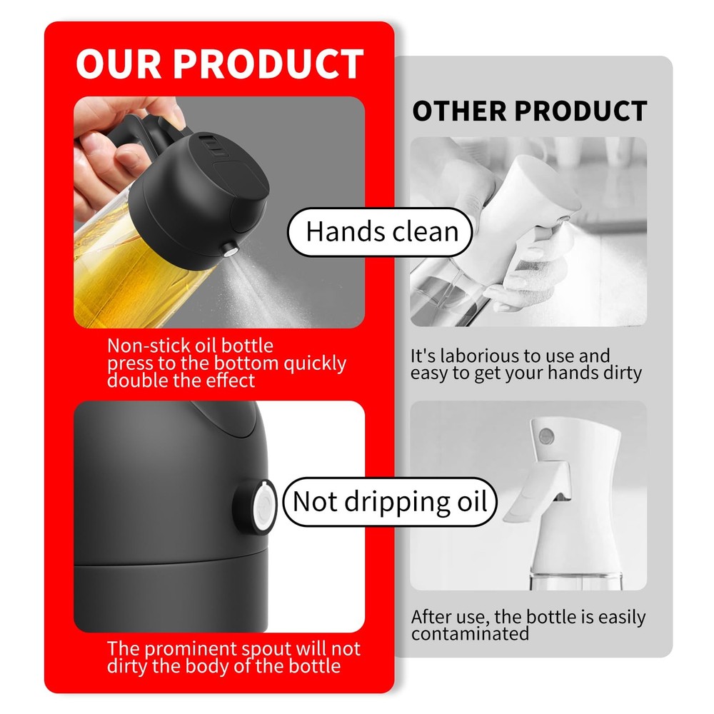 Oil Dispenser For Kitchen Oil Sprayer For Cooking 2 in 1 Oil Dispenser and Oil Sprayer Olive Oil Sprayer 【 2 in 1 Oil Dispenser and Oil Sprayer】This is a spray bottle that can both spray oil and pour oil for cooking. It is suitable for various food preparation processes such as salad dressing, frying pan, grilling, barbecue, baking, etc., allowing you to easily switch between the two 【Oil Dispenser For Kitchen】The cooking oil dispenser is made of 470ml glass which is safe and odorless. Transparent glass can easily monitor the oil level, making it convenient to use. 【Oil Sprayer For Cooking 】Cooking spray bottle can help control the amount of oil when dumping or spraying. It can be cleaned by hand or dishwasher and reused. 【Olive Oil Sprayer】Olive Oil Sprayer is a unique nozzle that can pour or spray oil without dirtying hands. When pressed quickly, it can produce wide-angle fine mist, and when pressed slowly, it can provide stable oil flow 【Our Services】 Thank you for your trust in 2 in 1 Oil Dispenser and Oil Sprayer. Lifetime free technical support. If you are not satisfied for any reason please contact us for a replacement