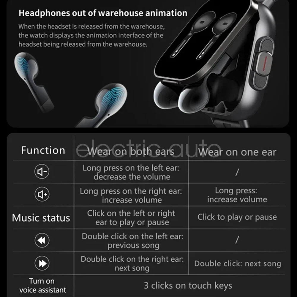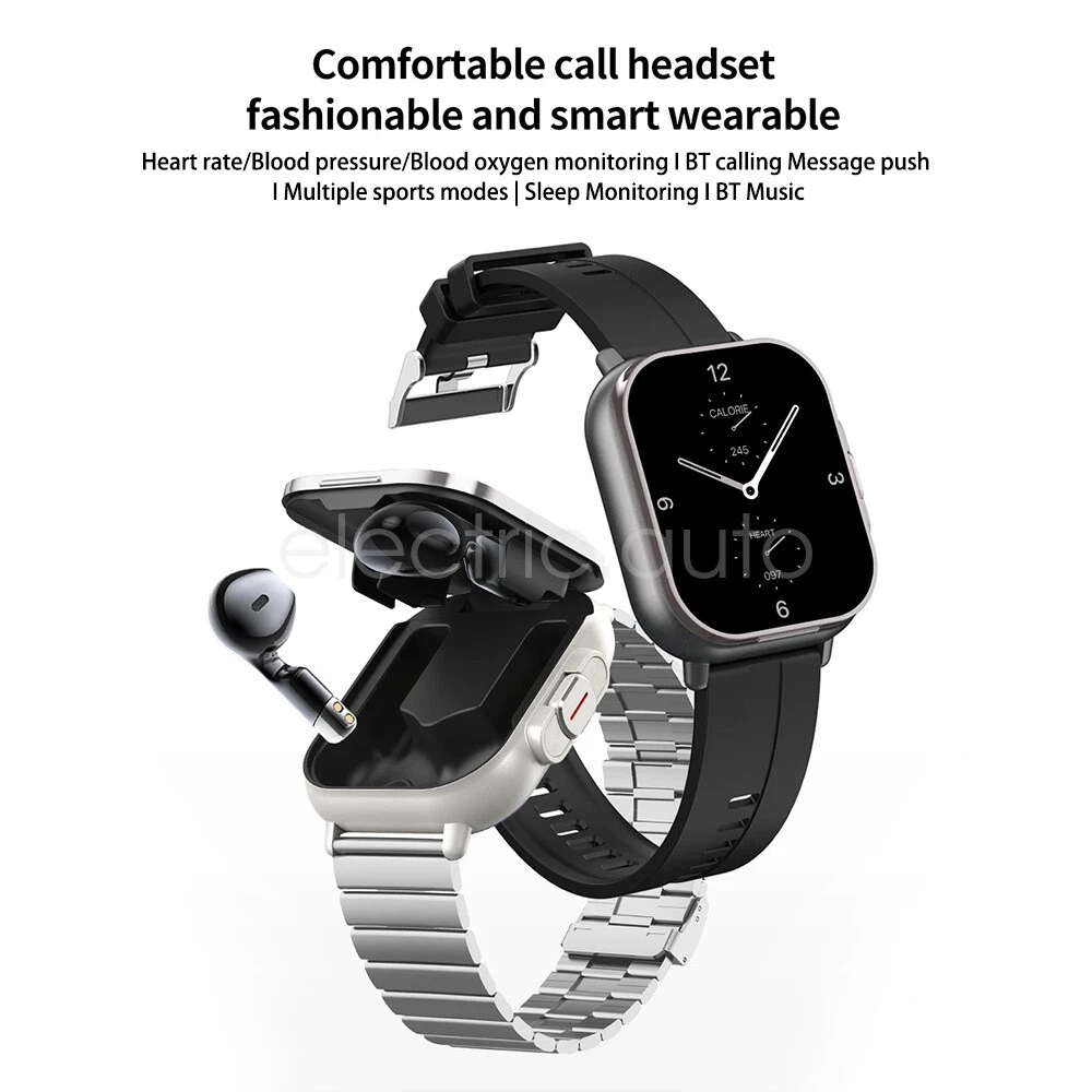 Home Arduino Module Sensor Chips About Us Features 1. TWS Bluetooth headphones and watch in 2 in 1. 2. Headphones can play continuously for about 4-5 hours. 3. Flashlight, bedside alarm clock (vibration reminder), calendar, shortcut bar (control center), calculator; mini games, maps. 4. Sweep code one key to connect, NFC, custom dial switching (support APP push), 5 kinds of UI interface switching, address book, Bluetooth dialing calls. 5. Health monitoring (heart rate, blood oxygen, blood pressure, sleep), fitness records (pedometer, distance, calories) 6. Multiple exercise modes (outdoor walking, outdoor running, indoor walking, badminton, indoor running, outdoor cycling, indoor cycling, triathlon, hiking, elliptical, stepper, rowing machine, etc.). 7. App notification alerts: For SMS, incoming calls, WeChat, QQ, Facebook, Twitter, Line, Whatsapp, Instagram. 8. Watch firmware in 5 languages: Simplified Chinese, Traditional Chinese, English, German, Japanese, Korean. Specification Product Name: TWS 2-in-1 Smartwatch Product Model: D8 Main Chip: JL7012 Screen size: 2.0 inches Resolution: 240*296 Memory capacity: 128MB Bluetooth version: 5.3 (headset) Bluetooth version: 5.0 (watch) Waterproof rating: IP67 Battery capacity of watch/charging compartment: 250mAh polymer lithium battery Headset battery capacity: 30mAh polymer lithium battery Charging case function: the main body can charge the headset 2-3 times, standby time: 15 days Music time: about 4-5 hours Charging mode: magnetic charging Charging time: 2 hours Operation mode: full screen touch + keys, vibration: real-time vibration reminder Compatible system: Android 7.0 and above; ios 11 and above; this Hongmeng 3.0 and above Application: Heylink Case material: glass lens + zinc aluminum alloy Strap material: TPU tape/steel band Packing list 1x 2-in-1 smartwatch 1*User manual 1*Magnetic charging cable Note: heart rate, blood oxygen, blood pressure are only reference values, not for medical use!!!! Payment Shipping Refund Payment We accept PayPal only. But we only Accept your Ebay Address ,Please Make sure it's 100% right. Payment must be received in 5 business days of auction closing. Please leave note for your special request (e.g. Colors or Size) in PayPal when you pay the order. Any special request cannot be accepted after 24 hours of payment, because most of orders will be processed instantly and same day dispatched. Shipping Fill your shipping info Refund All package need to wait 30 days (US only n eed 7-10 days) , Please take care it.Less than 30 days,we can't take a refund . If the item is defect when you receive it or you are not satisfied with it, please return it within 14 days for a replacement or money back. But the items must be back in factory condition. Please contact us and double check the return address before you return it. If is item is defective in 12 months, you can return it to us. We will send you a new replacement after receiving the defective item.
