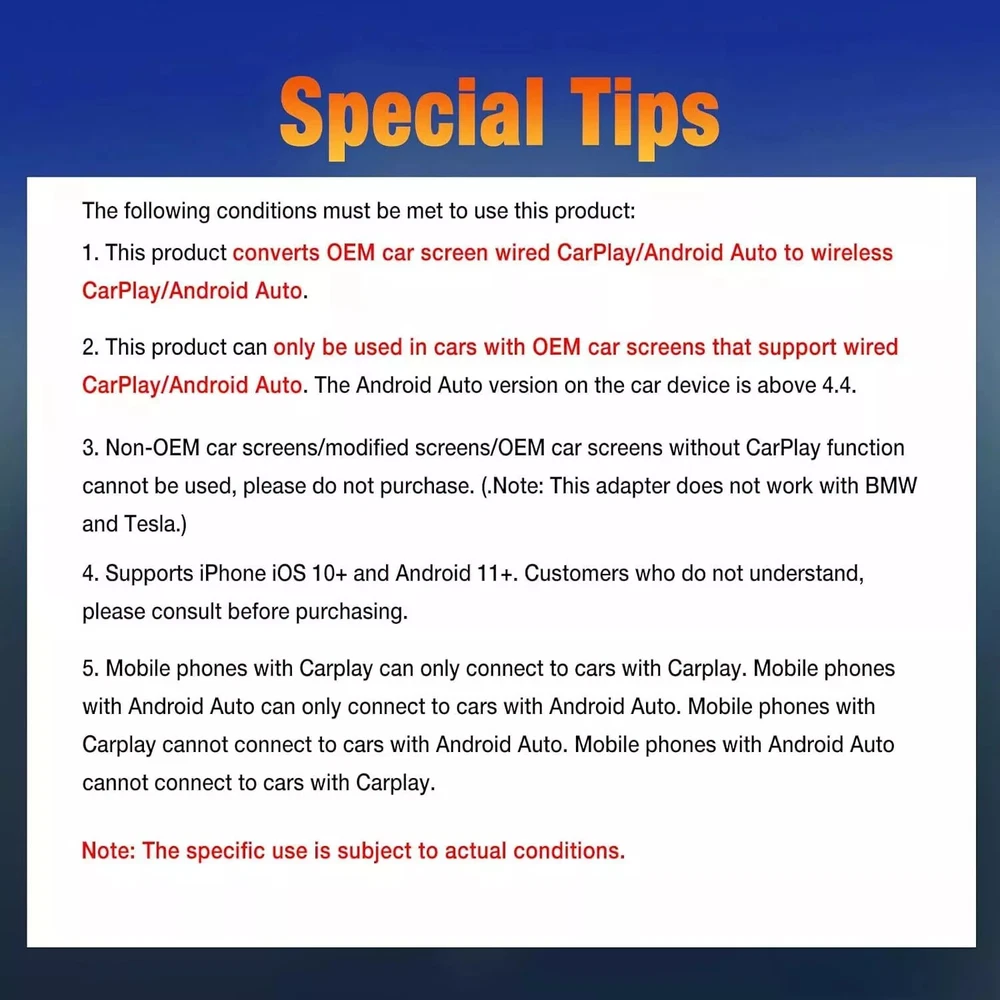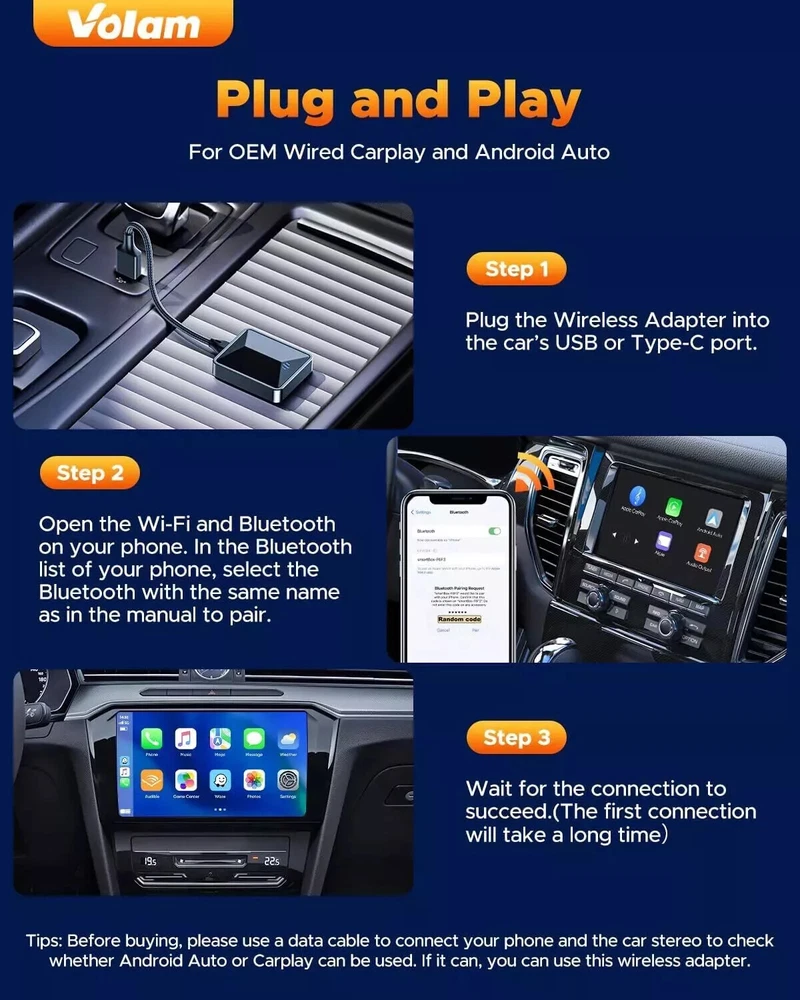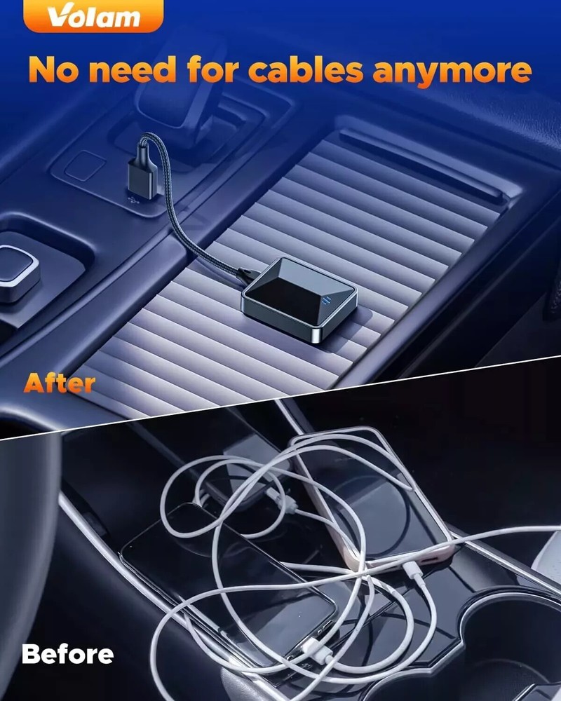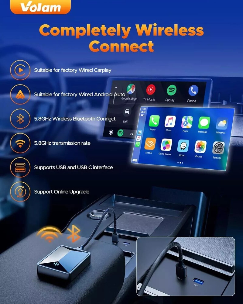 2024 New 2 in 1 Wireless Adapter for OEM CarPlay Android Auto Wireless Adapter, Converts Wired to Wireless for Factory Wired CarPlay Cars from 2016, Type-C/USB, Plug & Play ✔️ 【2024 Volam 2 in 1 Wireless CarPlay Adapter & Android Auto Wireless Adapter】 This 2 in 1 carplay wireless adapter supports both wireless CarPlay and Android Auto in one device. It converts your car's original wired CarPlay to wireless for cable-free convenience. You can continue to use the full CarPlay function and keep the original car operation, such as navigation, music playing, Siri assistant, and phone calls. It can add more fun to your journey. ✔️ 【Instant, Smooth, Latency-free Interaction】 Volam for apple car play wireless adapter uses a new smart IC chip and is equipped with powerful Bluetooth and 5.8 GHz WIFI modules, resulting in reduced noise, significantly decreased navigation and call delays, and the establishment of secure and reliable driving environment. ✔️ 【Easy Setup & Automatic Connection】 Just plug and play, don't need the help of other apps. After the successful first-time easy setup, HOTPEAK carplay wireless adapter will automatically activate the CarPlay or Android Auto wireless connection within 10S every time you start the car even if it is a different phone system that you use. ✔️ 【Native Quality Playback】 By utilizing Volam wireless carplay dongle for stable transmission, you'll experience audio and video playback that mirrors the quality of your original car system. Upgrade your driving experience and enjoy the seamless integration with unparalleled entertainment quality. ✔️ 【Universal Compatibility】 Volam android auto wireless adapter is suitable for the original car models after 2016 with wired carplay, and perfectly syncs with IOS phone (iOS 10+) and Android phones (Android 11.0+). With the USB A/C adapter, the Bluetooth carplay adapter supports both USB-A and USB-C car ports. The Wireless CarPlay dongle is compatible with more than 600 car models. [Tip]: The original car needs to have carplay/Android Auto system, please pay attention to whether it is compatible with the device before purchasing. ✔️ 【Top Quality & Compact Design】 Volam wireless for apple carplay adapter is built with a 6.6 inchs extended Nylon braided cable. It shields against signal interference, is resistant to impact and corrosion. It's compact, lightweight(0.06lb), and includes a USB to USB-C adapter, allowing access to both USB and USB-C type carports. The elegant and sophisticated look of the adapter is perfect for enhancing the aesthetics of your vehicle. Return 1. Accept Return in 30 days for refund or replacement, goods in resalable condition 2. Offer one year for repair warranty 3. Contact for address and reference number before return(note: unannounced parcel may be returned to wrong address, seller will not be responsible for this 4. First 2 months of purchase, buyer pay return postage, seller pay postage for replacement, After 2 months of purchase, non-quality problem, 2 ways of shipping cost paid by the buyer, After 4 months, two way shipping cost paid by the buyer in any circumstances 5. No factory warranty for the man-made damage(Such as dismantle mainboard, damage screen etc), Our company offer service, factory may charge for repair, contact us for details Shipping Fast shipping by US LOCAL FAST SHIPPING , Mostly, all of the products will be shipped out within 1 working day after we received the payment and your contact phone number, We always ship to your paypal address, so if your shipping address is not matched with it, please note the address you want us to ship in paypal Why Choose the US Stock ? 1. US Local Shipping, No Extra Customs Cost to the US 2. Fast Delivery: 2-7 Working days Delivery 3. Best After-Sales Service!!! Feedback Please leave five stars positive feedback positive comment and Five-Stars . Contact us if you have any question, Give us a chance to serve you, negative feedback could not solve anything . Communication Please! Payment Paypal only , eCheque will be held until cleared, All ship to paypal address, Appreciated for the prompt payment, Contact us if bid by mistake, System open unpaid item automatically.