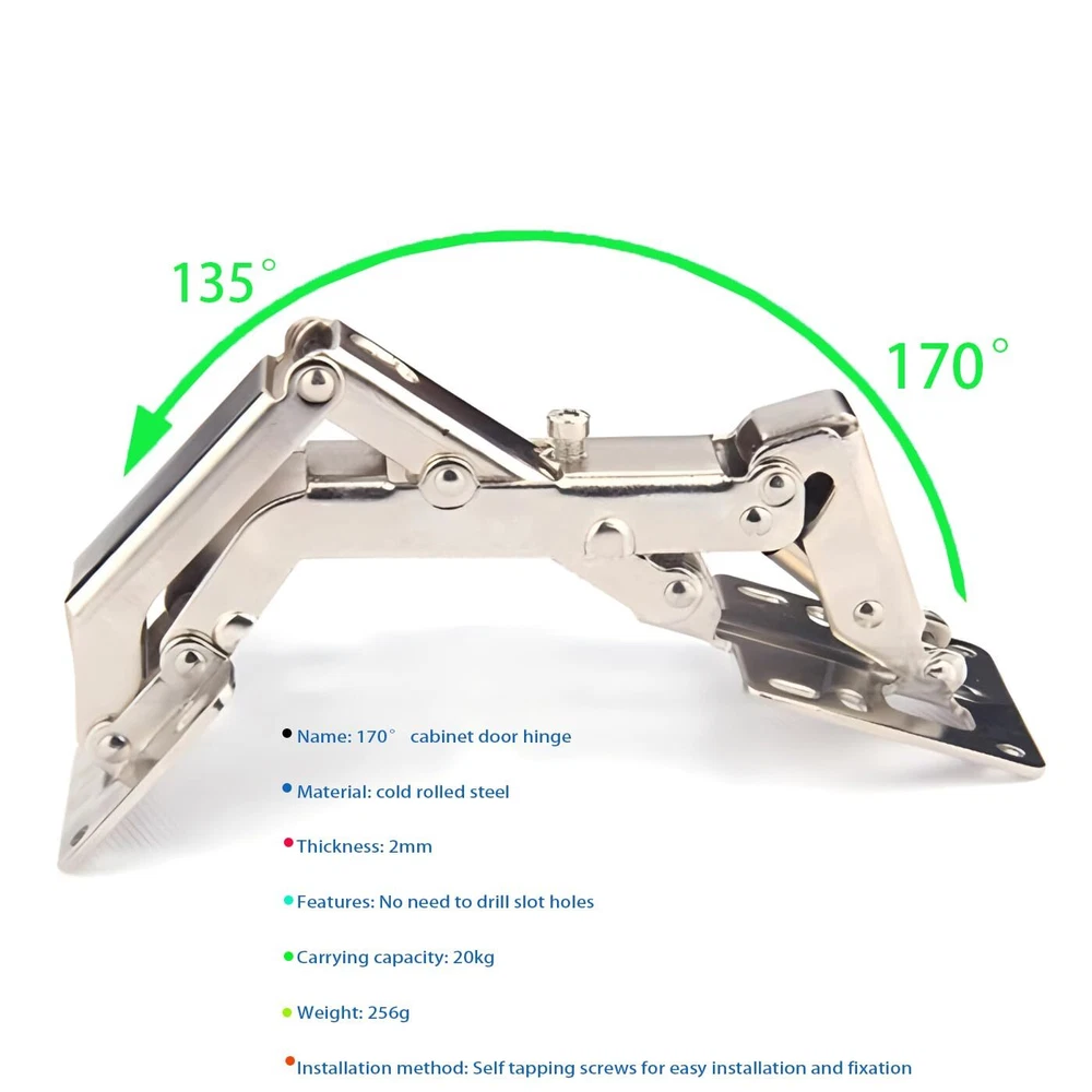 Product: 175 degree concealed adjustable cabinet door hinge Size: 175 degree cabinet door hinge length: 6.3in/160mm. Base width: 2.0in/52mm. Easy installation without drilling hinge. Color: Silver. Packaging: 2PCS 175 degree cabinet door hinges (2 packs of self tapping screws) 175 degree cabinet hinges are suitable for: 0.6in/15mm-1.6in40mm thick wooden door panels. The installation of the non drilling hinge is simple, and the adjustment of the cabinet door is convenient. Save installation time and work easily Flexibles quality: The 170 degree conceal frameless kitchen cabinet door hinge is designed and manufactured with thick and flexibles cold-rolled steel, which improves the durability and stability of the hinge and ensures a longer service life. Please carefully check the product size before purchasing. Mute and Close: The 170 degree cabinet door soft close hinge has a two-stage mechanism that allows the cabinet door to gently close at a small angle to buffer and silence before closing. cabinet door hinges are equipped with hydraulic dampers to help the door close safely and quietly, protecting hands and fingers Door panel size: conceal cabinets door hinge. Suitable for door thicknesses ranging from 0.63in/16-1.58in/40mm; The hinge adjustment screw can be adjusted between 130 degrees and 165 degrees. No need to slot the surface to install the hinge, only a screwdriver is needed for flexible installation. The 170 degree heavy-duty cabinet door hinge is a universal hinge that can be fully covered, partially covered, or embedded for installation. Features: Damping And Buffering: Lightweight opening and closing effect. The hinge is made of high-quality materials. This structure is sturdy and soft, ensuring durability and reliability. The 170 degree hinge is easy to install and does not require drilling. Convenient and fast. Reduce working hours. Hidden door 170 degree hinge: suitable for installing hidden cabinet doors such as shoe cabinets, bookshelves, wine cabinets, cabinets, drawers, and room cabinet doors.