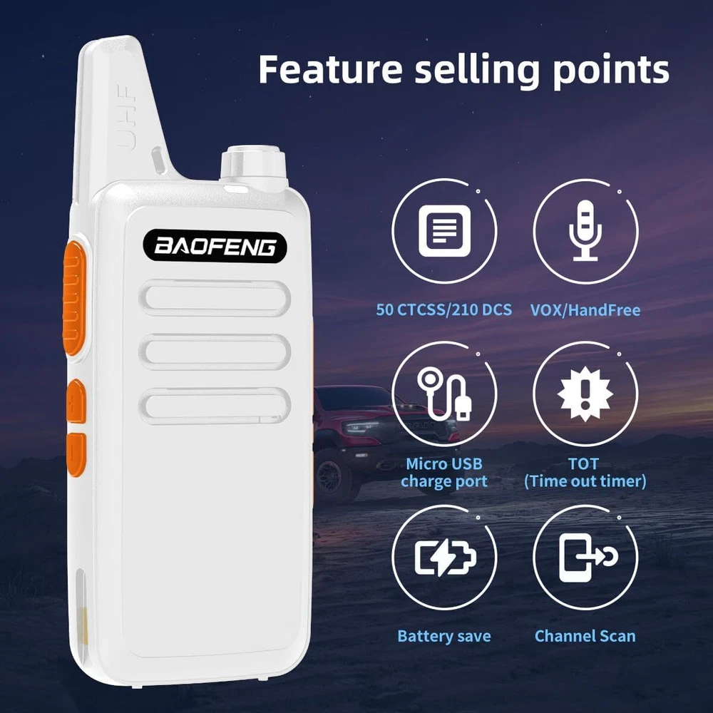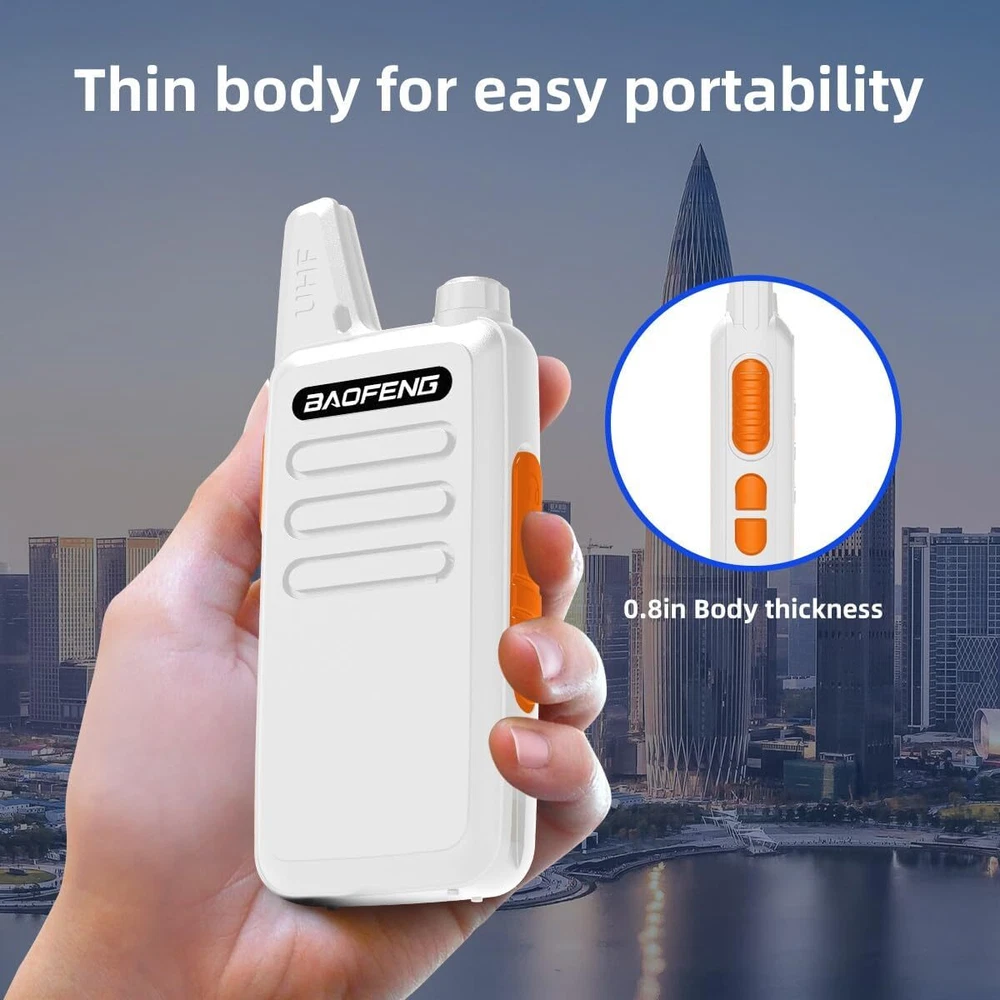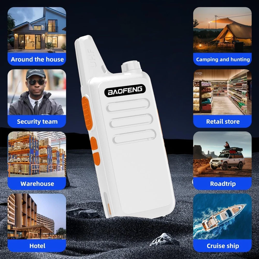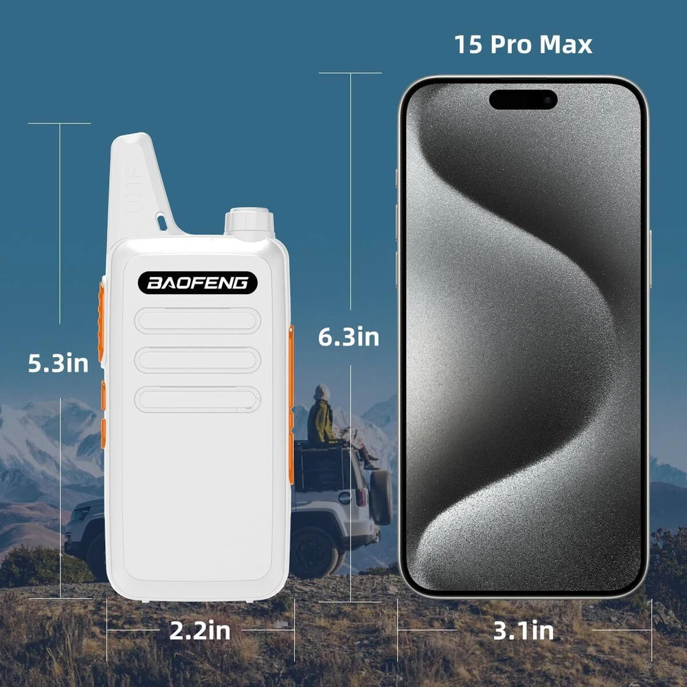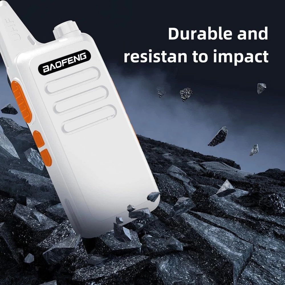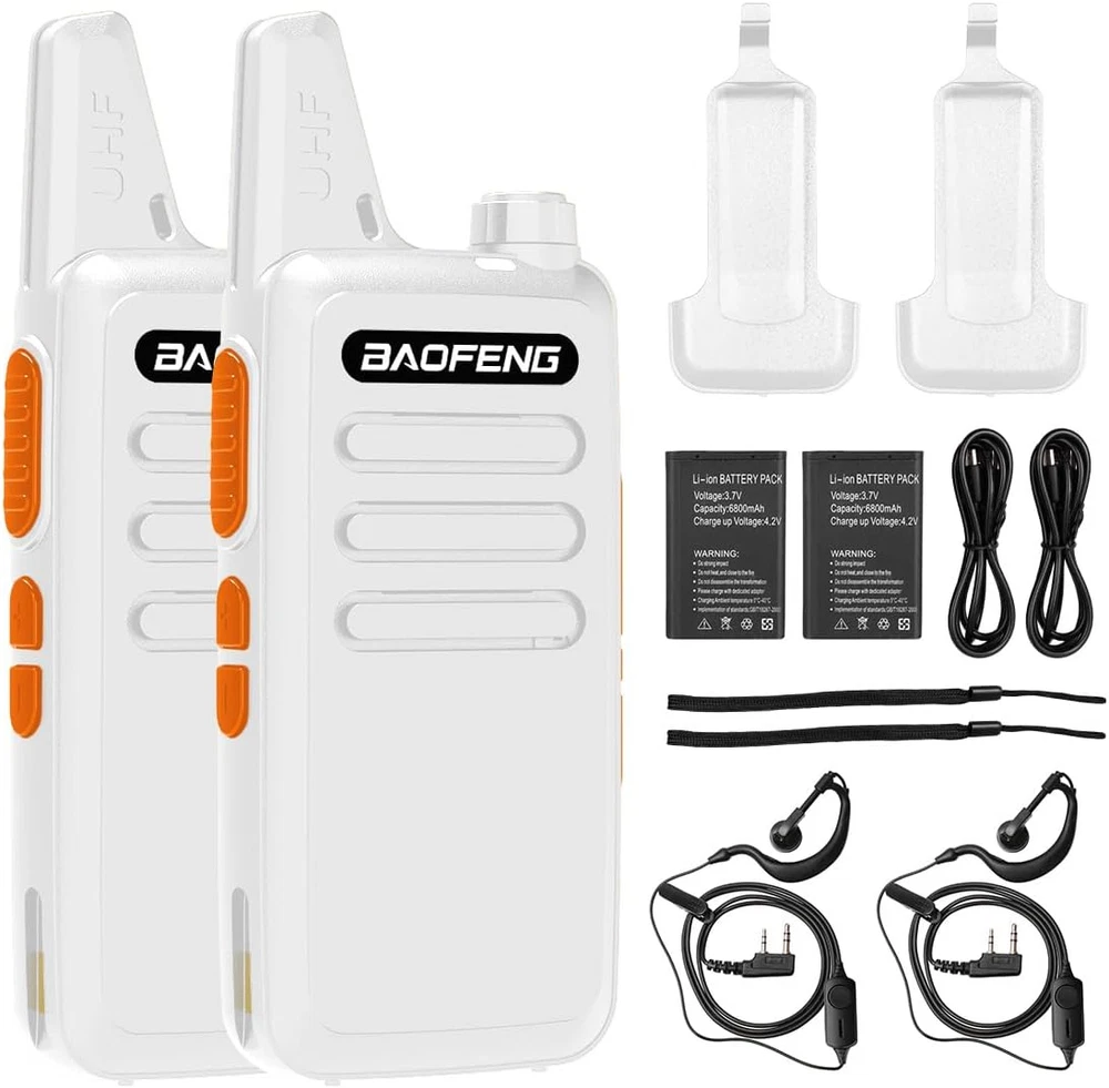 【 Lightweight and convenient 】Baofeng BF-888S upgraded version (T20) can communicate with BF-888S, and lightweight walkie talkies usually have a compact design, light weight, and are easy to carry. Its shape may be thin, making it easier to fit into a pocket or hang around the waist,package contains (walkie talkie, battery pack, Charger, belt clip, hand strap, Earpieces) X 2 and user manual. 【Long-Range communication】walkie talkies long range can reach 3 miles in open areas such as rural areas, suburbs or seaside, etc. where there is no shelter. If in cities or towns, walkie talkies can reach 0.6-1.2 miles in most cases. The actual distance Depends on the obstruction of the current environment. 【Durable battery】Under normal circumstances,walkie talkie can be used for 8-96 hours with a full charge, and up to 8-12 hours with continuous use. The actual time depends on the frequency of use;3-4 hours to fully charge a battery with 0 capacity,long battery life. 【Lightweight and compact, suitable for multiple scenes】Small size and light weight, Hard and durable shell, drop-proof, Rainproof, this Handheld two way radio transmitters are suitable for hotel management, villas, restaurant kitchens,outings,Outdoor mountain climbing, construction sites, factory warehouses, car driving, cruise ships, school,churches, retail stores and supermarkets, security personnel, construction personnel, safety maintenance personnel. FCC ID:2AJGM-T20 Product Description Small and compact This walkie-talkie features a very compact and lightweight design, measuring only 5.31 inches in size and weighing 113 grams. It is ideal for portability and use, providing convenient wireless communication functionality. A clear voice walkie talkie The Baofeng walkie talkie has excellent voice clarity, with clear and natural sound transmission, ensuring accurate and accurate communication between users without any blurring or distortion during the communication process, ensuring communication quality. Walkie talkies with multiple color options The Baofeng T20 walkie talkie offers three fashionable color options, including black, white, and red. Users can choose according to their personal preferences and usage scenarios to meet different needs and styles of users. Product series Digital walkie talkies, analog walkie talkies, civilian walkie talkies, private network communication, walkie talkie accessories.