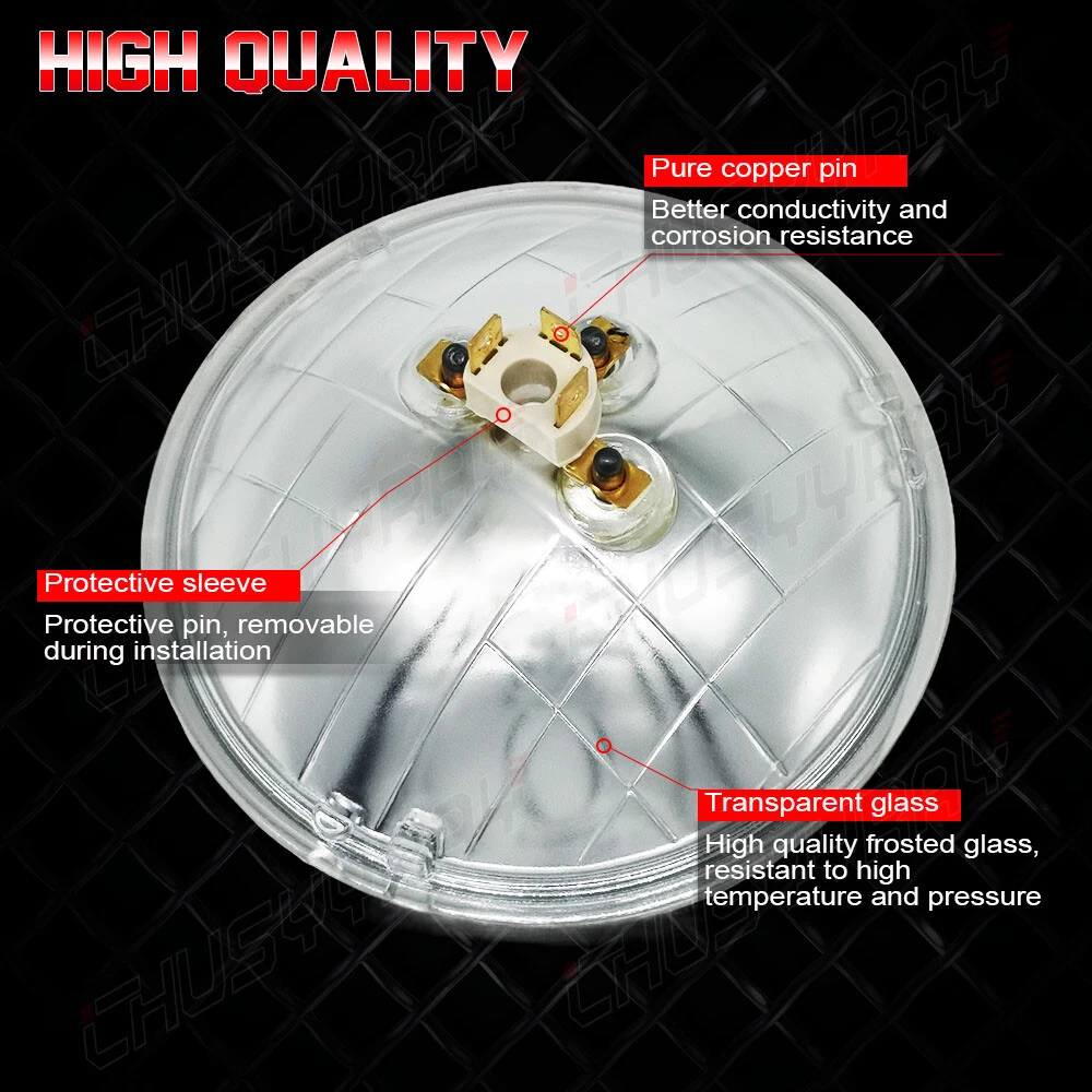THESE ARE HALOGEN SEMI-SEALED BEAM STOCK STYLE GLASS FACED HEADLIGHTS WITH METAL BACKSIDES! REPLACEABLE SUPER WHITE 100/130 W HALOGEN H4 BULBS INCLUDED! Stock Style H4 Replacement Upgrade Headlights Pair - High Beam Headlight Pair 100/130W Dual Beam Super White Halogen Bulbs Glass Lens / Metal Backside DOT SAE Approved This listing is for 2 pcs new 5-3/4" stock style glass faced halogen H4 conversion headlight bulbs. These halogen semi-sealed beam headlights look almost the same as the original headlights your vehicle came with when it was new, except these light up 200% brighter then the stock style incandescent bulbs and take a replaceable 100/130W super white H4 bulbs. These have the original shaped prongs on the back so they will plug right into your original wiring harness plugs. These have the correct locating tabs on the backside to clock properly into the high beam headlight buckets. These are correct for any car or truck that has 2 round glass headlights. Each bulb is 5 3/4 inches in diameter. DOT SAE approved. Notes: 1. 100% Brand New in the box with manufacturer packaging, never been installed before. 2. Factory bolt-on OE fitment, no vehicle modifications are required; or replacement for the stock unit. 3. No installation guide or instruction included, professional installation recommended. 4. We Provide 60 day manufacturer warranty after you received this Item. Product Features: 1. Great upgrade for your vehicles exterior looks. 2. Direct replacement of the original lights, no modification needed,A great upgrade for your vehicle. 3. Precision optics offers a highly controlled concentration of light to enhance visibility. 4. Enhance visibility during night time, heavy rain, snow, or dense fog. 5. High quality OE grade materials to withstand the most rigorous weather conditions. 6. The Halogen bulbs are included. H4 bulb is compatible with the headlight. Package Includes: 2x Headlight (Pair Passenger and Driver Side) with Halogen Bulbs On Nov 13, 2024 at 01:54:05 PST, seller added the following information: