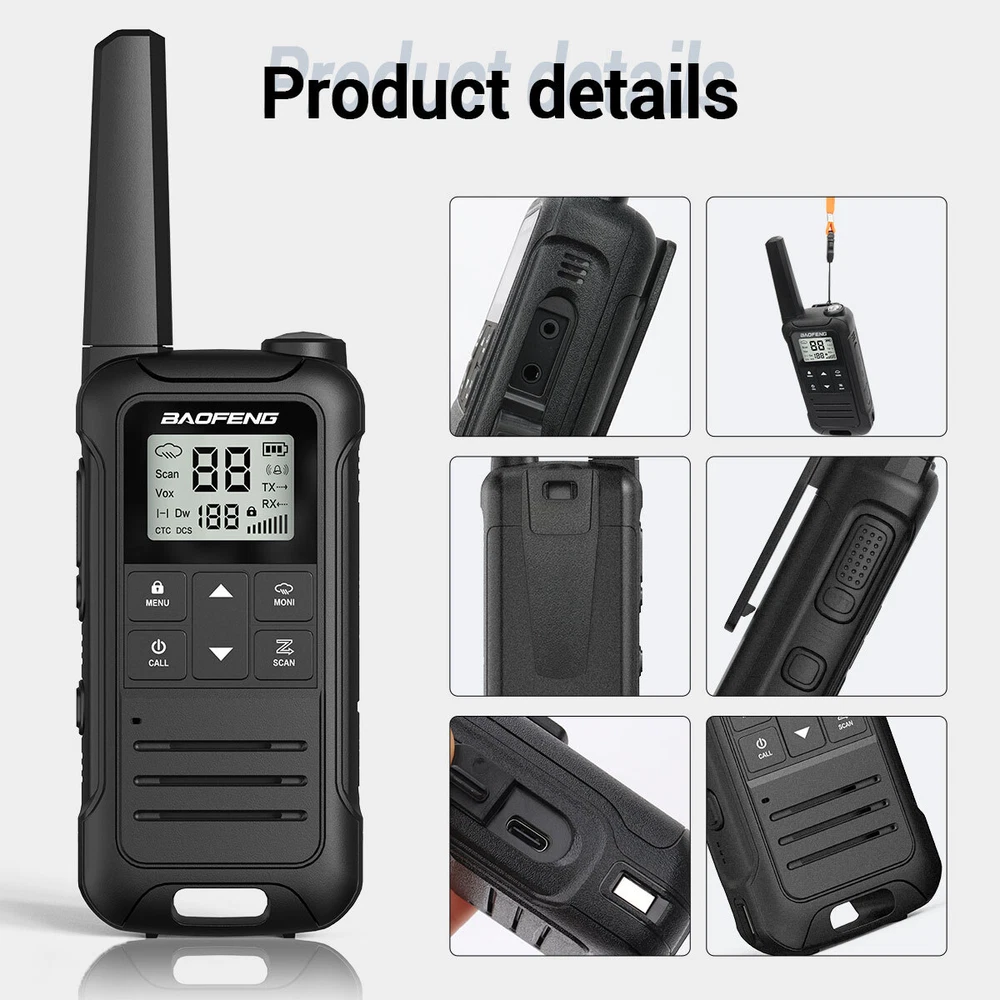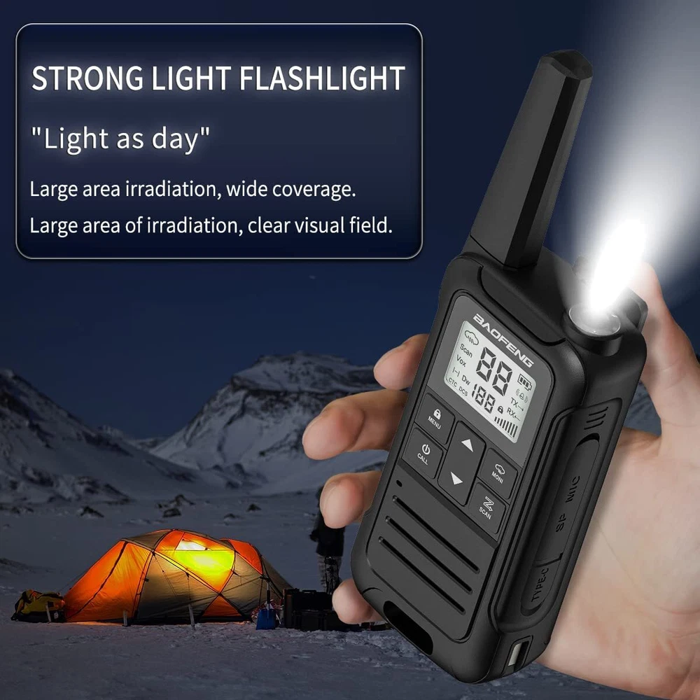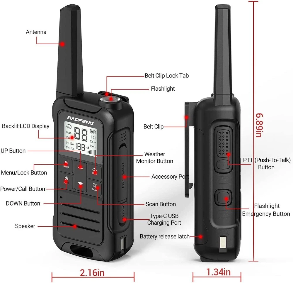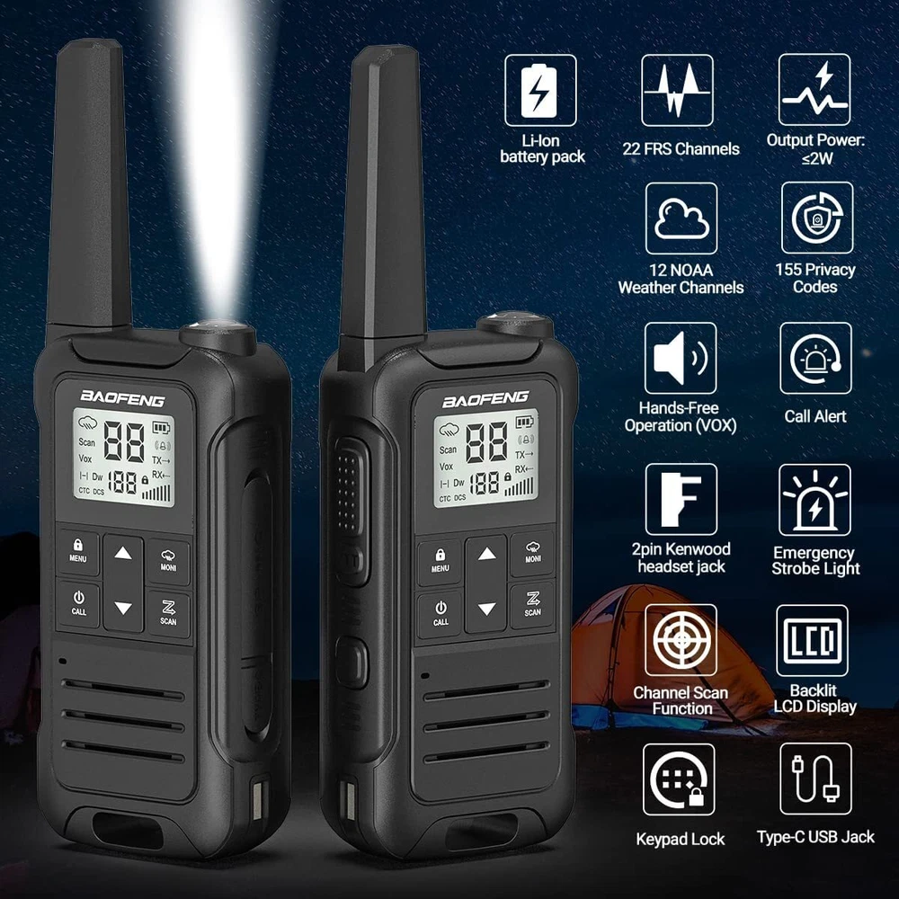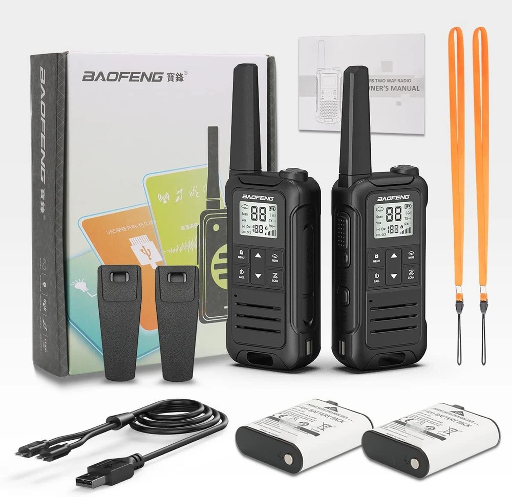 Main features: - Output power: ≤2W (channels 1-7and 15-22) - 12 NOAA Weather Channels - NOAA Weather Scan - 2 Channels Watch - Privacy Codes Scan and Store - Channel Monitor - Channel Scan Function - 155 Privacy Codes (50 CTCSS codes/ 105 DCS codes) - 10 Selectable Call Alerts - Hands-Free Operation (VOX) - Call Alert - Roger Beep Tone - Keypad Lock - Battery Level Meter - Emergency Strobe Light - Battery/Power Saver - Backlit LCD Display -Low Battery Audible Alert - TOT (Time out timer) - 2pin Kenwood headset jack - Type-C USB connector for charging - Keystroke Tones Package Including: 2 X Two way radios 2 X Belt Clip 2 X hand strap 2 X Batteries 1 X User Manual