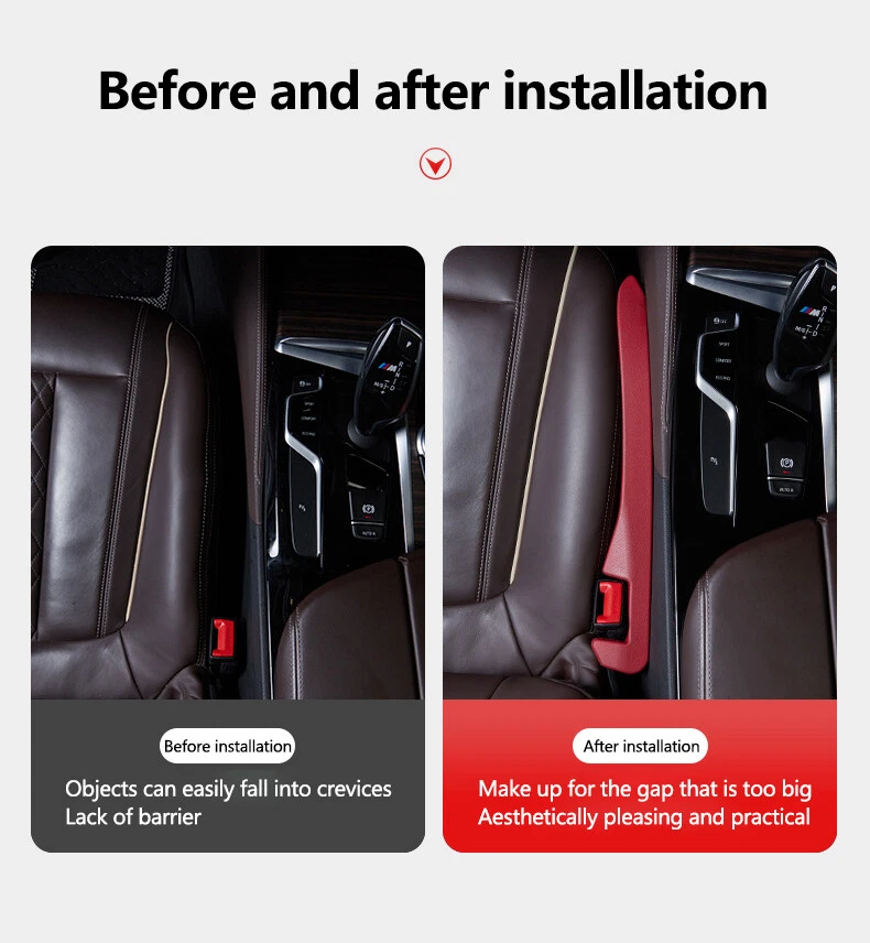 Car Seat Gap Filler 2 Pack, Universal Organizer for Car SUV Truck to Fill The Space Between Seat and Console, Car Seat Blocker and Catcher Prevent Things from Dropping, Easy to Install Specification: Material :PU Special Feature Portable Color :Red Package included:2pcs Feature: 1.【Fill the Car Seat Gap】This car seat spacer seat gap filler pad is designed to block the gap between your car, suv or truck seat and center console, preventing crumbs and small items like phone, glasses, key, card, and coin from falling into the void. 2.【Textured PU Leather Material】Leather upholstery, with a clear and textured surface, adds a different flair to a monotonous car interior. You don't have to worry about it getting dirty, just need a wet towel to clean it up. 3.【Reserved Space for Belt Buckle】Reserve space for the seat belt buckle, allowing the seat to move dynamically back and forth, without affecting the normal use of the seat belt buckle. At the same time, it can reduce the abnormal noise caused by the shaking friction of the left and right seats. 4.【Practical Sword-shaped Design】Slight curve can help the filler match the edge of the seat. It fills the gaps well and stop things into the gaps for goods. No longer lose your phone or anything else down in that abyss between the seat and center console. 5.【Universal for All Types of Vehicles】This car between seat blocker or catcher is suitable for various types of vehicles like cars, trucks, SUVs where the gap between the car seat and the center console is between 2cm and 6cm.