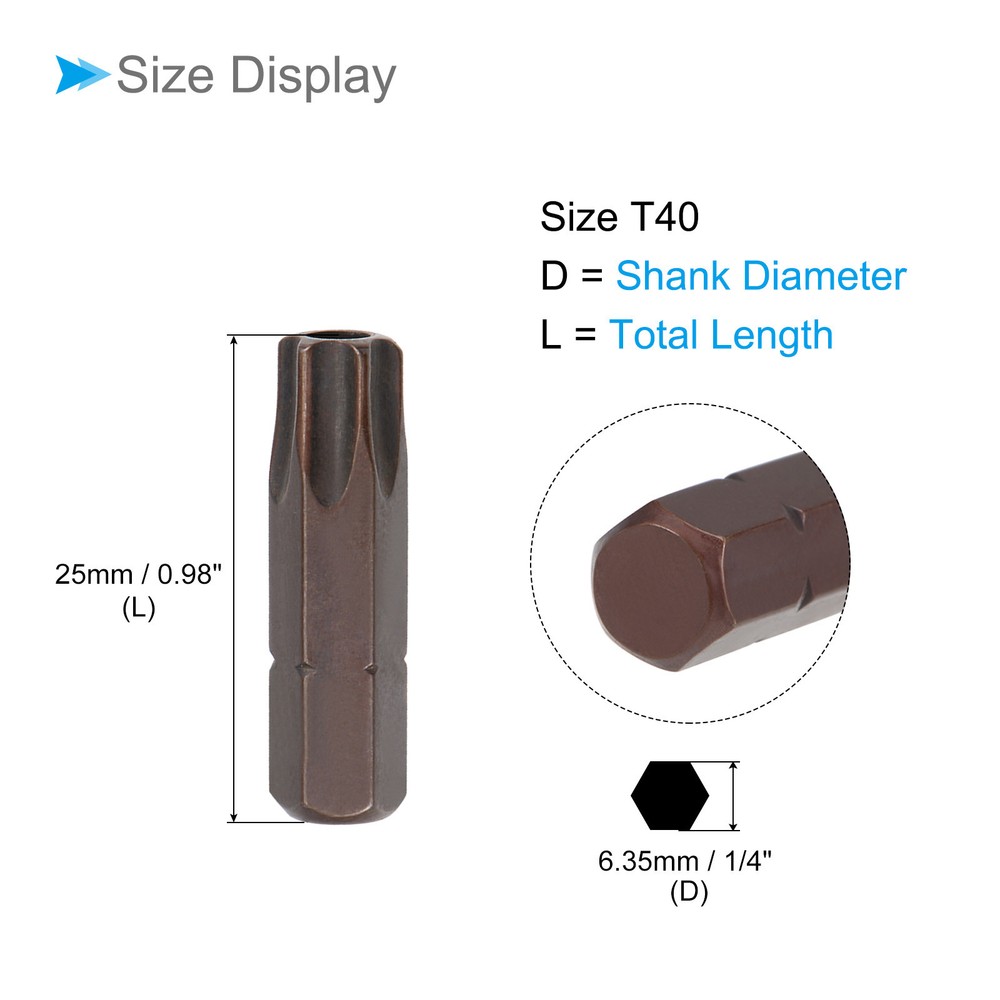 Document Attributes:* Shank Size: 1/4"* Total Length: 25mm / 0.98"* Bit Type: TT40 * Material: S2 SteelWhat Is Included:* 2 Piece x Torx Screwdriver BitApplications & Features:--- Those bits fit for electric screwdrivers, hand screwdrivers, electric drills, air drills, air batches and 1/4" screwdriver sets.--- The torx screwdriver bits are made of S2 steel, which ensures high hardness, durability and wear resistance.--- These screwdriver bits are magnetic, which can firmly absorb the screw to prevent it from falling off.--- The star head bits are easy to install on the screwdriver handle with double ear on the sides of the bit shank.Useful Tips:--- Please apply appropriate force. Excessive force may cause the bit to slip, while insufficient force may not effectively tighten or remove the screw. 2pcs Torx Screwdriver Bits 1/4" Hex Shank 25mm TT40 Magnetic Screw Driver Bit Attributes: * Shank Size: 1/4" * Total Length: 25mm / 0.98" * Bit Type: TT40 * Material: S2 Steel What Is Included: * 2 Piece x Torx Screwdriver Bit Applications & Features: --- Those bits fit for electric screwdrivers, hand screwdrivers, electric drills, air drills, air batches and 1/4" screwdriver sets. --- The torx screwdriver bits are made of S2 steel, which ensures high hardness, durability and wear resistance. --- These screwdriver bits are magnetic, which can firmly absorb the screw to prevent it from falling off. --- The star head bits are easy to install on the screwdriver handle with double ear on the sides of the bit shank. Useful Tips: --- Please apply appropriate force. Excessive force may cause the bit to slip, while insufficient force may not effectively tighten or remove the screw. Hot Item Payment 1.We accept eBay payment . 2.Payment must be received within 7 business days of auction closing. Shipping 1.We ship to your eBay or Paypal address. Please make sure your eBay and Paypal address is correct before you pay. 2.Items will be shipped within 1-3 business day when we received payment. 3.Delivery time depends on destination and other factors. Description Policy 2pcs Torx Screwdriver Bits 1/4" Hex Shank 25mm TT40 Magnetic Screw Driver Bit Attributes: * Shank Size: 1/4" * Total Length: 25mm / 0.98" * Bit Type: TT40 * Material: S2 Steel What Is Included: * 2 Piece x Torx Screwdriver Bit Applications & Features: --- Those bits fit for electric screwdrivers, hand screwdrivers, electric drills, air drills, air batches and 1/4" screwdriver sets. --- The torx screwdriver bits are made of S2 steel, which ensures high hardness, durability and wear resistance. --- These screwdriver bits are magnetic, which can firmly absorb the screw to prevent it from falling off. --- The star head bits are easy to install on the screwdriver handle with double ear on the sides of the bit shank. Useful Tips: --- Please apply appropriate force. Excessive force may cause the bit to slip, while insufficient force may not effectively tighten or remove the screw. Hot Item Payment 1.We accept eBay payment . 2.Payment must be received within 7 business days of auction closing. Shipping 1.We ship to your eBay or Paypal address. Please make sure your eBay and Paypal address is correct before you pay. 2.Items will be shipped within 1-3 business day when we received payment. 3.Delivery time depends on destination and other factors.