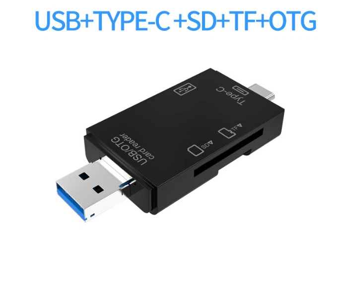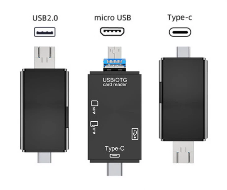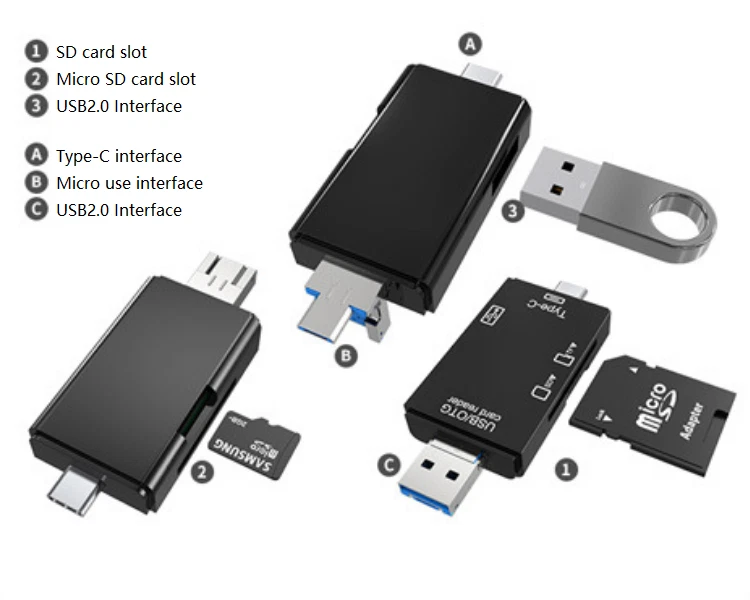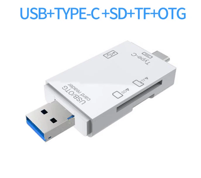 Support u disk / TF / SD Multi function card reader: USB2.0 / micro USB / type-C three in one interface. Connect peripherals, mobile phone second to computer: Support tablet computer to connect keyboard, mouse, game handle and so on, typing, game, one-step fast. Copy file required, mobile phone to computer: Support USB + SD card + TF card reading. Three interfaces, plug and play: Android micro USB / type-C / USB interface device is universal. Computer card reading, convenient office: Support type-C PC / tablet, desktop easy access to mobile phones, cameras and other devices memory card. Happy journey, share at any time: Photos taken by camera during the journey can be shared with relatives and friends at any time. Batch mapping, no need to install app: Insert the camera card and find the U disk in the file management. To view the dash cam on your mobile phone: Watch Video anytime and anywhere, driving accident, driving at night, worry free travel, no need to worry about "porcelain". Light and compact, light to go to battle: Small appearance, easy to carry on business. Fast file transfer: Type-C interface: 480mbps theoretical transmission speed, easy transmission of large files and pictures. Support 512g large capacity: The built-in intelligent chip can support 512gb U disk / memory card. No drive, wide compatibility: Compatible with windows, OS, Linux, Android and other operating systems, support various brands of TF / SD memory cards and USB devices. Product parameters: Product Name: six in one multifunctional card reader Style: new upgrade of USB2.0 Interface: USB + type-C + micro USB Color: high end Black / elegant white Data interface: USB2.0 × one Reader slot: TF slot X1 / SD slot X1 / OTG interface Shell material: ABS environmental protection plastic Product size: 76.5 * 28 * 10.6mm Quantity: 2pcs