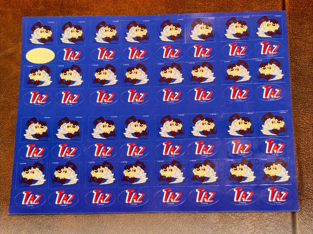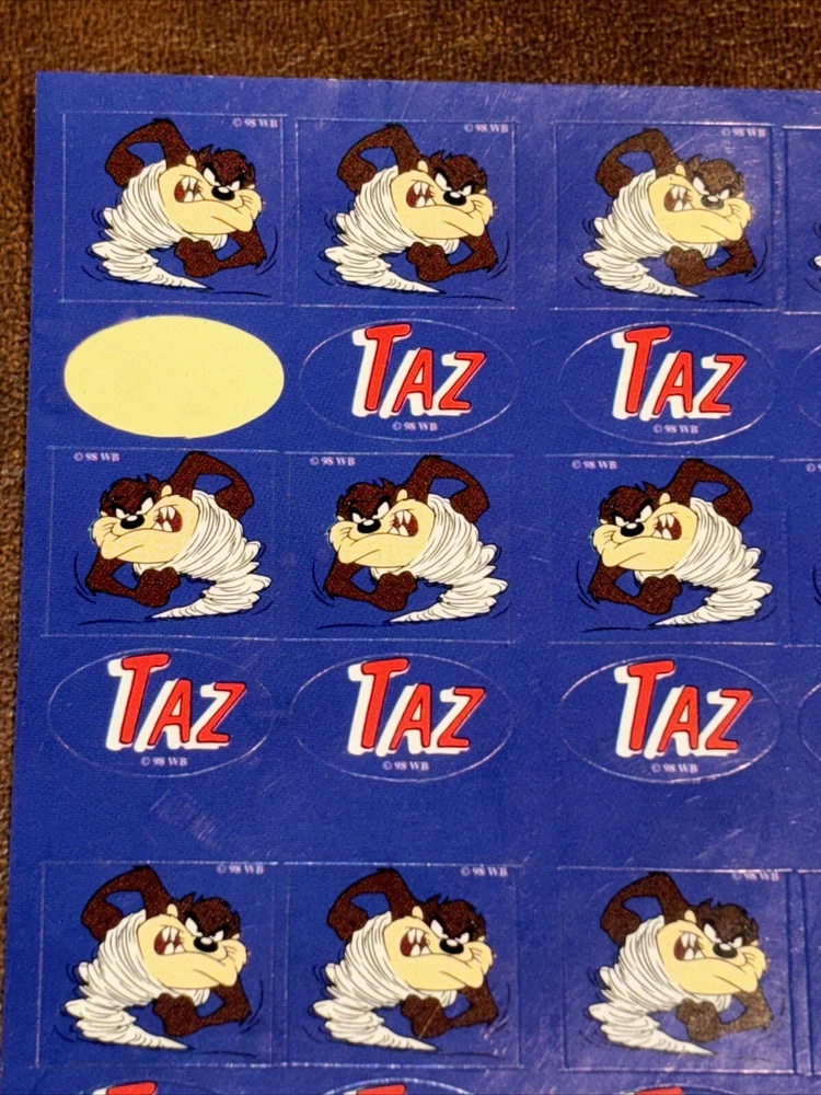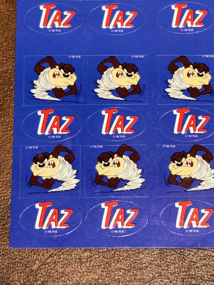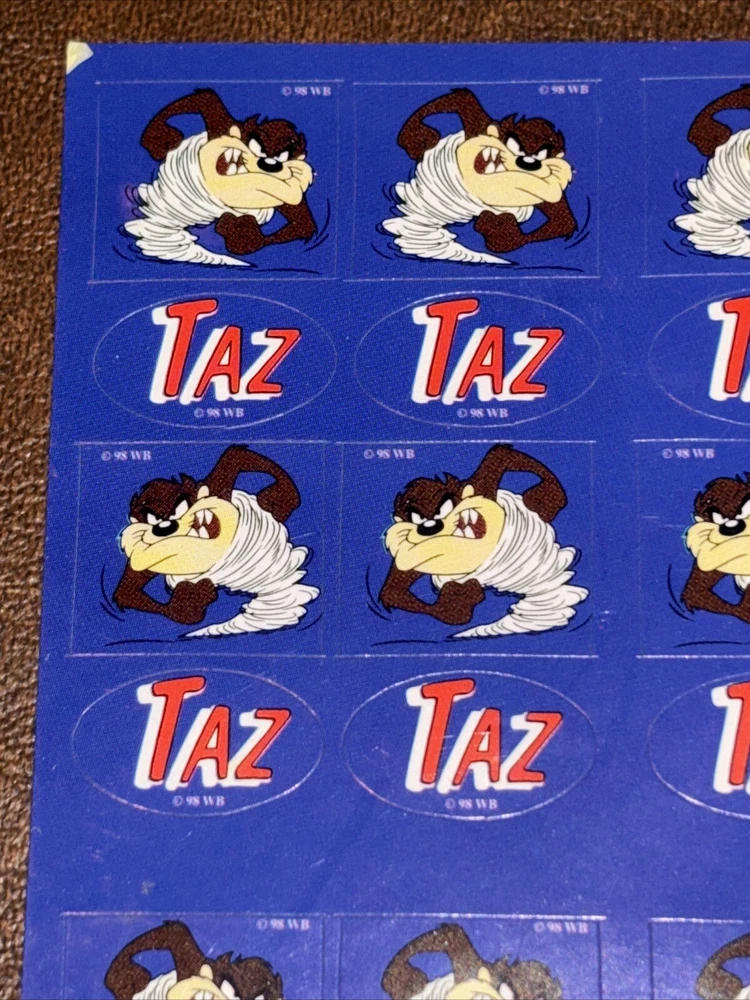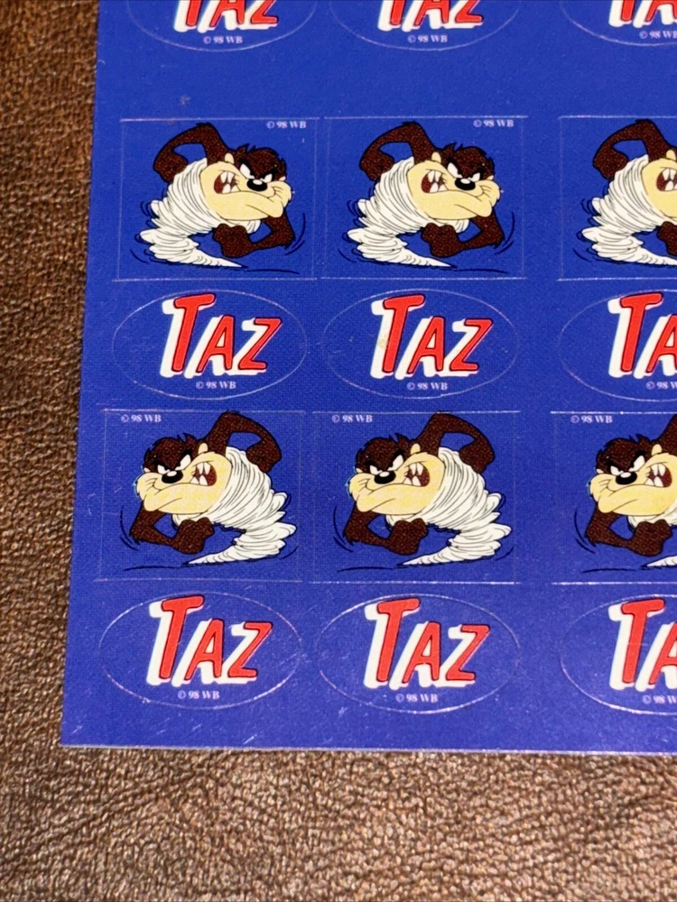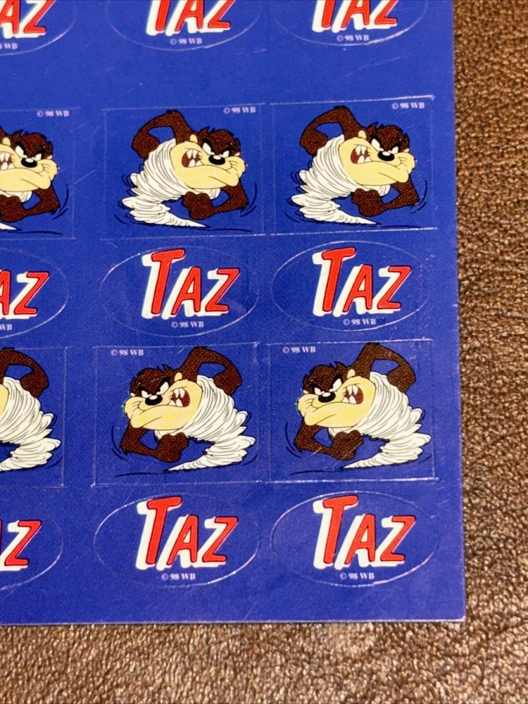 Both sheets of sticker hold no signs of damage or ware. With each sheet having 64 sticker total With 2 sheets having 1 sheet missing 1 (one) sticker. 127 total stickers. Sold as pictured. This vintage Looney Tunes sticker sheet features the beloved character Taz, the Tasmanian Devil. The colorful design and interactive features make it a must-have for any fan of cartoon and TV characters, art, fantasy, animation, and periods and styles. Made in the United States in 1990, this sticker sheet is a rare find for collectors of animation merchandise and other unique pieces. Add it to your collection or use it to decorate your personal space.