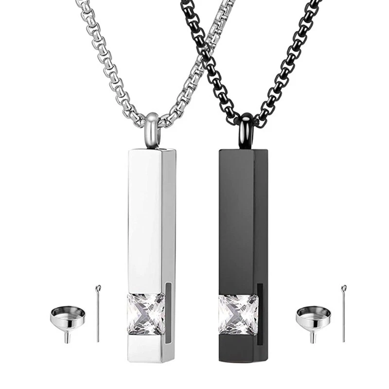 2x Cremation Urn Pendant Necklace for Memorial Stainless Steel with Zircon Features: Memorial Ashes Necklace: Keep your loved ones close to your heart for always. Cremation Jewelry, also known as funeral jewelry, memorial jewelry, or remembrance jewelry can hold the ashes or a lock of hair/fur of your loved ones, dried flowers. Large Space Large space You can easily fill ashes inside It is size-able enough to hold a nice amount of ashes. Hand-crafted urn necklace, ashes necklace, jewelry for urns, cremation urn, memorial jewelry, or remembrance jewelry is used as a remarkable way to memorialize your loved ones. It is available in the form of pendants, rings, bracelets, necklaces, lockets A meaningful present for family and to cherish loved ones will have special meaning, for storing items as a souvenir. Cremation Urn Pendant: The urn necklace is Stainless Steel, Pendant size:approx.38x6mm/1.49x 0.23in; chain length: 60cm/23.62inch, it works great for about everyone. Specifications: Stainless Steel Pendant:Approx.38x6mm/1.49x0.23inch Necklace:Approx.60cm/23.62inch Package Includes: 2 Pieces/set Pendant Necklace note: Please allow 1-2cm errors due to manual measurement,pls make sure that you do not mind before you order. Due to the difference between different monitors, the picture may not reflect the actual color of the item.