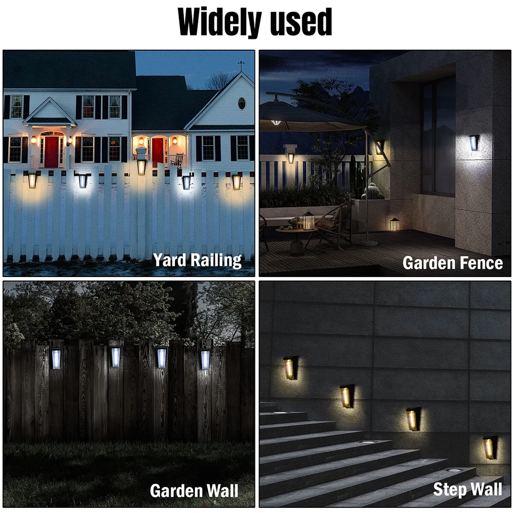 2x Solar LED Deck Lights Path Garden Patio Pathway Stair Step Fence Lamp Outdoor 2x Solar LED Deck Lights Path Garden Patio Pathway Stair Step Fence Lamp Outdoor 100% Brand New & Excellent quality Free & fast shipping, with tracking number provided Multicolor[5 Modes] Feature: * Solar Charging: The Solar Wall Light can be charged by solar energy, absorbing energy during the day and automatically lights up at night. * Outdoor Waterproof: The Solar Wall Light has IP55 waterproof rating, fearless of wind and rain, and can be used normally on rainy days. * ABS Material: The Solar Wall Light is made of ABS material with excellent impact resistance, which can effectively prevent damage due to accidental impact during use. * Intelligent Light Control System: Solar Wall Light adopts intelligent light control system, which can intelligently sense the change of external light and automatically turn on and off the light. * Easy to Install: Solar Wall Light is an independent power generation system, no need to lay complicated wires and cables, installation is more convenient and quick. Specification: Solar Panel: polycrystalline silicon 2V*130mA Battery Parameters: Ni-MH AA 1.2V/600mA Voltage: 1.2V Power: 3W LED Parameters: 6LED Charging Method: solar charging Charging Time: >8 hours Working Hours: >8 hours Waterproof Grade: IP55 Switch Mode: hand control + light control Material: ABS Color: black Light Color: Colorful Size: 6x7x12cm/2.36x2.76x4.72in Package Includes 2 x Solar Wall Lights 2 x Screws 2 x Expansion Tubes Warm White+White Light[8 Modes] Feature: * Solar Charging: The Solar Wall Light can be charged by solar energy, absorbing energy during the day and automatically lights up at night. * Outdoor Waterproof: The Solar Wall Light has IP55 waterproof rating, fearless of wind and rain, and can be used normally on rainy days. * ABS Material: The Solar Wall Light is made of ABS material with excellent impact resistance, which can effectively prevent damage due to accidental impact during use. * Intelligent Light Control System: Solar Wall Light adopts intelligent light control system, which can intelligently sense the change of external light and automatically turn on and off the light. * Easy to Install: Solar Wall Light is an independent power generation system, no need to lay complicated wires and cables, installation is more convenient and quick. * Working Mode: Solar Wall Light has 8 working modes, 1 speed white light, 2 speed warm light, 3 speed full mode cycle, 4 speed dual color fast cycle, 5 speed dual color slow cycle, 6 speed dual color gradient, 7 speed dual color fast cycle fast flash, 8 speed dual color mixed fast flash. Specification: Solar Panel: polycrystalline silicon 2V*130mA Battery Parameters: Ni-MH AA 1.2V/600mA Voltage: 1.2V Power: 3W LED Parameters: 6LED Charging Method: solar charging Charging Time: >8 hours Working Hours: >8 hours Waterproof Grade: IP55 Switch Mode: hand control + light control Material: ABS Color: black Light Color: warm light + white light Size: 6x7x12cm/2.36x2.76x4.72in Package Includes: 2 x Solar Wall Lights 2 x Screws 2 x Expansion Tubes Payment Shipment Return Feedback Contact us Payment * We Accept Payment via PAYPAL ONLY . * Payment Must be Made within 4 Days of Auction Closing. * Non-Payment may Result in a UPI (Unpaid Item) being Put on Your Account. eBay will Automatically Close Your Account if You Accumulate 4 UPI's total. * Please List Your Special Requests ( Color, Size, Packages, etc. ) in the PAYPAL NOTES SECTION when you make payment. Shipment * Shipping will be handled in 24 business hours after payment got. Ship to PayPal Address only , please confirm it before paying. * Please leave your phone number in the address in case there is an address problem. Return * Returns and Exchange accepted within 60 Days. * Refund will be given as Money Back. * Free Return shipping. * Before you return the defective item,please email us for the RMA, and we will reply you in 24 hours in working days. If you do not get reply please check if your mail box has refused our reply or not, then send to us again, thanks! Feedback If you are satisfied with the transaction please remember to leave us a positive feedback (5-Star) will be much appreciated. Please DO remember to contact us before leaving the neutral (3 stars) , negative feedback (1-2 stars) or opening a case/dispute if any problem caused by the item . Normally your email would get replied within 24 hours on working day and your issue would be followed up carefully until we've reached a consensus! We will try our best to solve the problem and leave you a happy shopping mood here. Thank you! We are not only selling good items, but also selling with excellent after-sale service and a strong sense of responsibility. We will always try our best to find you a satisfactory solution if any problem takes place! Contact us Email muchbuy-outlet at Paypal registered email or ebay message.