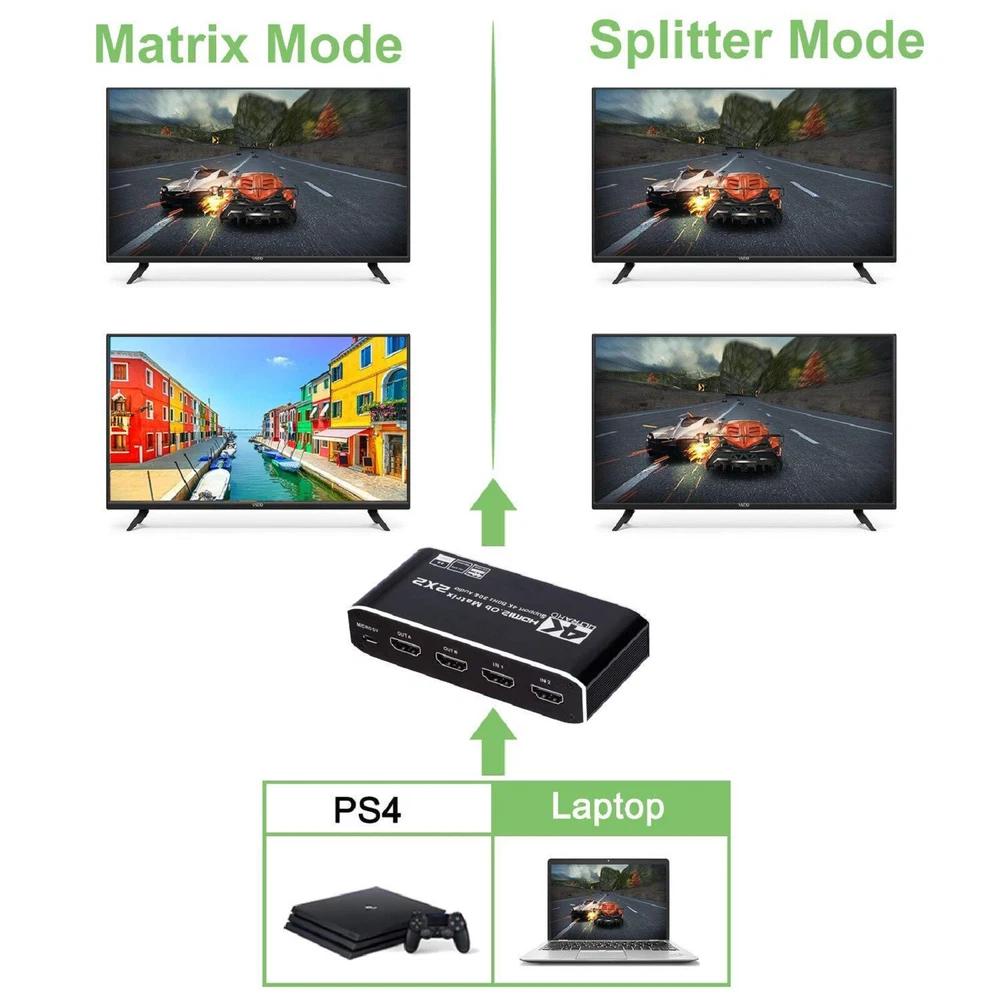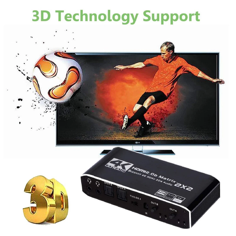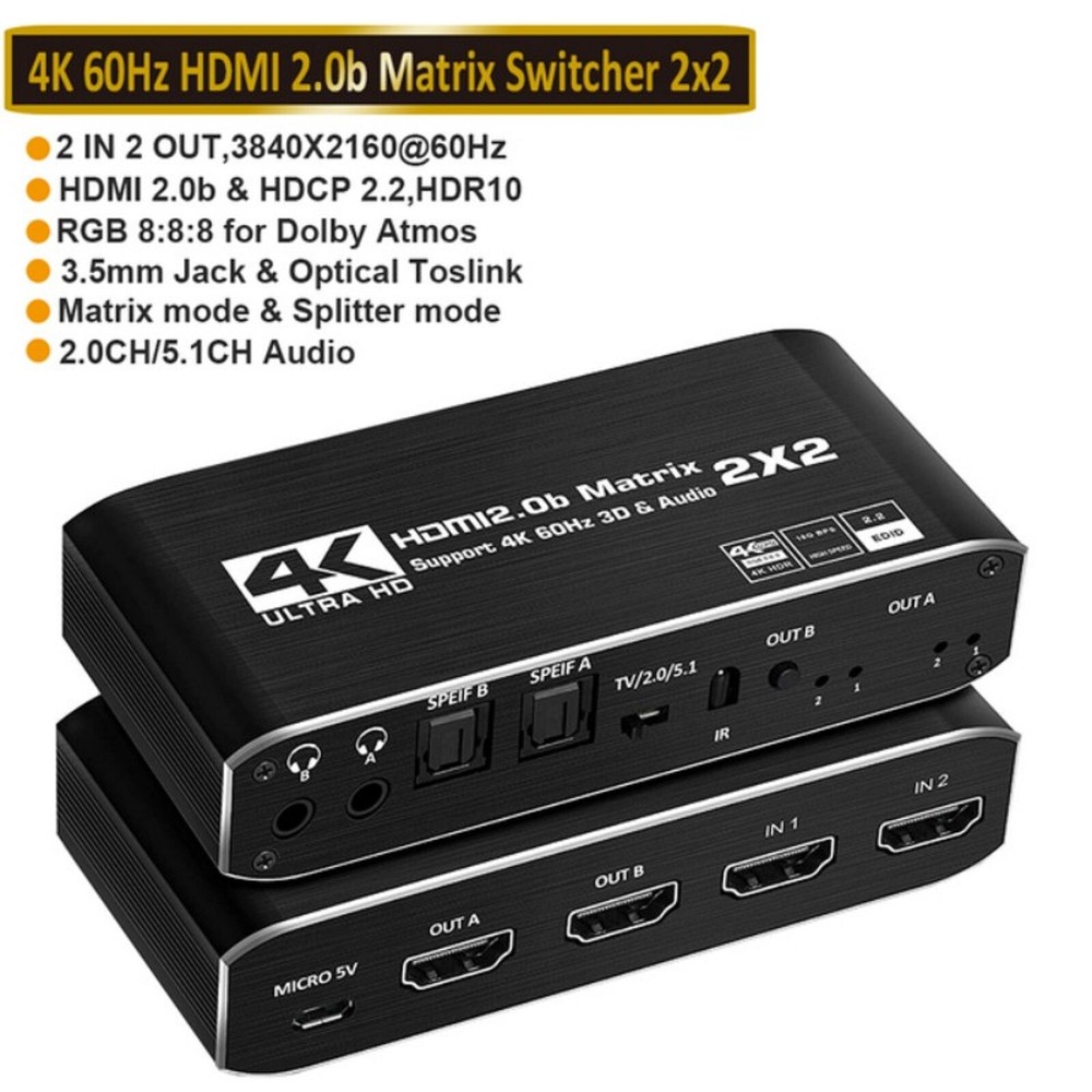 This 2x2 HDMI matrix switcher is a game-changer for my home entertainment setup! It effortlessly switches between my PS4 and laptop, delivering crisp 4K@60Hz video and immersive audio. The plug-and-play design makes setup a breeze, and the compact size fits perfectly behind my TV. I love how it supports 3D and multiple audio formats—perfect for movie nights. No lag, no signal loss, just flawless performance. Highly recommend for anyone needing a reliable HDMI switcher!