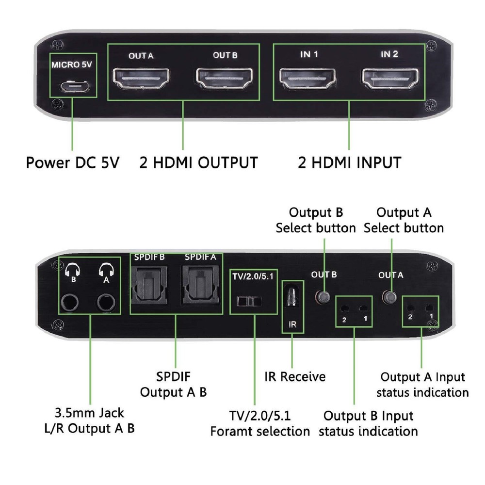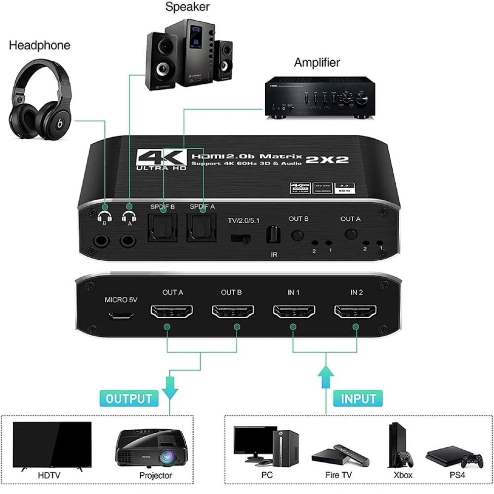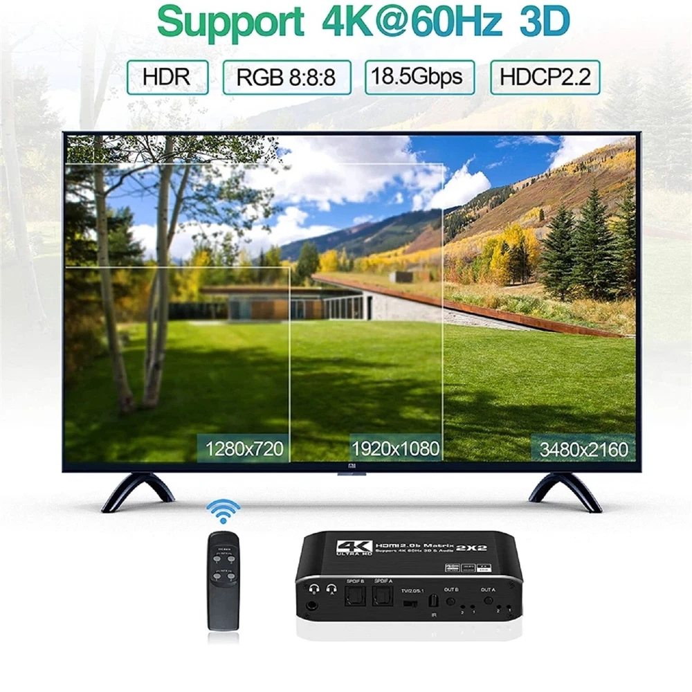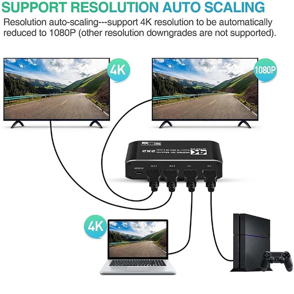 This 2x2 HDMI matrix switcher is a game-changer for my home entertainment setup! It effortlessly switches between my PS4 and laptop, delivering crisp 4K@60Hz video and immersive audio. The plug-and-play design makes setup a breeze, and the compact size fits perfectly behind my TV. I love how it supports 3D and multiple audio formats—perfect for movie nights. No lag, no signal loss, just flawless performance. Highly recommend for anyone needing a reliable HDMI switcher!