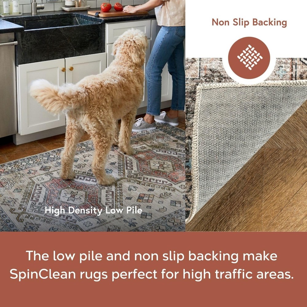 Introducing our SpinClean Machine Washable Collection, the ultimate blend of style, convenience, and practicality for any home. Designed with today's busy lifestyles in mind, this rug is more than just a beautiful addition to your space—it's a game-changer in home maintenance and comfort. SpinClean washable rugs are fully machine washable, making this a -safe and pet-safe rug as well as the perfect high-traffic area rug. Gone are the days of worrying about spills and stains; simply place your rug in the washing machine, and it will come out looking as good as new. The ease of cleaning not only saves you time but also extends the life of your rug, ensuring that it remains a stylish feature in your home for years to come. Whether you're looking to add a pop of color with a living room rug, a touch of warmth to your bedroom, an inviting front door rug, or a functional runner for your kitchen, our collection has you covered. It’s machine washable and stain-resistant features, combined with a non-slip backing, make it an ideal choice for any home. Need a hall rug to enhance your hallway's look? Or perhaps a grey and white area rug to elevate your modern decor, these rugs offer versatility in any space. The SpinClean collection is proof that you don't have to break the bank to achieve a stylish, comfortable, and low-maintenance home environment. Stylish and Practical: The SpinClean Machine Washable Collection offers an affordable, low-maintenance solution without compromising on style. This collection features a wide array of designs, from vintage to southwestern, boho, abstract, and modern geometric. Machine Washable for Easy Care: Maintaining this rug is a breeze with regular vacuuming and spot cleaning to preserve its beauty. For tougher stains, just toss your rug in the washing machine on a gentle cycle with cold water. We recommend line drying or using the air-only drying cycle without heat. Designed for Every Room: This area rug is kid and pet-friendly, making it ideal for any space in your home that needs an elevated touch. It ensures lasting style in your living room, bedroom, dining room, kitchen, bathroom, home office, dorm room, as a hall runner or entrance rug. Sleek and Functional Pile Height: The low pile of this area rug brings a sleek, sophisticated touch while being easy to clean and maintain. Designed to be placed conveniently under furniture and doorways or as an indoor entrance rug, this is the perfect high traffic rug for your home. Stain-Resistant Material: Our machine washable rugs are crafted from synthetic materials that are stain-resistant, lightweight, and easy to clean. The stain-resistant properties ensure that the rug maintains its vibrant colors and patterns, even after enduring the demands of everyday use. If your rug is located in an area that receives direct sunlight, regularly rotate your rug to maintain its appearance. Durable Design with Non-Slip Backing: This rug’s power-loomed design is made to endure everyday wear and tear, ensuring long-lasting durability. The integrated non-slip backing keeps the rug securely in place while the reinforced, quality-stitched edges enhance its resilience. For added comfort, pair it with of our rug pads for an extra cushioned feel underfoot.