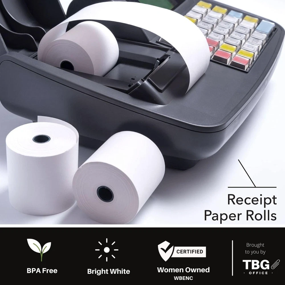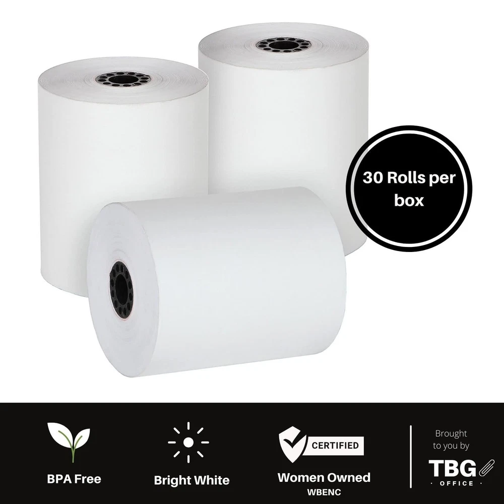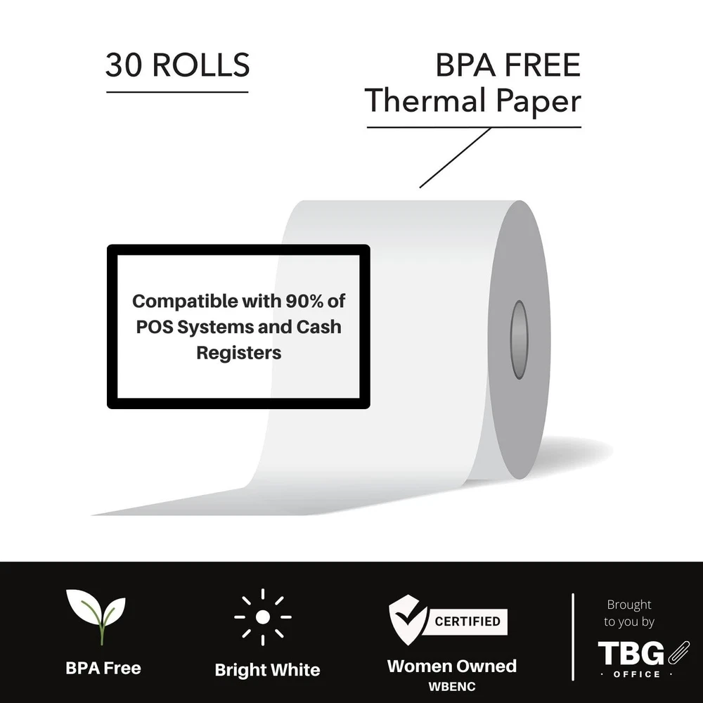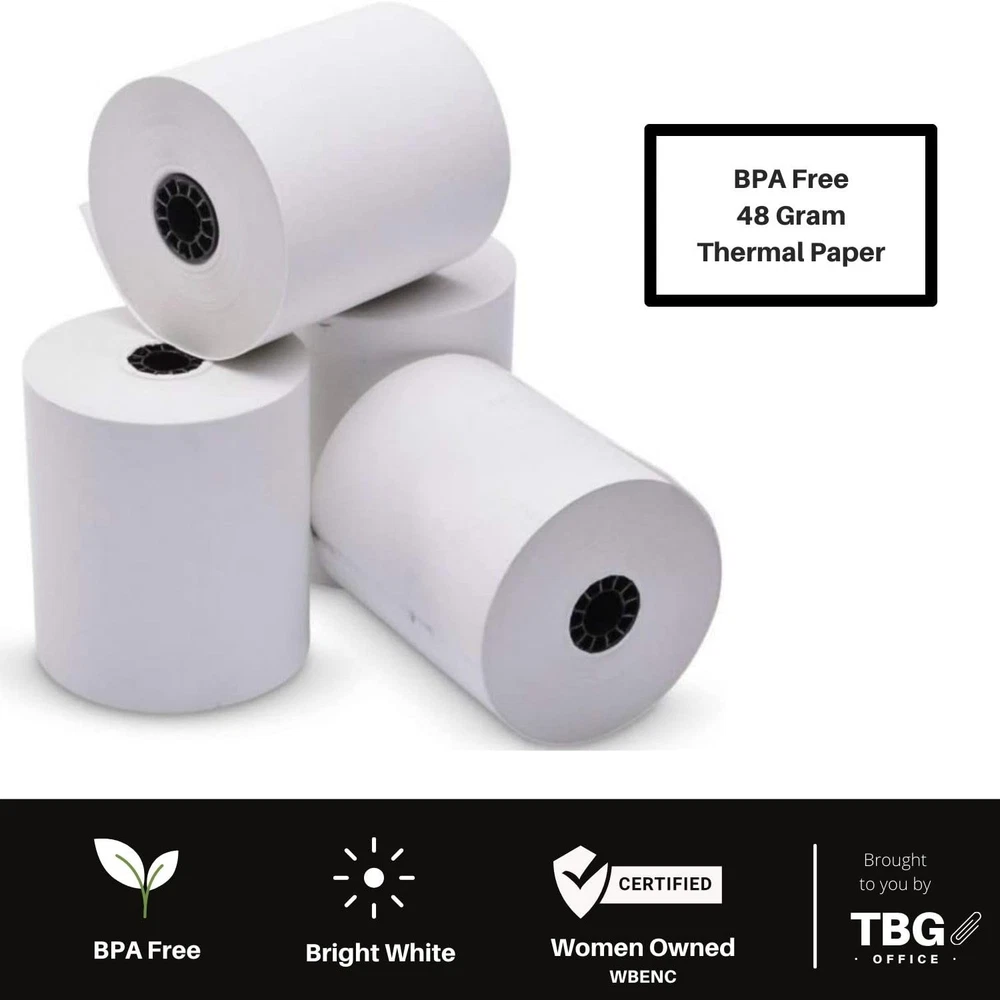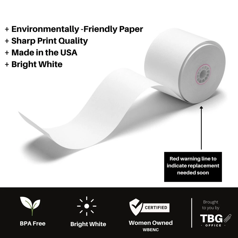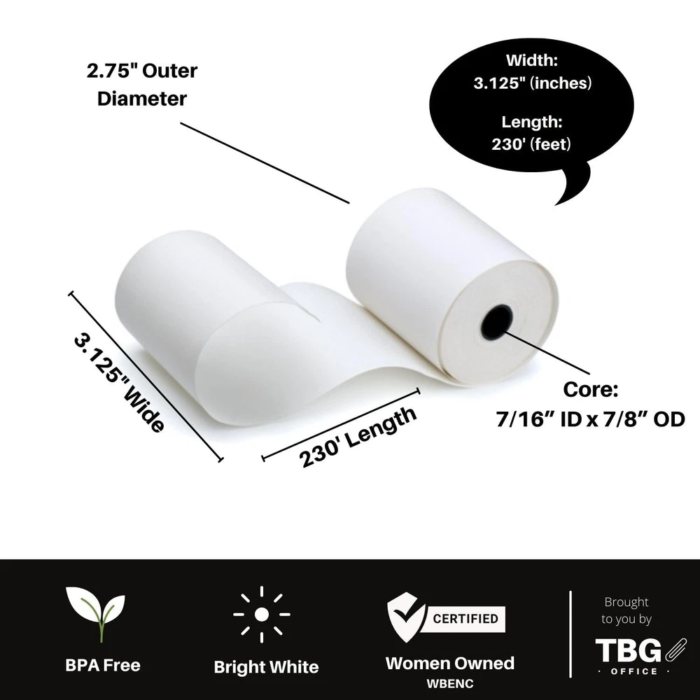 3 1/8" X 230' High quality / 48 Gram / BPA free paper / Made in USA Our thermal paper register rolls produce high quality, easy to read receipts for customers and records. Each roll has a vibrant white surface that dries instantly ensuring that text is crisp and durable Fits most common cash registers and POS systems including Epson, Suremark/IBM, Clover, Cognitive TPG, Ithaca, NCR, and others Dimensions: Roll width: 3 1/8 inch (80 mm); Length: 230 feet (70 meters)
