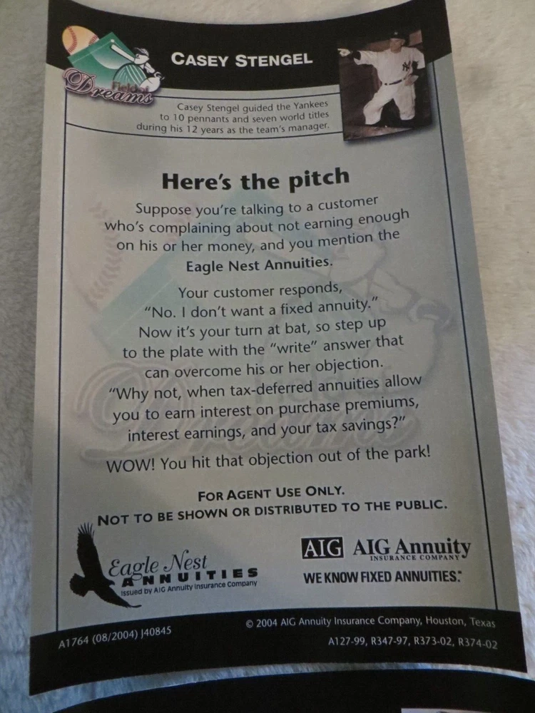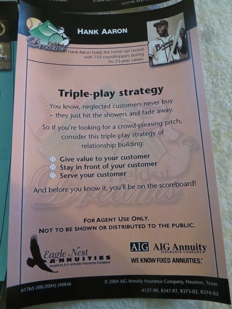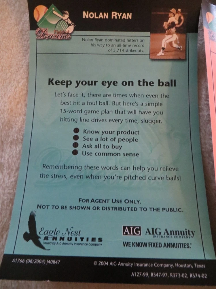 3 2004 Agent Only Baseball Mini Posters Field of Dreams w/ Baseball Bat Pen Nolan Ryan, Hank Aaron, Casey Stengel. Posters measure 8 1/2 x 5 1/2.