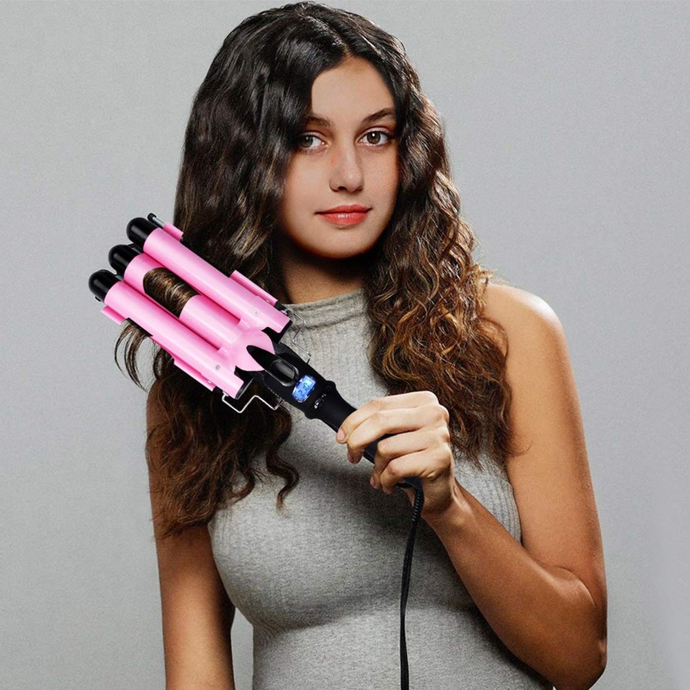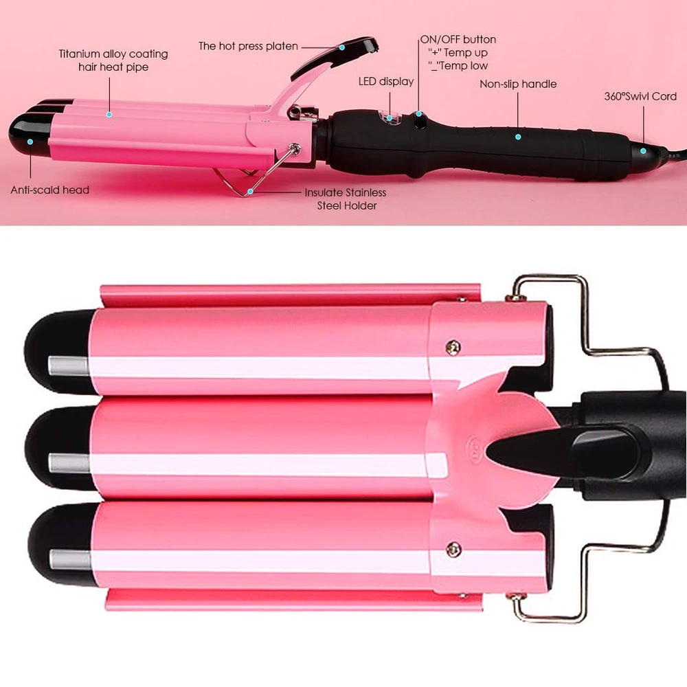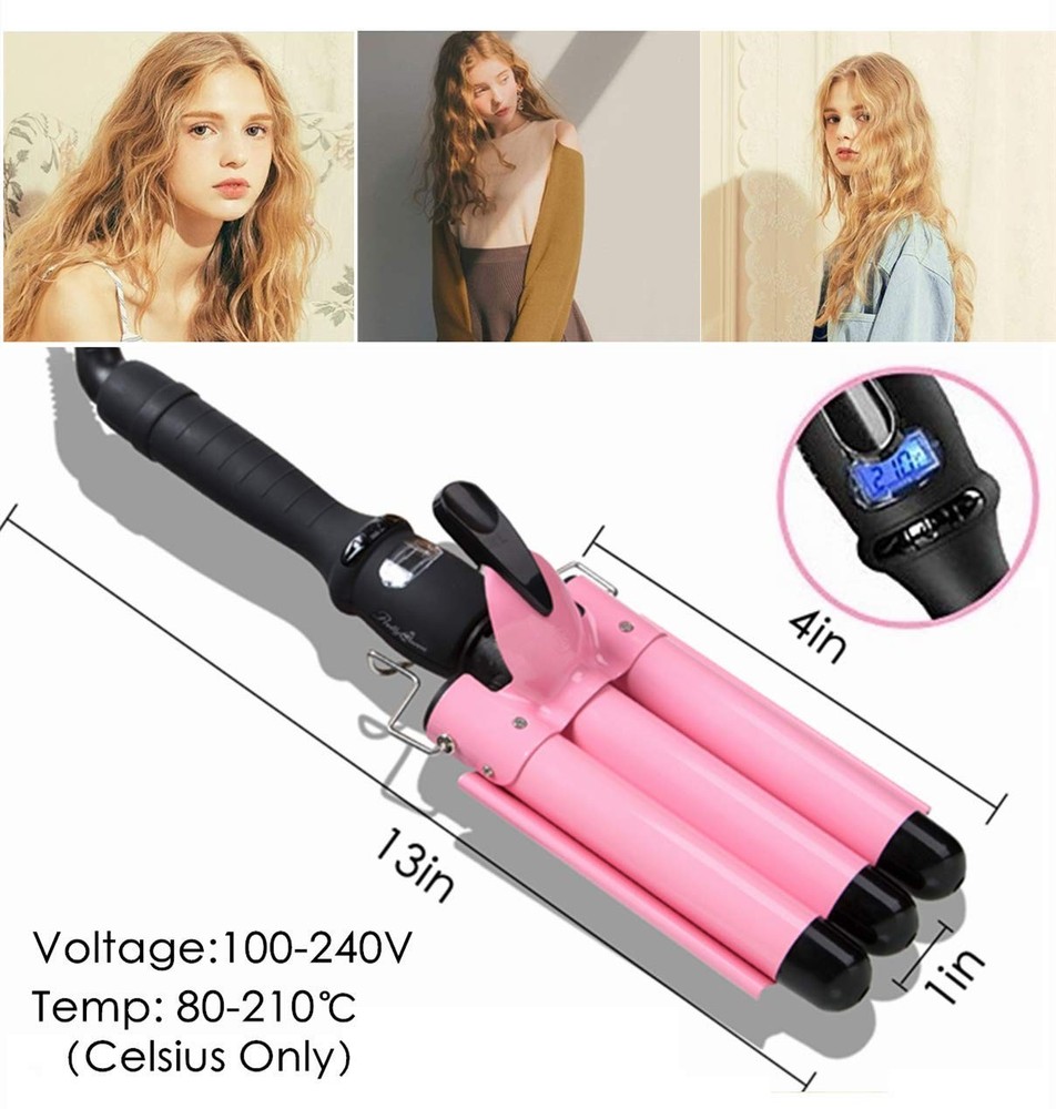 Hair Crimping Iron Curling Iron 3 Barrel Professional Hair Waver 1 inch 25mm Fast Heating Hair Curler with LCD Display Temperature Adjustable Ceramic 3 Barrel Curling Iron 1 Inch for Woman LCD Temperature Display,Triple Barrel Hair Curler Adjustable from 80℃ to 210℃ The 3 barrel hair waver release large amounts of negative ions with the tourmaline ceramic technology when works, which reduces the damage to the hair and make your hair healthier and natural. 3 Barrel Hair Waver - Tourmaline Ceramic S-Waver Creates Loose Sexy S Waves - Tourmaline Ceramic Barrels Help Create Softer, Shinier Waves Without Frizz, Will Give You Flexible, Lustrous, Natural Curl Look Hair - PTC Heating System, Lower Power Consumption - Smooth Item surface, Heat-Resistance, Offering Long Working Time - Temperature Adjustable, Anti-skid handle, LCD screen, Convenient to Use 3 Barrel Curling Iron Description - Color: Pink - Voltage: 110V-220V - Frequency: 50-60HZ - Power: 50-80W - Cable Line Length: 2.5m - Diameter of the barrel: 25mm - Temperature:80-210℃ (176-410℉) Warm Tips - Please do not touch the hot part when heating your hair to avoid scald. - Please do not use sharp things to prevent scratching the curling iron. - Please do not use water to clean the hair curler. Scrub the hair curling iron with cloth or tissue. - The three barrel curling iron will have residual heat after using, please place the hair waver iron on heat-insulation objects and do not touch. - Please use the three curling iron far away from bathroom, water and wet place. - Please Allow a Little Color Difference Because of Different Monitor. - Please spare approximately 1 to 2 inch section of hair to curl to avoid the unsatisfying effect. ✿HAIR PROTECTION OF 3 BARREL CURLING IRON - When the ceramic 3 barrels hair curling wand works,it will release lots of negative ions with the tourmaline ceramic technology, reduces the damage to hair and make your hair healthier, natural and hair shape more lasting, shiny forever. ✿LCD ADJUSTABLE TEMPERATURE - When the 3 barrel curling iron heats up, you can adjust the temperature from 80℃ to 210℃ / 176-410℉(SHOW Celsius ONLY ) which is displayed on the LCD screen. Just choose the right temperature according to your hair. ✿FAST HAIR STYLING - The 3 barrel hair waver curler heats up extra fast,and you can adjust the temperature of the heating according to your hair styles. Easy to give you a fashion look in just few minutes,also long lasting hairstyle,faster than single barrel curling wand! ✿FOR ALL HAIR TYPES:The dual voltage 3 barrel curling iron measures 13 inch in length and 4 inch in width,and barrel size is 1 Inch to suit both long and medium-length hair.Anti-skid ergonomic handle, 360 degree swivel power cord and easy operations of curling wand make your hair curling at home safer. ✿【730 DAYS LONG TIME 】–When you order this ceramic hair crimper iron for women, you are protected by a 730-days .Do not miss it out, just buy one and enjoy a silky, wave, cute, stylish and professional result!