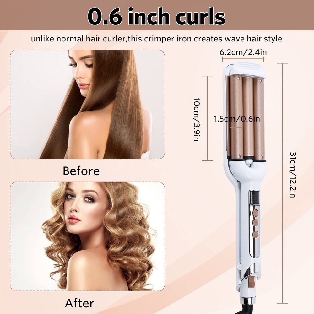 3 Barrel Hair Crimper Iron Professional Curling Wand 0.6 Inch Ceramic Fast Heating Crimping Iron for Deep Waves Valentines Gifts Product Details Product Benefits: Curling Shape: Barrel Brand: SOMOYA Hair Type: Curly Material: Ceramic Product Dimensions : 4 x 4 x 4 inches; 9.17 ounces Date First Available : May 21, 2024 Manufacturer : SOMOYA Country of Origin : China Best Sellers Rank: #381,061 in Beauty & Personal Care (See Top 100 in Beauty & Personal Care) #706 in Hair Curling Wands #706 in Hair Curling Wands Customer Reviews: 4.1 4.1 out of 5 stars 35 ratings FAST HEATING:The temperature from 100C(212F) up to 230C(446F),it gets hot very quickly, and takes about 60 seconds for the temperature to rise to 230C. Perfect for shaping/curling professional hair wave, negative ion for hair care. Let you become a professional hairstylist at anytime and anywhere. ERGONOMIC DESIGN & EASY TO USE: Designed with anti skid matte handle and anti scald top, heat insulation black front part, use more safer. With stand for placing, avoid hair curler contacting with the desktop directly, it is harmless to your hair when heating EASY TO USE & CURL: 360 rotatable power cord stretches up to 6.56ft/2.0 m - 40% longer than similar hair crimper iron; Built-in stainless steel support lets you easily lay the 3 barrel crimper iron to cool down FOR ALL HAIR TYPES: 12 inch/31cm in length ,1.9 inch/4.9cm in width ,The hair curler is loose wave that fits for Dating, Party, Wedding. Always show your different and unique hair style according to different occasions with this ceramic curling iron,makes you get a lot of compliments from others.