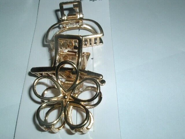 Three 2" wide golden metal hair claw clips still on original "Bijoux" card. One is a flower one a square and one a half circle and each has a spring top, never worn and still on original card. HALF PRICED and really cute on a ponytail. Condition is excellent. Three for the price of one.