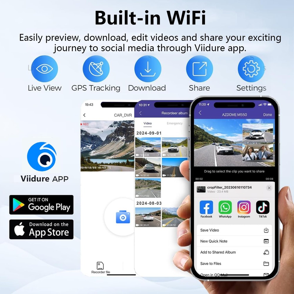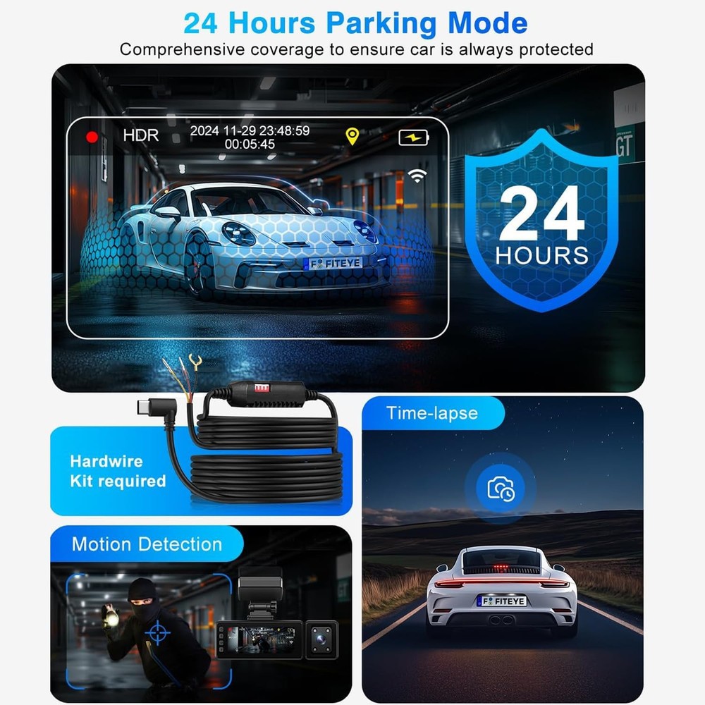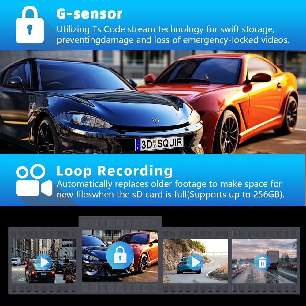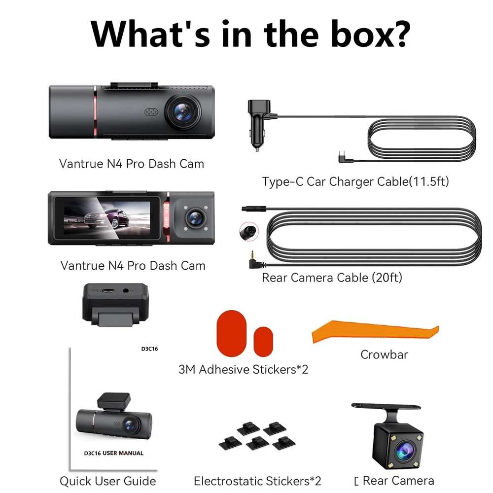 【3-Channel Front Inside Rear Dash Cam】The Dash Cam is a triple channel dash cam with 170° front camera, 150° inside camera and 150° waterproof rear camera, which can simultaneously monitor the front, rear, and interior of your vehicle while providing high quality video at 4K that allows you to see a clearer image at any angle without any blurring, record more evidence for insurance disputes. Perfect for family trips, Novice drivers. 【4K HD Dash Camera for Cars】Our CA316 car dash cam provides a true 2560*1440P resolution front cam, which can seamlessly record up to 4K HD video, ensuring crystal-clear visibility of license plates and road signs. And The rear camera with its convenient 20ft extension cable makes it is suitable for various vehicles such as cars, SUVs, jeeps, and trucks (Non-App Sync) 【Clearer Night Vision】 Thanks to 6-glass lens, big aperture and night vision technology, the CA316 car camera performs well in color precision and clarity whether day or night.4 Light of the dashcam face to the cabin, accurately capture clear footage of the driver and passengers even when the cabin is under low light conditions or completely dark, ideal for rideshare drivers such as Family car and Taxi. 【Built in G-sensor & Loop Recording】This triple dash cam front and inside can automatically overwrite the oldest videos with the latest videos even if the insert memory card reaches its max storage to achieve seamless loop recording;The Built in G-sensor can lock and save important footage when collision happens during driving and parking and will not be overwritten. 【24 Hours Parking Guard】The parking monitor of the car dash cam front and back will be automatically activated to records emergency videos upon detecting collisions, providing evidence in case of theft or accidents while parked.To achieve this parking mode function, an extra car accessory- ACC hardwire kit is required (not included in the package), the Time-Lapse Recording keeps recording continuously with low power consumption and low frame rate. Provides 24 hours protection to you cars. 【support 256G storage】Our dash cam inside widely comes with 32GB sd card, which is inserted into dash cam, and it supports max up to 256GB memory card, allowing you to save more driving memory. 【Easy Installation & Operation】User-friendly operation interface and illustrated instruction make the car dash camera very easy for every beginner to install and use.We provide complete installation tools so that each user simply mount the 3 channel dash cameras on the windshield and fix the wires to plug in the power cord.That is a straightforward installation process. 【Dedicated Customer Service】Enjoy customer service with every dashcam, we offer 2 years maintenance and 24*7 technical support.Questions or technical support for our front and rear dash camera, please reach out to us via Amazon message, all message will be answered within 24 hours.