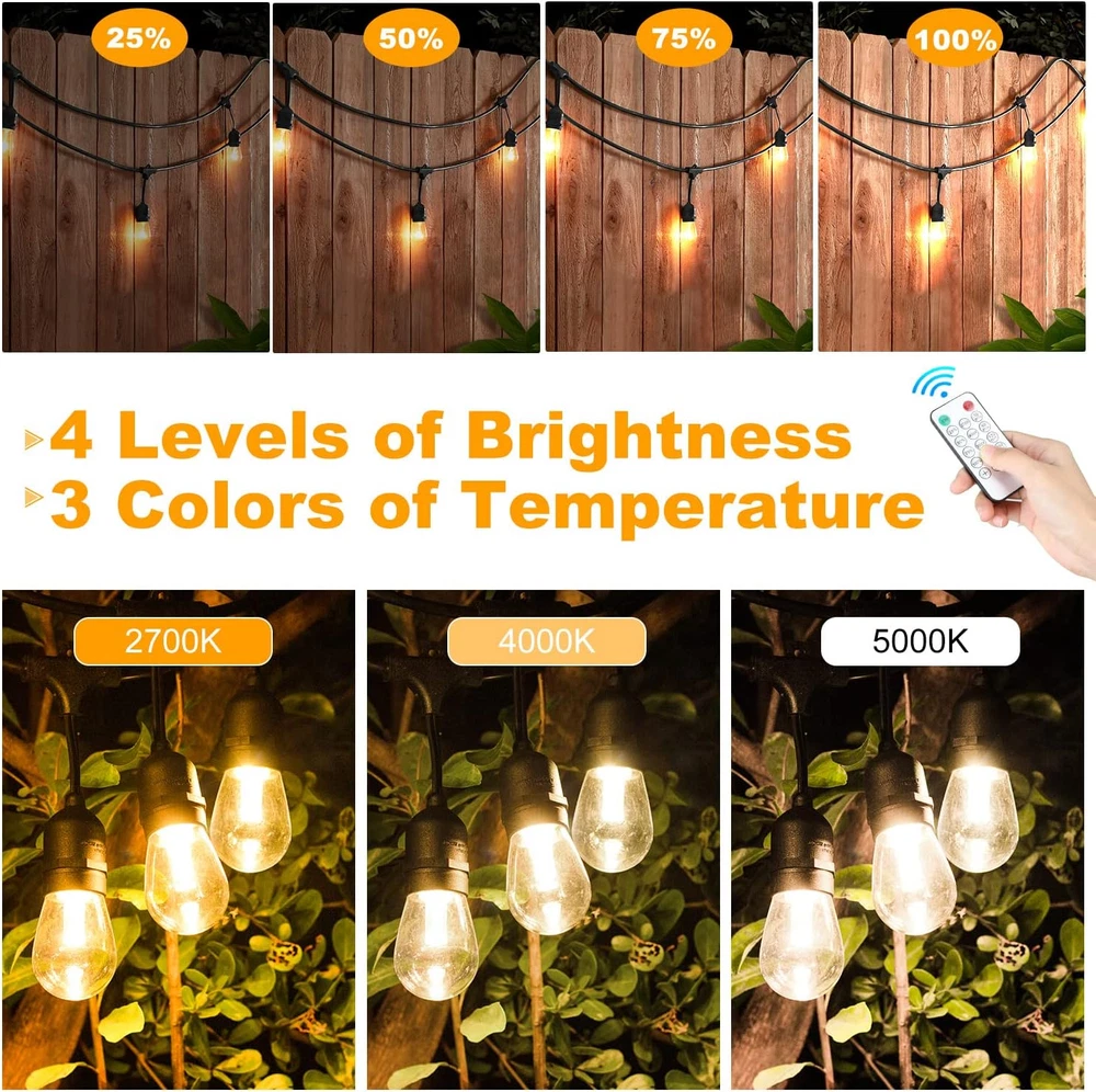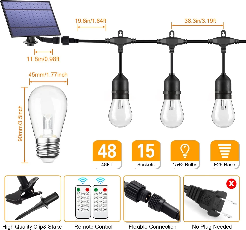 3 Color In 1 Solar String Lights Waterproof Dimmable 48 Ft Remote LED Patio New 3-Color in 1 Solar String Lights Outdoor Waterproof Dimmable, 48ft Remote LED Patio Lights,15 Hanging Sockets Shatterproof Light for Backyard Product Description: Transform your outdoor space with these 48-ft Solar String Lights. Featuring 3 colors in 1, dimmable settings, and a waterproof design, these LED lights provide the perfect ambiance for patios, gardens, and more, all controlled via a convenient remote. Features: 3 Colors in 1: Choose between warm white, cool white, or multicolor to create the perfect atmosphere for any occasion. Dimmable: Adjust the brightness to your desired level for a custom lighting experience. 48 Ft Length: Provides ample coverage for large outdoor areas like patios, decks, gardens, or balconies. Solar Powered: Eco-friendly and energy-efficient, these lights are powered by solar energy for hassle-free operation. Waterproof Design: Built to withstand the elements, making them ideal for outdoor use year-round. Remote Control: Convenient remote lets you control the lights from a distance, adjusting settings with ease. Easy Installation: Simple to hang or drape, with no wiring required for quick setup. Durable LED Bulbs: Long-lasting and energy-efficient LED bulbs for consistent and bright lighting. Perfect for adding a festive touch to your outdoor spaces or creating a cozy, inviting atmosphere for gatherings and events. Item model number YGM-S14-15S Light Source Type LED Style Antique / Modern / Classic / Traditional / Commercial / Vintage Number of Items 1 Power Source Solar Powered Number of Light Sources 15 Control Method Remote Theme Space, Lantern, Christmas, Halloween, Thanksgiving Style Number YGM-S14-15S Controller Type Remote Control Occasion Type Engagement, Wedding, Anniversary, Birthday, Seasons, Winter Holidays Seasons All Seasons Number of Batteries 3 AAA batteries required. (included) Additional Features Remote Controlled, Energy Efficient, Dimmable, Waterproof, Shatterproof Package Dimensions 10.31 x 9.29 x 6.54 inches; 5.09 Pounds Indoor/Outdoor Usage Outdoor Material Type Plastic Light Color Yellow, White (Warm White, Nature White, Daylight White) Water Resistance Level Waterproof Item Weight 5.1 Pounds Occasion Engagement, Wedding, Anniversary, Birthday, Seasons, Winter Holidays Special Feature Remote Controlled, Energy Efficient, Dimmable, Waterproof, Shatterproof Bulb Base E26 Bulb Shape Size S14 Color Black Wattage 3.5 watts Indoor Outdoor Usage Outdoor Batteries 3 AAA batteries required. (included) Voltage 5 Volts Included Components 2 * Remote, 1 * User Guide, 1 * 48FT Solar String Lights, 18 * E26 S14 LED Bulbs (3 Spares), 1* Solar Panel with Clip & Stake Style Name Antique / Modern / Classic / Traditional / Commercial / Vintage Size 48FT Shipping Fast shipping is very important for us. Our standard USA shipping service is FREE. Your order will be shipped within 1-2 business days upon full payment received. Your order will be delivered within 1-3 business days after the handling time. We only ship to the confirmed address. We reserve the right to cancel any order for any reason at any time. We are not responsible for undeliverable addresses. Returns and payment We offer a 30 days return policy from checkout winning date. FeedBack Your feedback very important to us, after you get your package and you are satisfied with our service please leave us positive feedback If you have any problem with your order / any questions please before leave any type of feedback For any questions, using eBay contact system Please visit our eBay store to check out other items for sale! Thank you for shopping at our store.